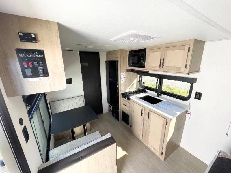 Each one of these Forest River Cherokee Wolf Pup Black Label travel trailers are lightweight and easy to tow! They are fully self contained with ample tank capacities, an abundance of storage space, and filled with at home amenities. The aerodynamic smooth radius front profile, the Power Gear frame technology, and the space saver rail design make them easier to maneuver. You will also appreciate the seamless roofing membrane with heat reflectivity to keep the sun from making your unit a hot box. The tongue and groove plywood flooring will hold up for years of fun and the USB charging stations help to keep your electronics at 100% while you're away. The Black Label Package includes a frameless window package, hung fiberglass gel coat sided walls, thermo-foil arctic insulation, and more!