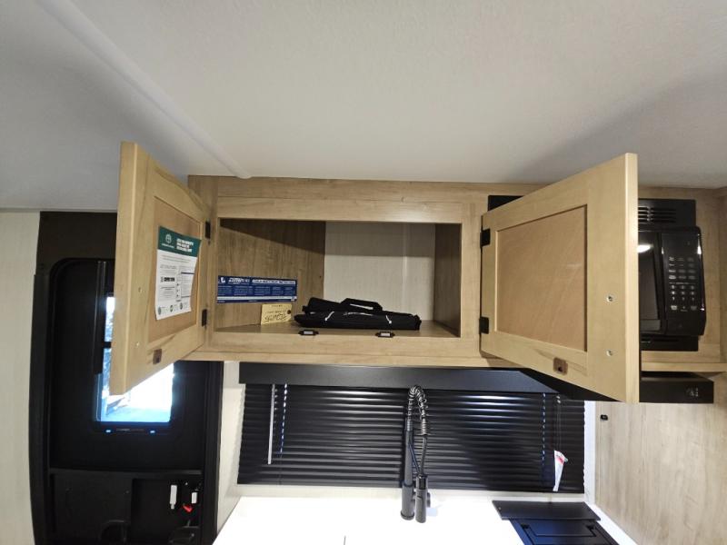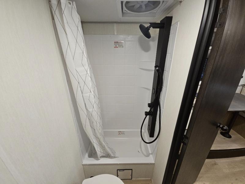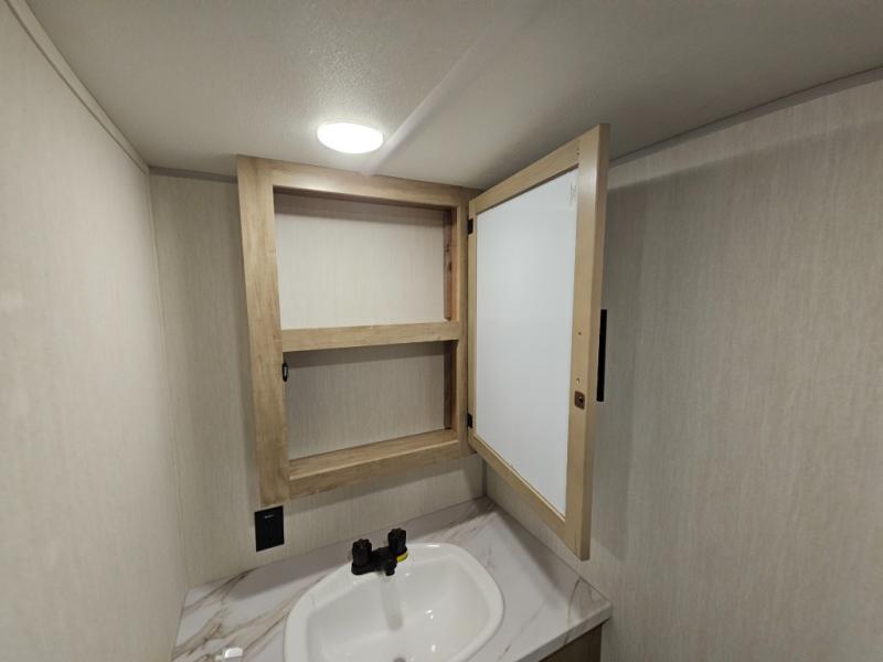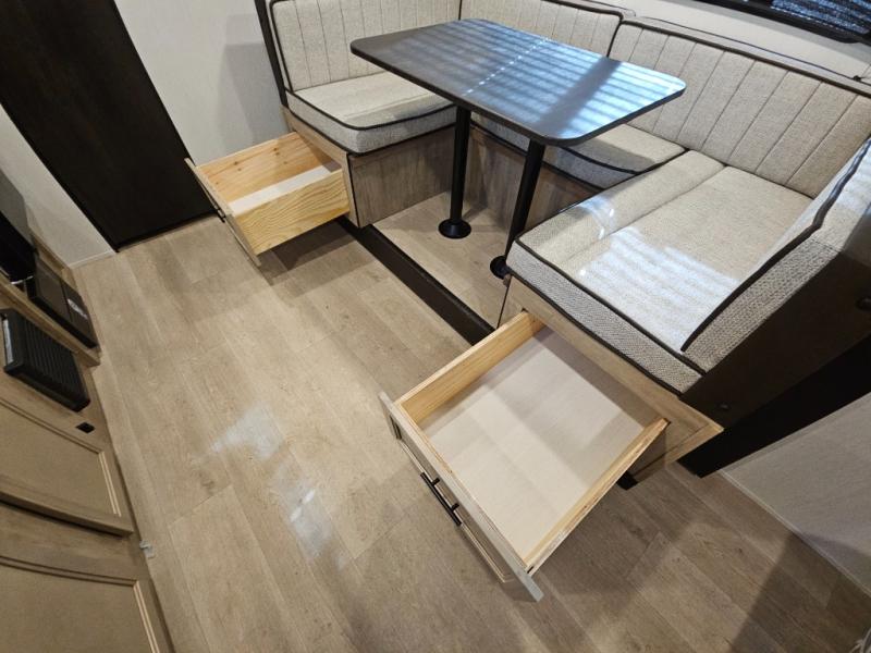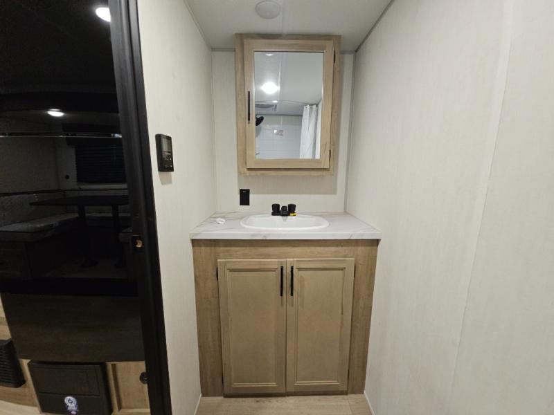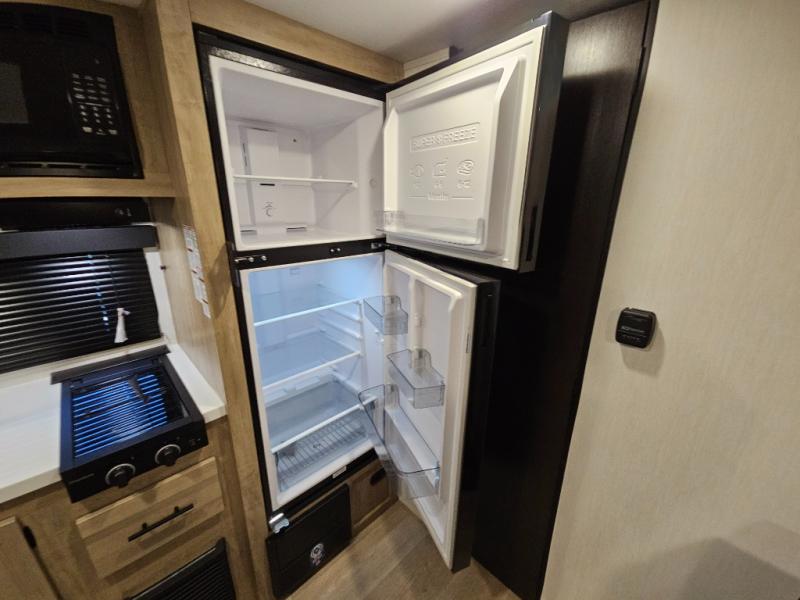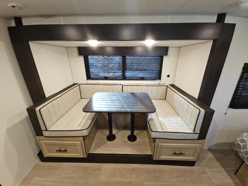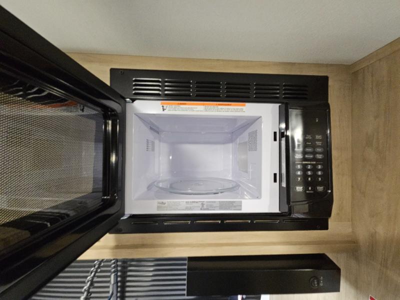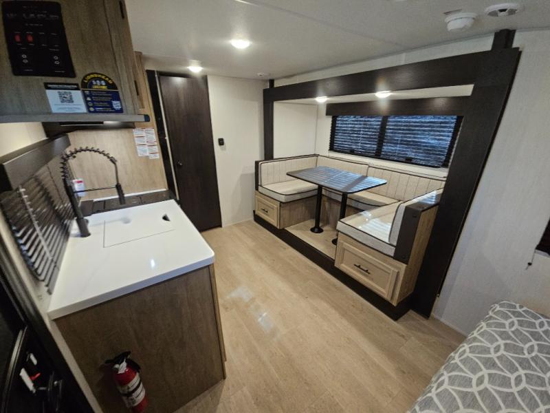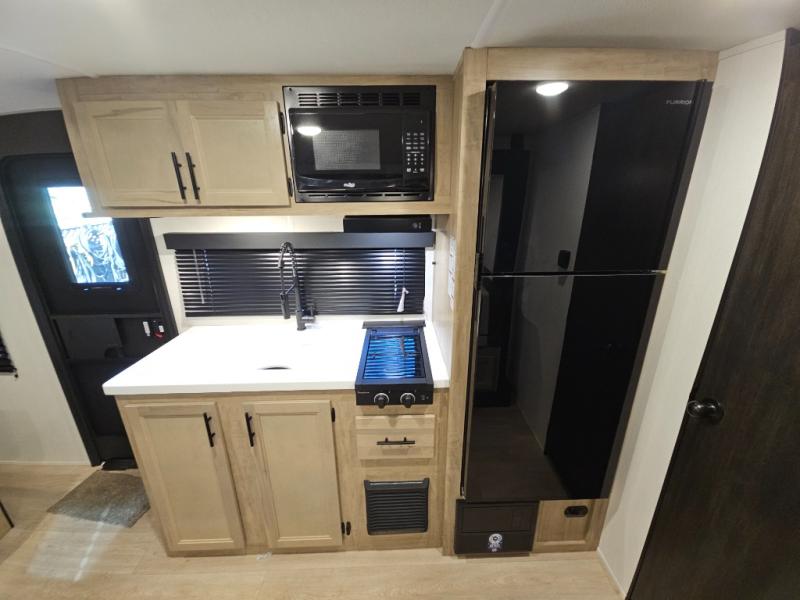 This travel trailer is perfect for a small family or group to enjoy since there is a front queen bed for you and a U-shaped dinette for guests. The kitchen provides a microwave oven, round single bowl sink, a range for cooking, and a refrigerator to keep all of your perishables fresh. The rear bath features a tub/shower, toilet, and vanity with a sink, plus a medicine cabinet to keep things tidy.