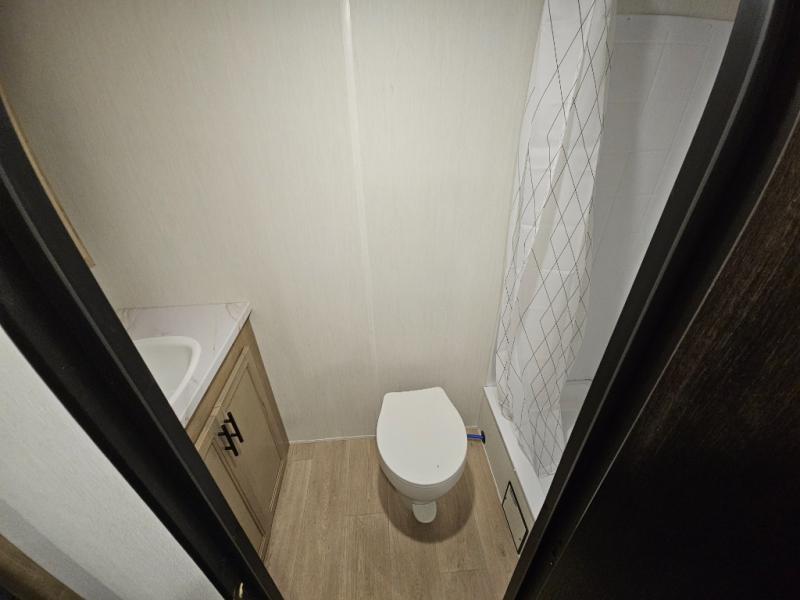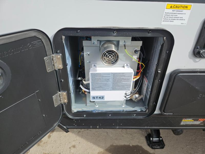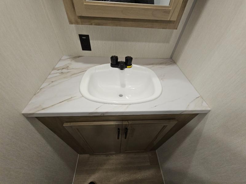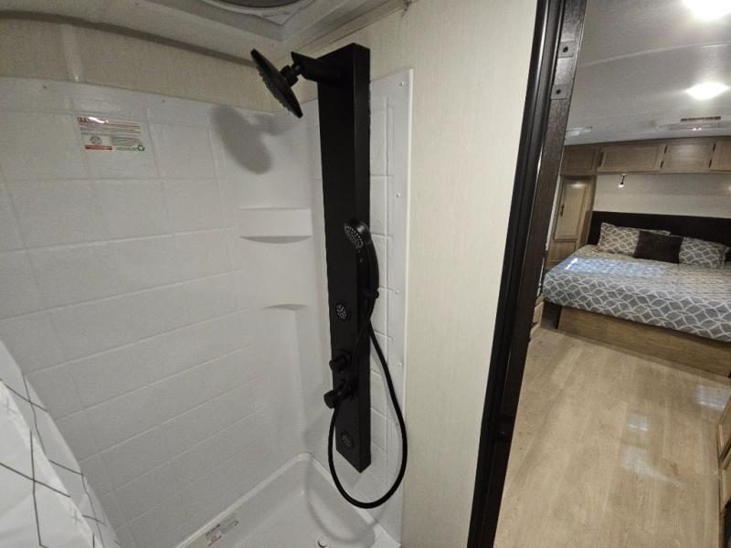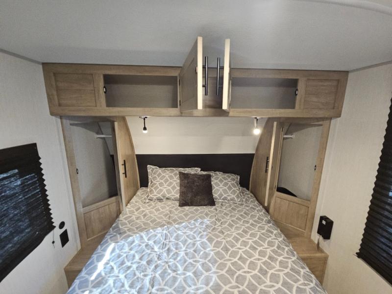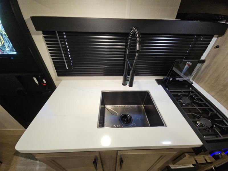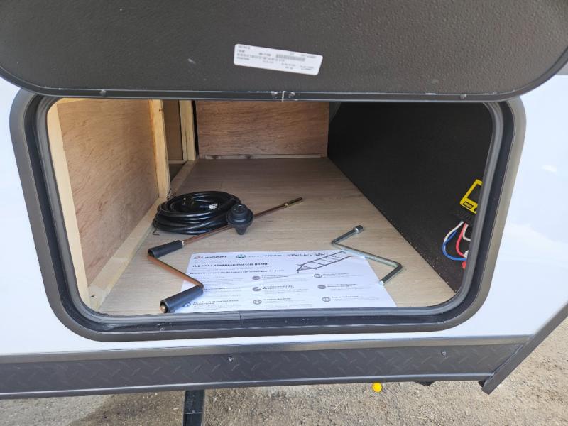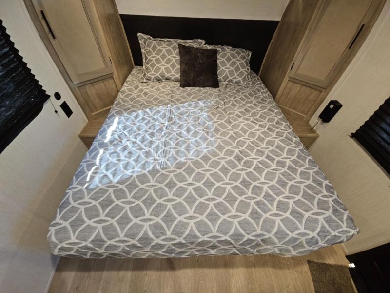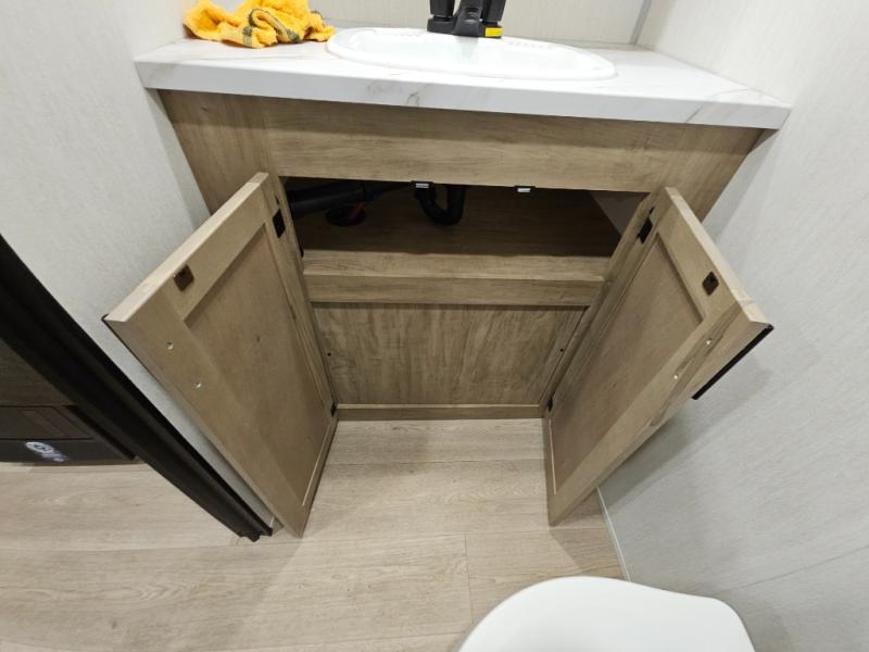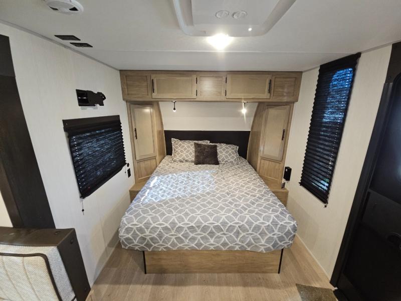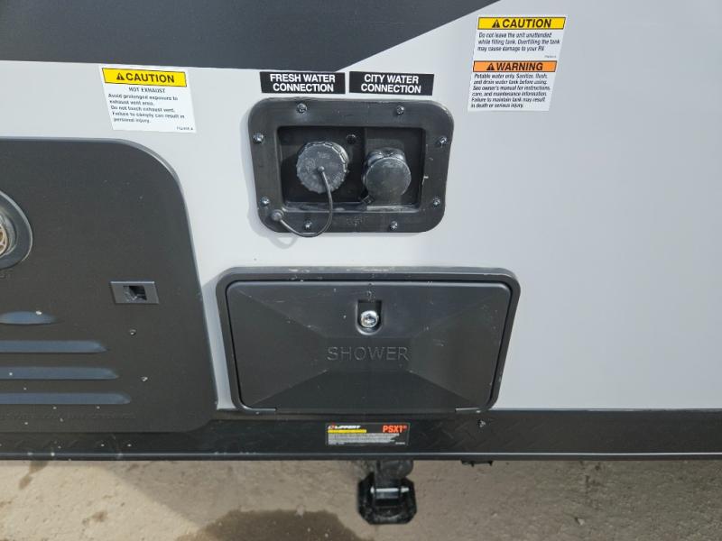 This travel trailer is perfect for a small family or group to enjoy since there is a front queen bed for you and a U-shaped dinette for guests. The kitchen provides a microwave oven, round single bowl sink, a range for cooking, and a refrigerator to keep all of your perishables fresh. The rear bath features a tub/shower, toilet, and vanity with a sink, plus a medicine cabinet to keep things tidy.