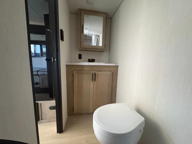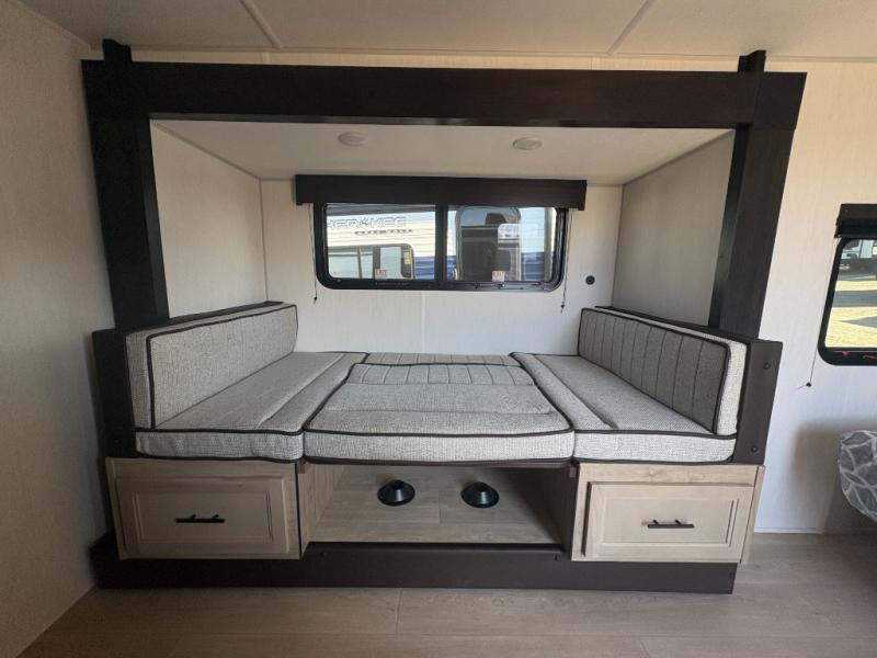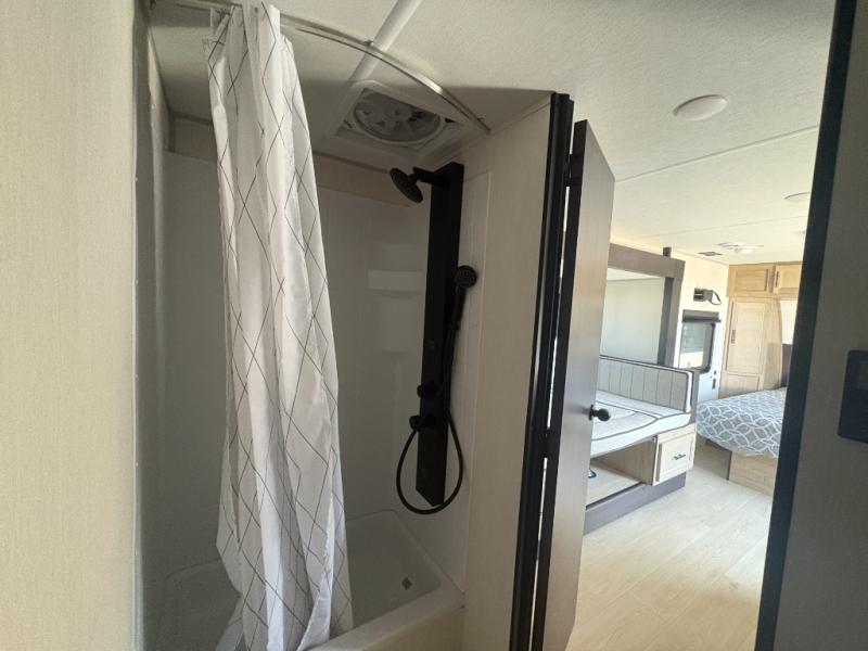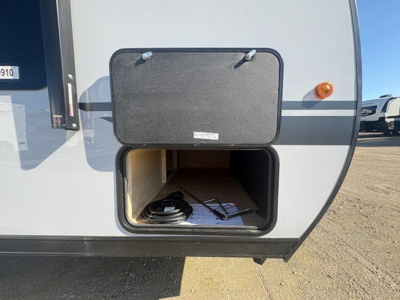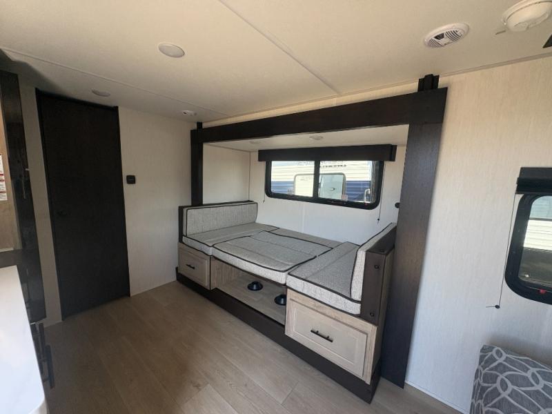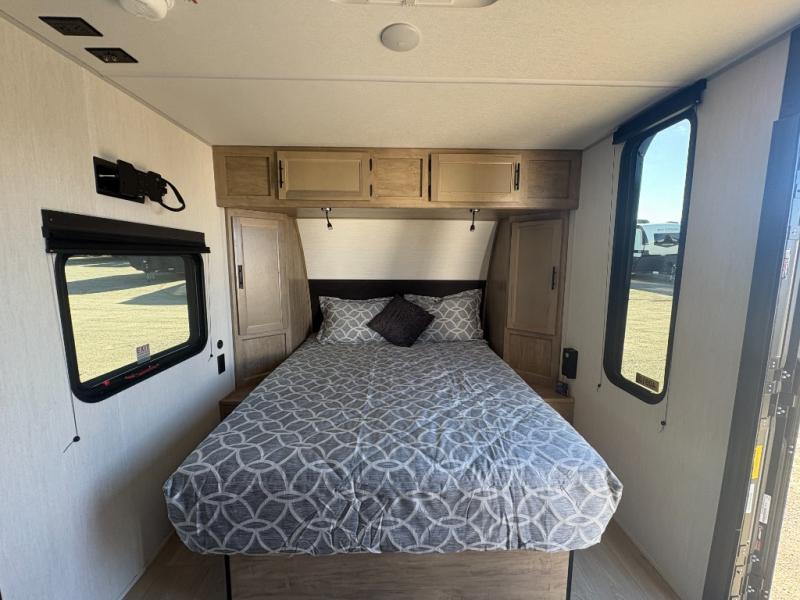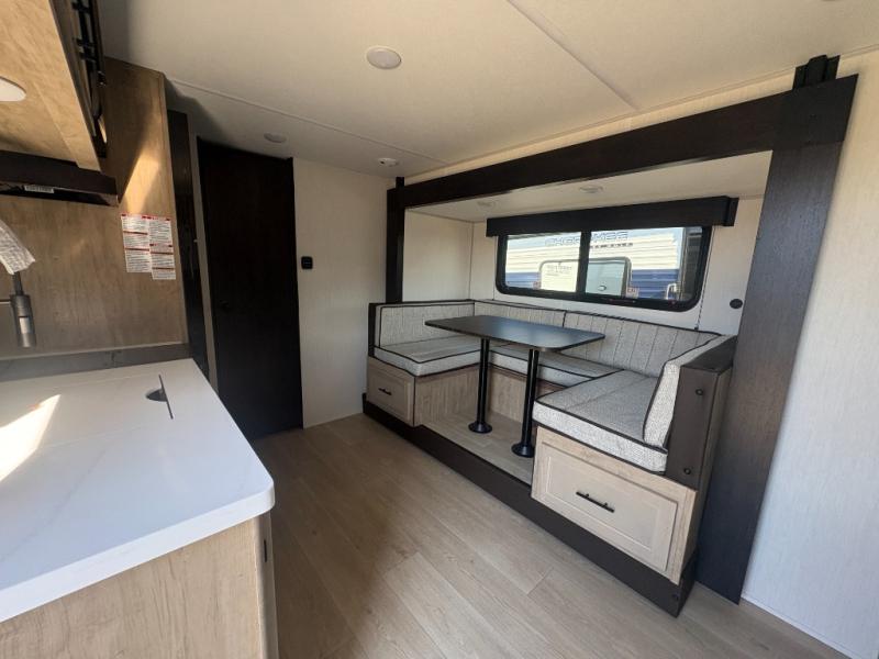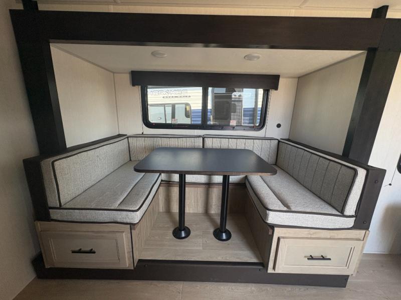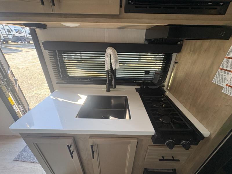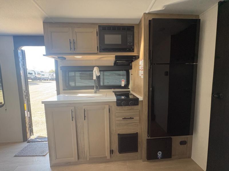 This travel trailer is perfect for a small family or group to enjoy since there is a front queen bed for you and a U-shaped dinette for guests. The kitchen provides a microwave oven, round single bowl sink, a range for cooking, and a refrigerator to keep all of your perishables fresh. The rear bath features a tub/shower, toilet, and vanity with a sink, plus a medicine cabinet to keep things tidy.