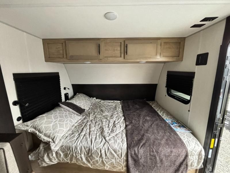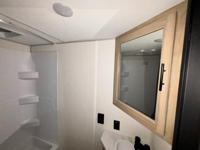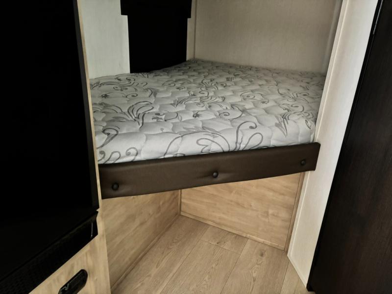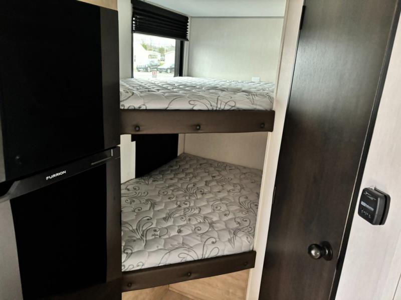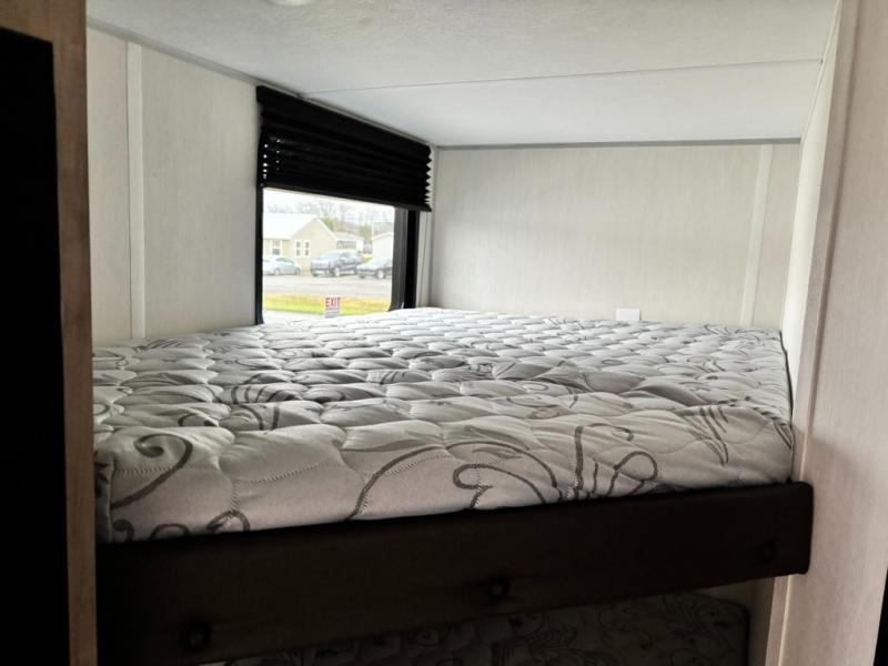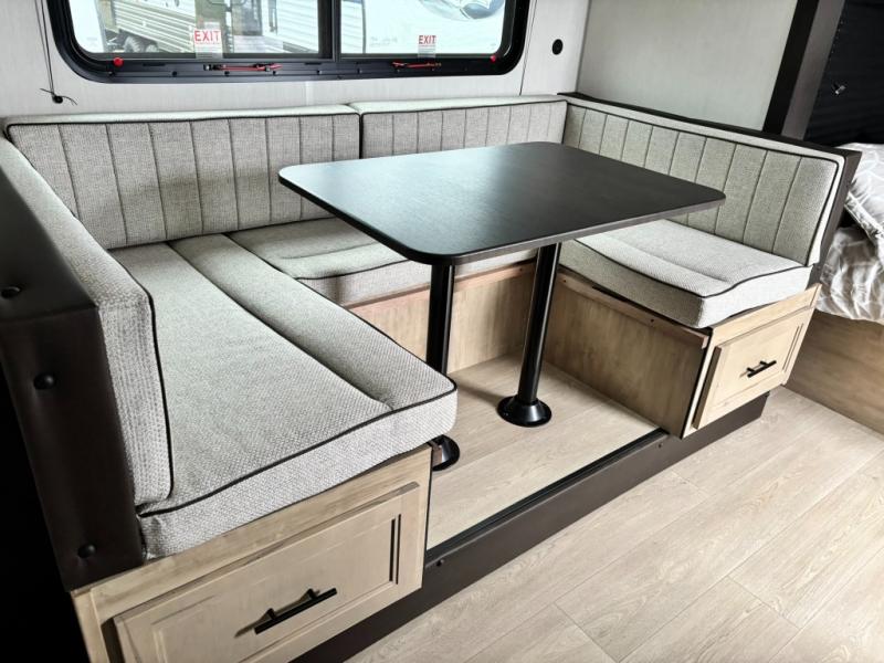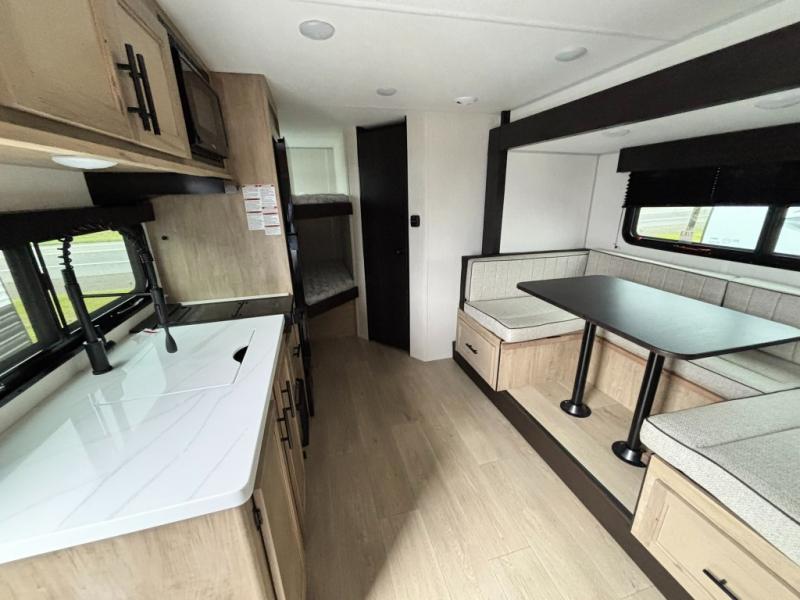 This family travel trailer is ready to head to the campground whenever you are! The kiddos can sleep on the set of double-size bed bunks and you can sleep on the front queen bed, plus the U-shaped dinette slide can also transform into an extra sleeping space when you aren't using it to enjoy a meal. You can prepare your delicious meals on the flushmount range or at the outside mini kitchen and stay protected by the power awning. The exterior not only has outside storage and an outside TV mount, but also features an outside storage plus door for access to the storage space underneath the bottom bunk bed. The rear corner bath allows everyone to stay clean and refreshed while you camp.