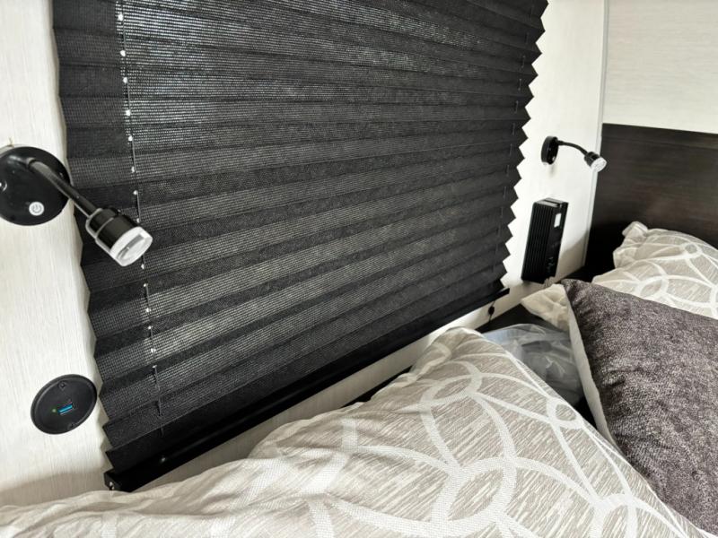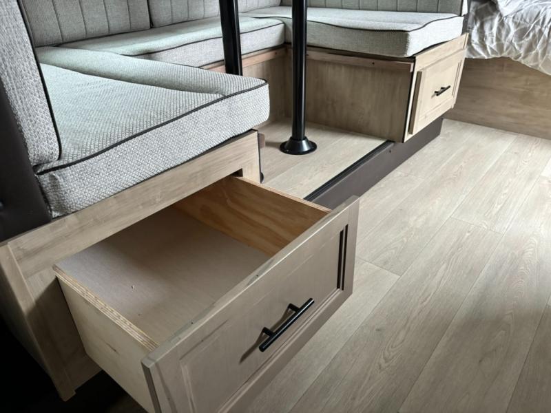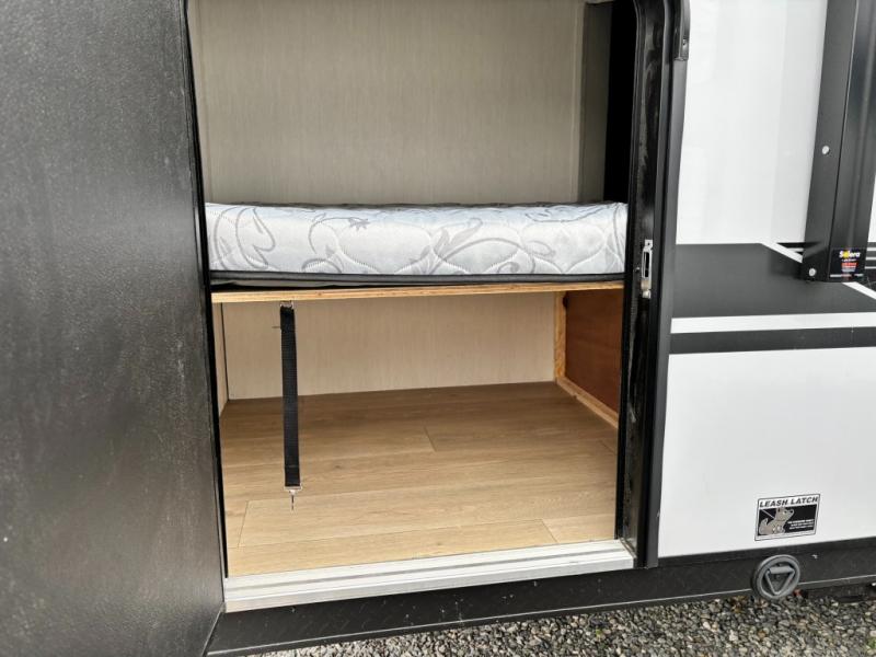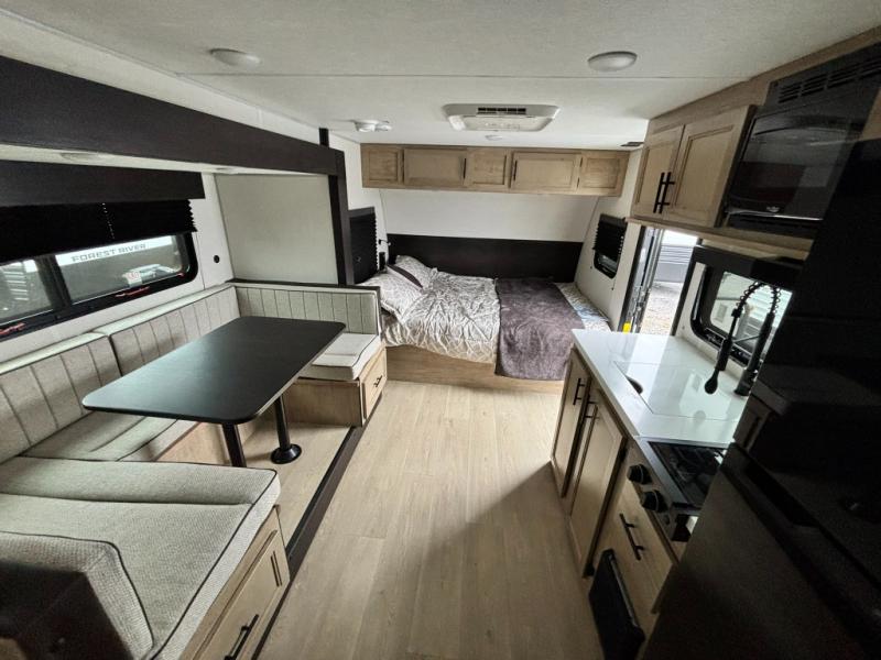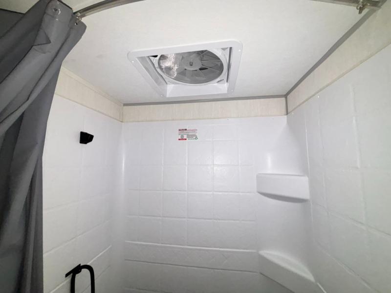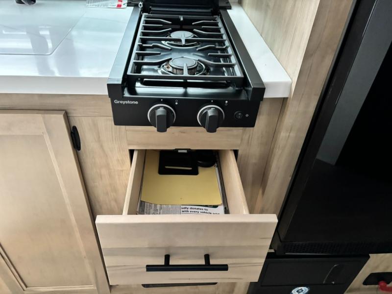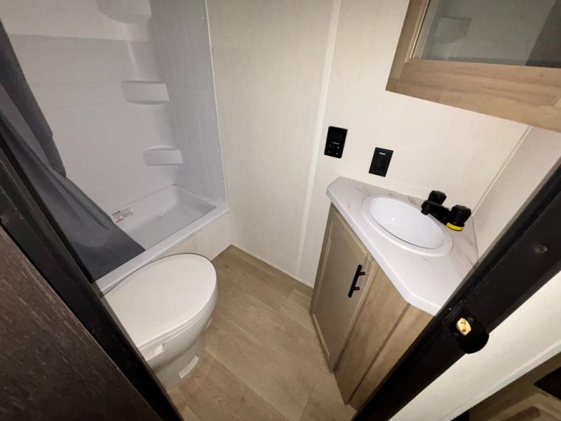 This family travel trailer is ready to head to the campground whenever you are! The kiddos can sleep on the set of double-size bed bunks and you can sleep on the front queen bed, plus the U-shaped dinette slide can also transform into an extra sleeping space when you aren't using it to enjoy a meal. You can prepare your delicious meals on the flushmount range or at the outside mini kitchen and stay protected by the power awning. The exterior not only has outside storage and an outside TV mount, but also features an outside storage plus door for access to the storage space underneath the bottom bunk bed. The rear corner bath allows everyone to stay clean and refreshed while you camp.