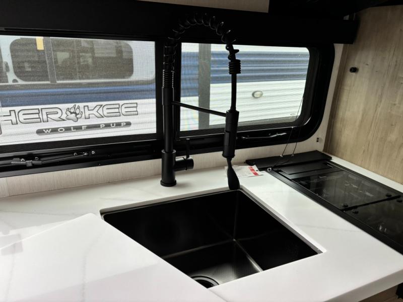 Each one of these Forest River Cherokee Wolf Pup Black Label travel trailers are lightweight and easy to tow! They are fully self contained with ample tank capacities, an abundance of storage space, and filled with at home amenities. The aerodynamic smooth radius front profile, the Power Gear frame technology, and the space saver rail design make them easier to maneuver. You will also appreciate the seamless roofing membrane with heat reflectivity to keep the sun from making your unit a hot box. The tongue and groove plywood flooring will hold up for years of fun and the USB charging stations help to keep your electronics at 100% while you're away. The Black Label Package includes a frameless window package, hung fiberglass gel coat sided walls, thermo-foil arctic insulation, and more!