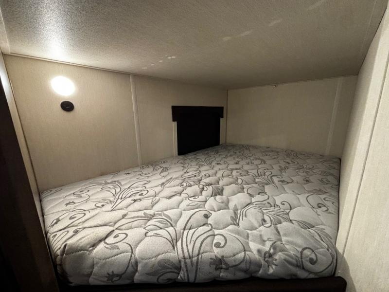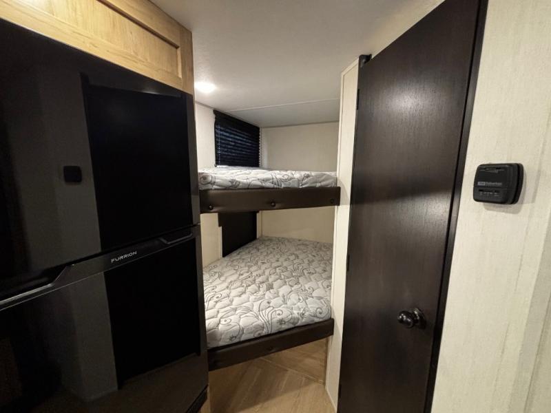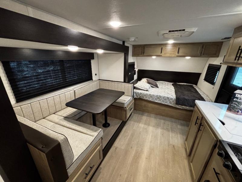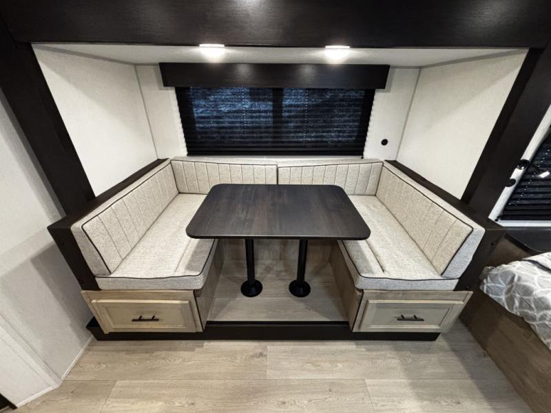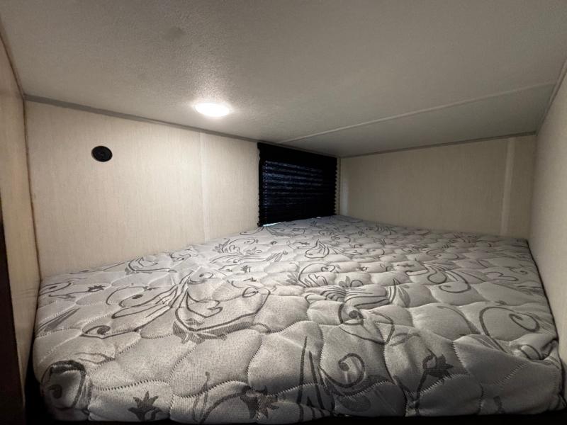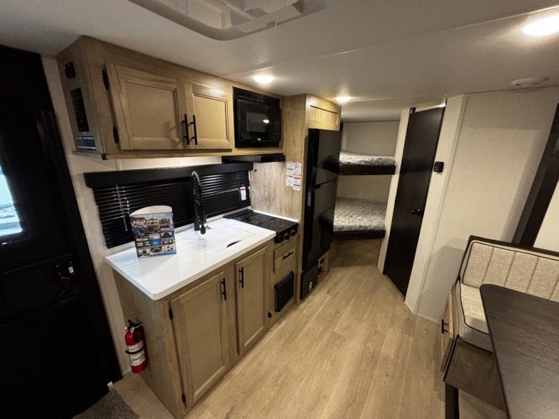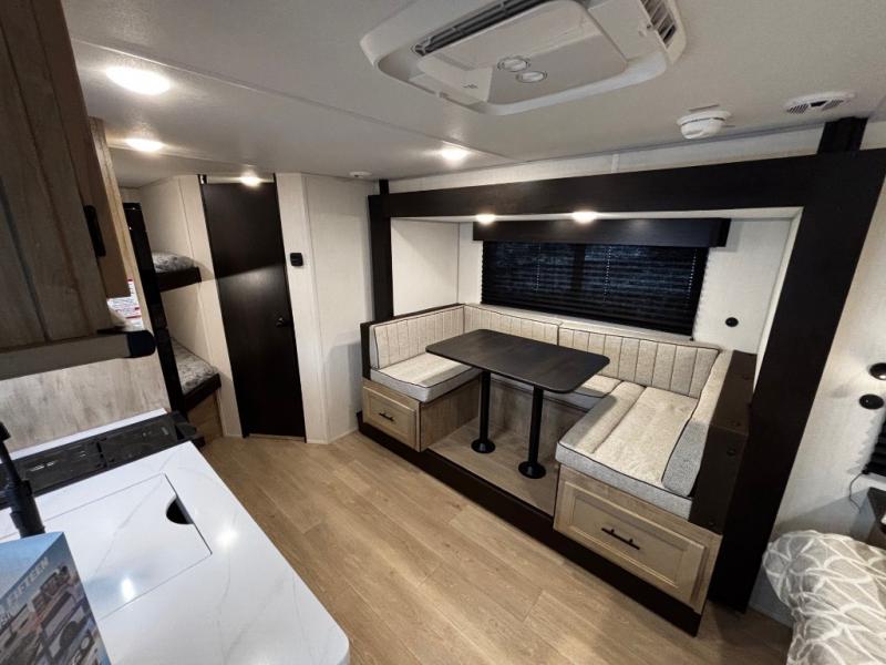 This family travel trailer is ready to head to the campground whenever you are! The kiddos can sleep on the set of double-size bed bunks and you can sleep on the front queen bed, plus the U-shaped dinette slide can also transform into an extra sleeping space when you aren't using it to enjoy a meal. You can prepare your delicious meals on the flushmount range or at the outside mini kitchen and stay protected by the power awning. The exterior not only has outside storage and an outside TV mount, but also features an outside storage plus door for access to the storage space underneath the bottom bunk bed. The rear corner bath allows everyone to stay clean and refreshed while you camp.