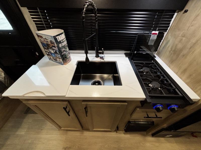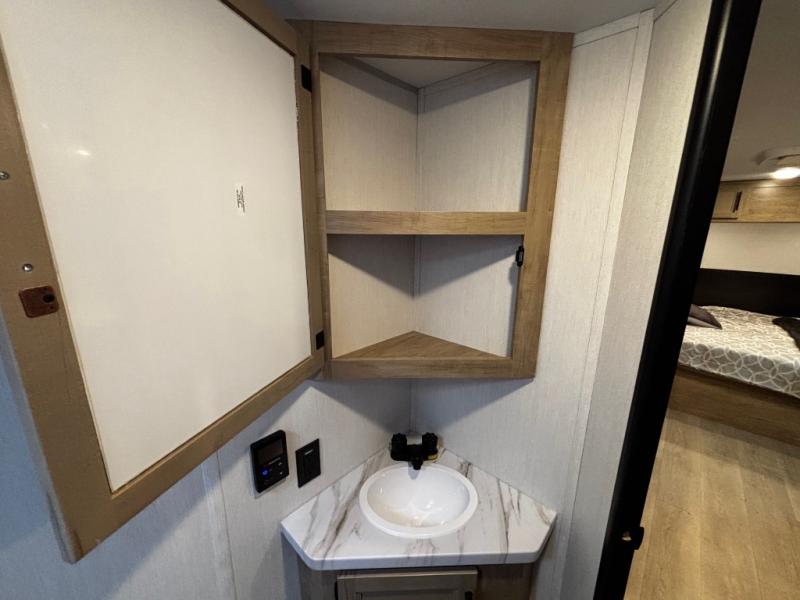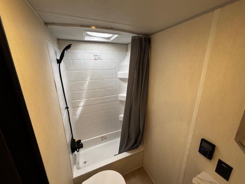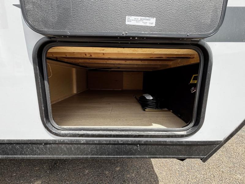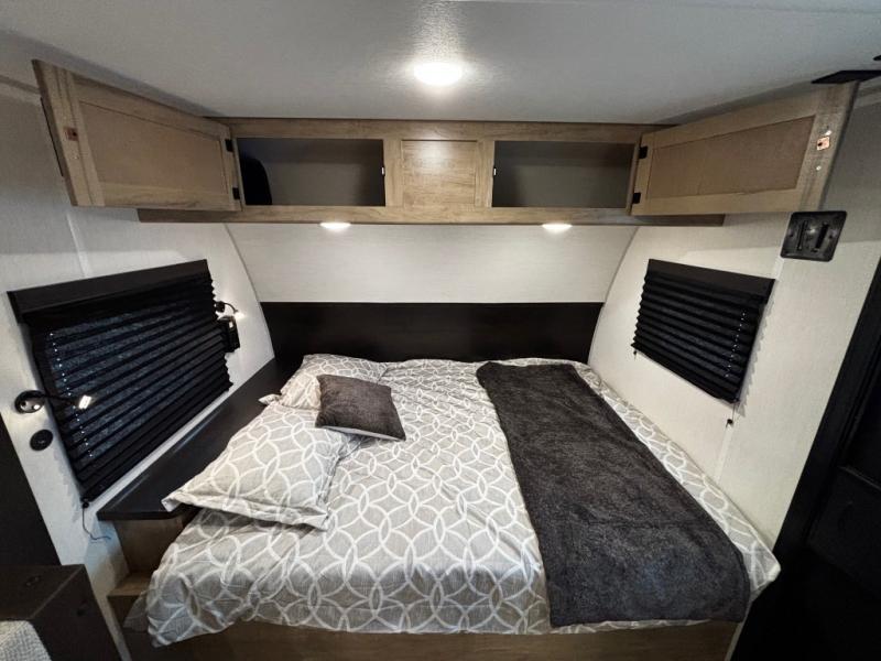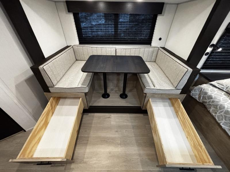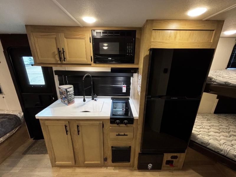 This family travel trailer is ready to head to the campground whenever you are! The kiddos can sleep on the set of double-size bed bunks and you can sleep on the front queen bed, plus the U-shaped dinette slide can also transform into an extra sleeping space when you aren't using it to enjoy a meal. You can prepare your delicious meals on the flushmount range or at the outside mini kitchen and stay protected by the power awning. The exterior not only has outside storage and an outside TV mount, but also features an outside storage plus door for access to the storage space underneath the bottom bunk bed. The rear corner bath allows everyone to stay clean and refreshed while you camp.