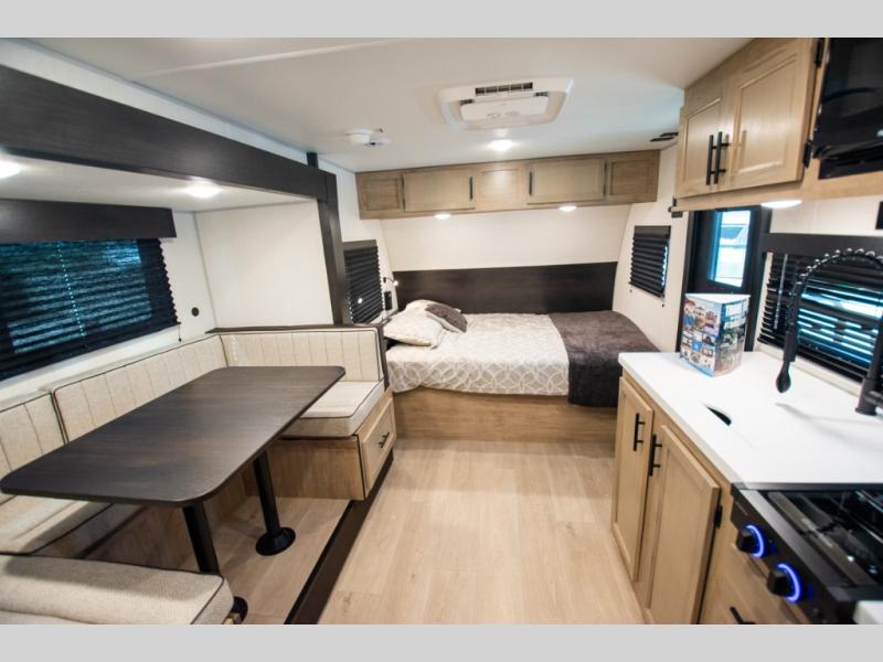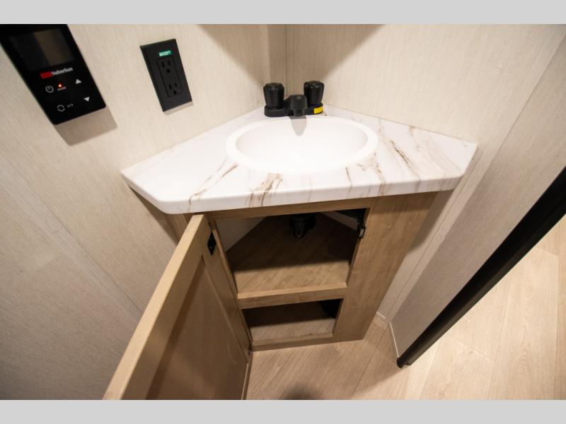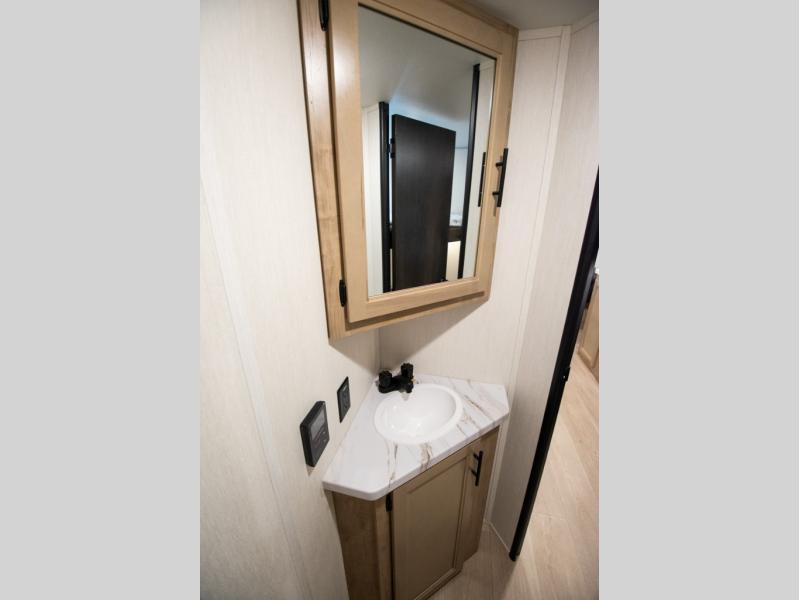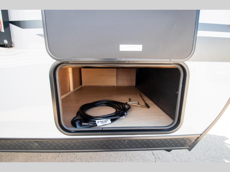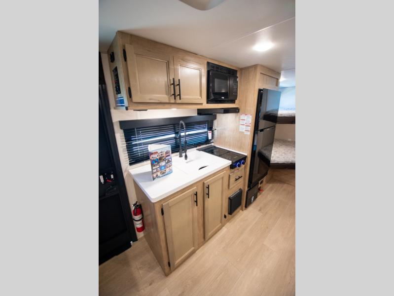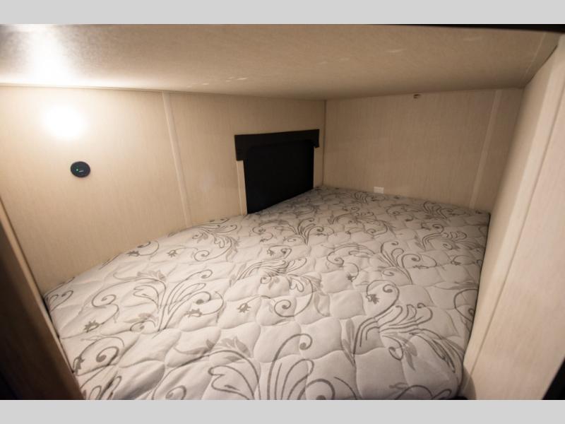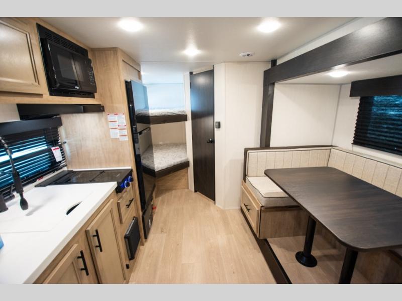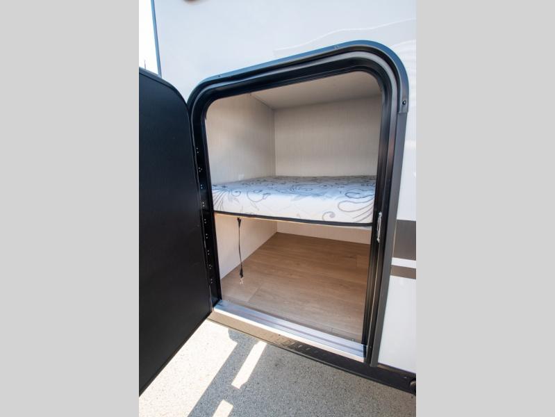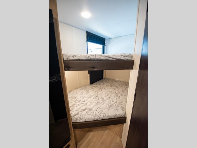 This family travel trailer is ready to head to the campground whenever you are! The kiddos can sleep on the set of double-size bed bunks and you can sleep on the front queen bed, plus the U-shaped dinette slide can also transform into an extra sleeping space when you aren't using it to enjoy a meal. You can prepare your delicious meals on the flushmount range or at the outside mini kitchen and stay protected by the power awning. The exterior not only has outside storage and an outside TV mount, but also features an outside storage plus door for access to the storage space underneath the bottom bunk bed. The rear corner bath allows everyone to stay clean and refreshed while you camp.