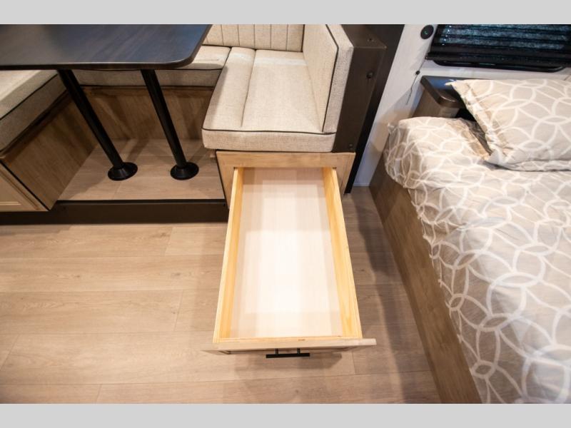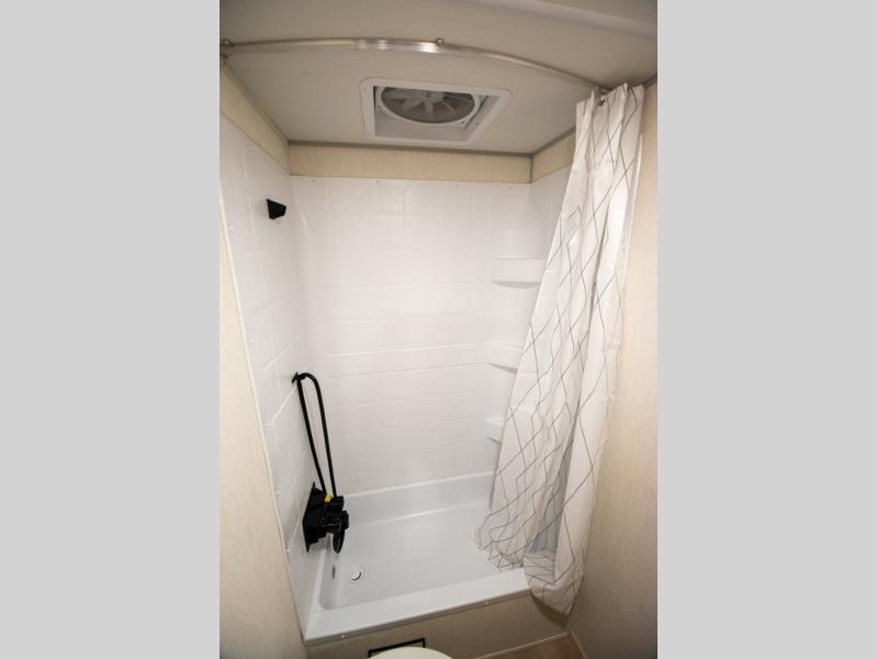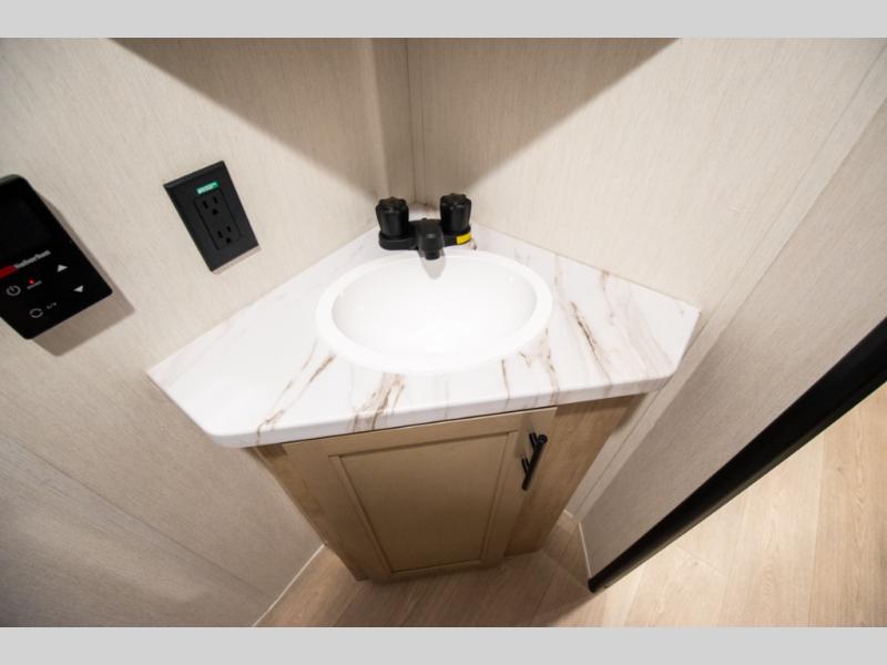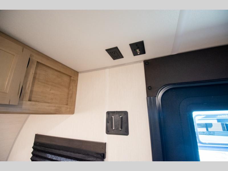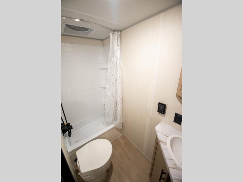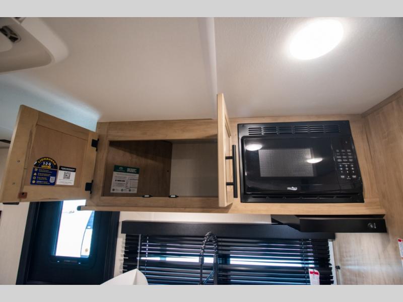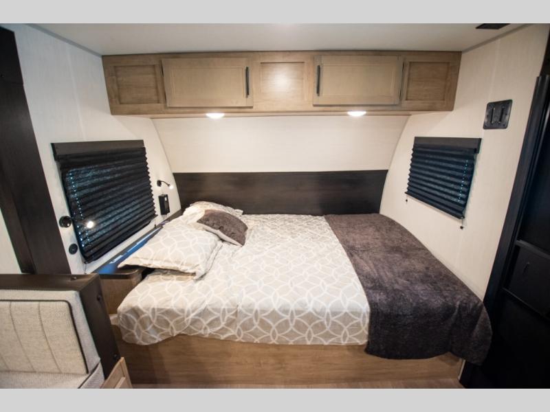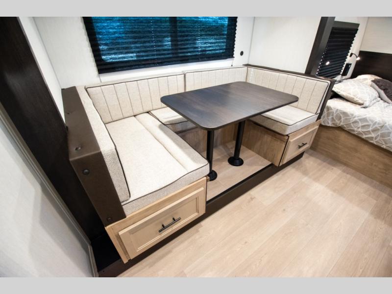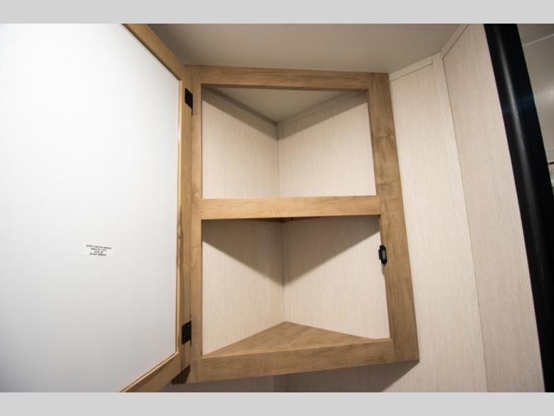 This family travel trailer is ready to head to the campground whenever you are! The kiddos can sleep on the set of double-size bed bunks and you can sleep on the front queen bed, plus the U-shaped dinette slide can also transform into an extra sleeping space when you aren't using it to enjoy a meal. You can prepare your delicious meals on the flushmount range or at the outside mini kitchen and stay protected by the power awning. The exterior not only has outside storage and an outside TV mount, but also features an outside storage plus door for access to the storage space underneath the bottom bunk bed. The rear corner bath allows everyone to stay clean and refreshed while you camp.