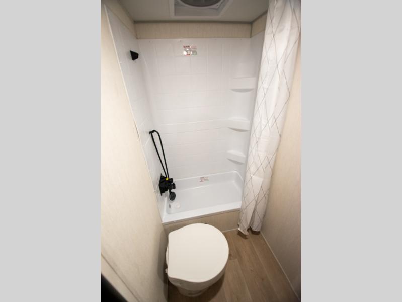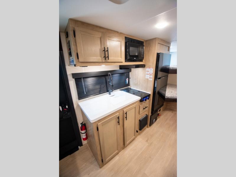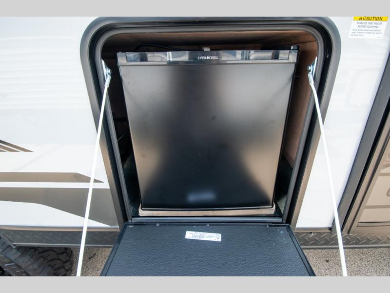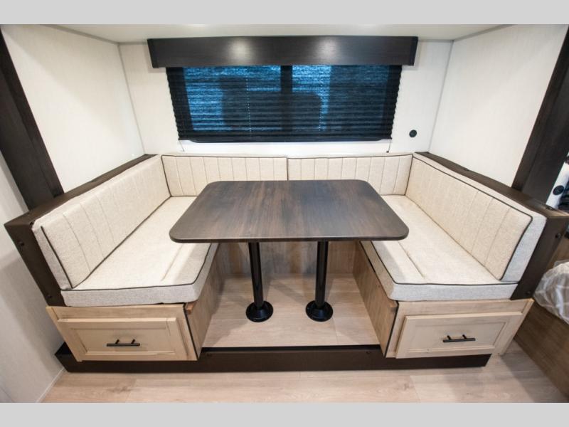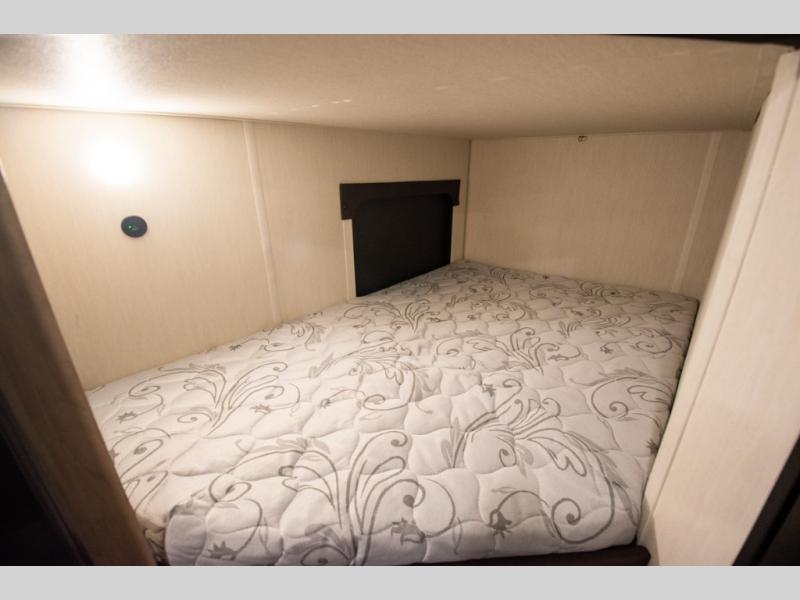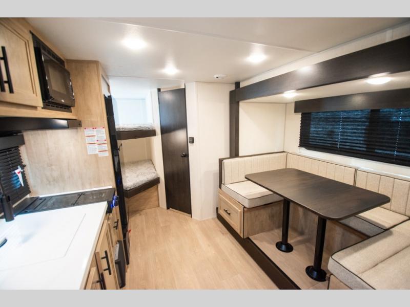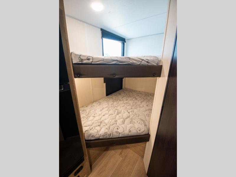 This family travel trailer is ready to head to the campground whenever you are! The kiddos can sleep on the set of double-size bed bunks and you can sleep on the front queen bed, plus the U-shaped dinette slide can also transform into an extra sleeping space when you aren't using it to enjoy a meal. You can prepare your delicious meals on the flushmount range or at the outside mini kitchen and stay protected by the power awning. The exterior not only has outside storage and an outside TV mount, but also features an outside storage plus door for access to the storage space underneath the bottom bunk bed. The rear corner bath allows everyone to stay clean and refreshed while you camp.