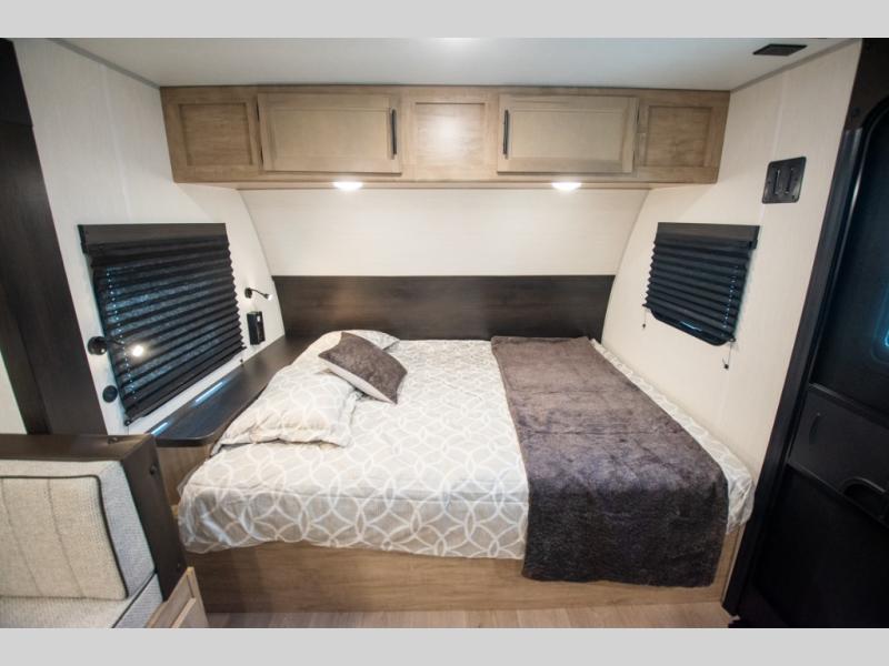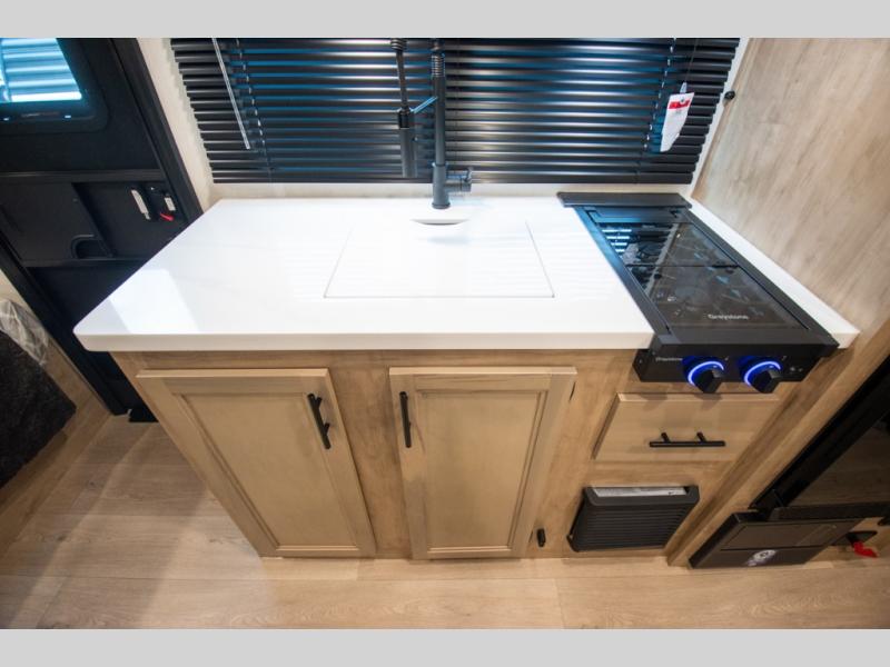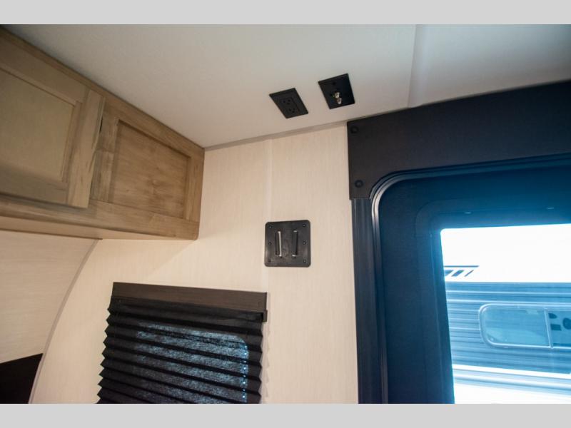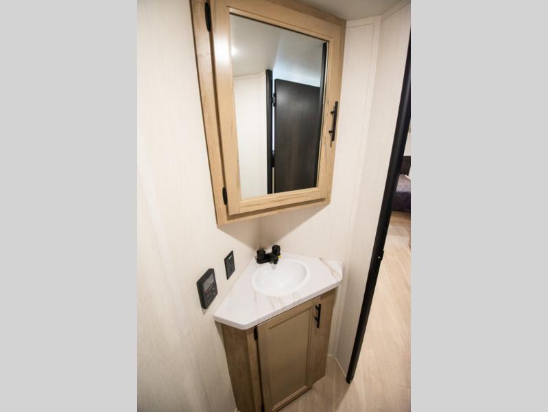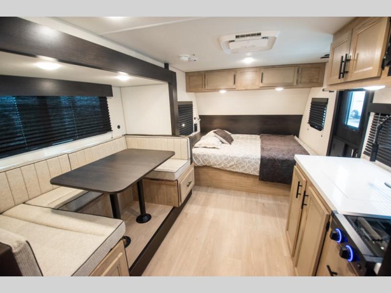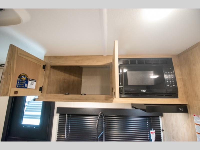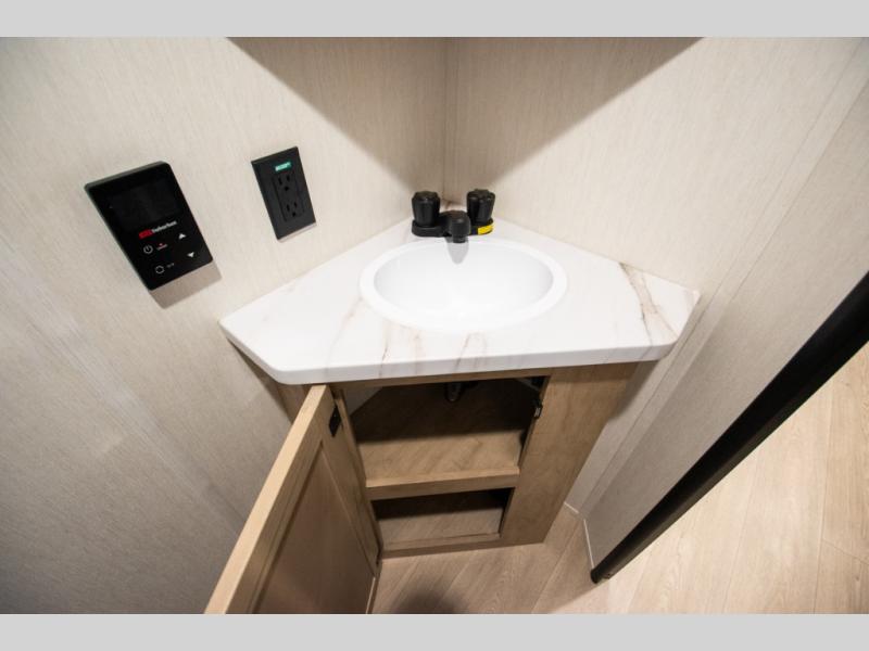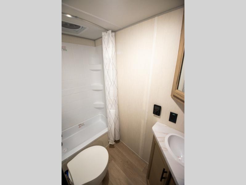 This family travel trailer is ready to head to the campground whenever you are! The kiddos can sleep on the set of double-size bed bunks and you can sleep on the front queen bed, plus the U-shaped dinette slide can also transform into an extra sleeping space when you aren't using it to enjoy a meal. You can prepare your delicious meals on the flushmount range or at the outside mini kitchen and stay protected by the power awning. The exterior not only has outside storage and an outside TV mount, but also features an outside storage plus door for access to the storage space underneath the bottom bunk bed. The rear corner bath allows everyone to stay clean and refreshed while you camp.