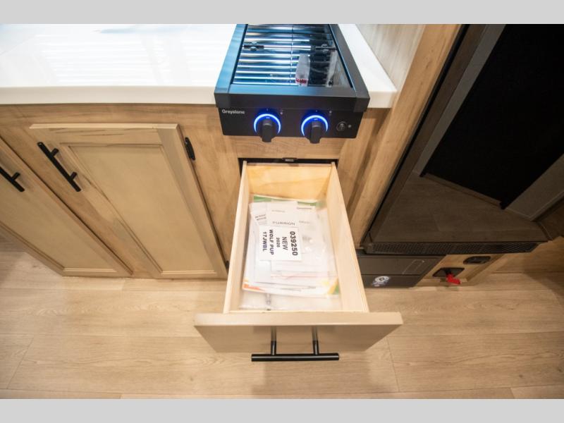 Each one of these Forest River Cherokee Wolf Pup Black Label travel trailers are lightweight and easy to tow! They are fully self contained with ample tank capacities, an abundance of storage space, and filled with at home amenities. The aerodynamic smooth radius front profile, the Power Gear frame technology, and the space saver rail design make them easier to maneuver. You will also appreciate the seamless roofing membrane with heat reflectivity to keep the sun from making your unit a hot box. The tongue and groove plywood flooring will hold up for years of fun and the USB charging stations help to keep your electronics at 100% while you're away. The Black Label Package includes a frameless window package, hung fiberglass gel coat sided walls, thermo-foil arctic insulation, and more!