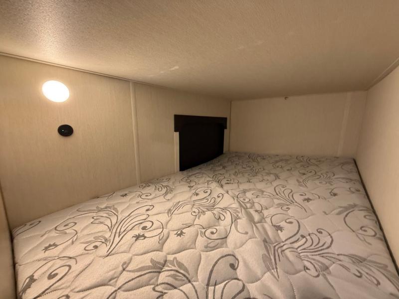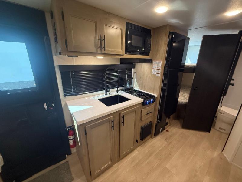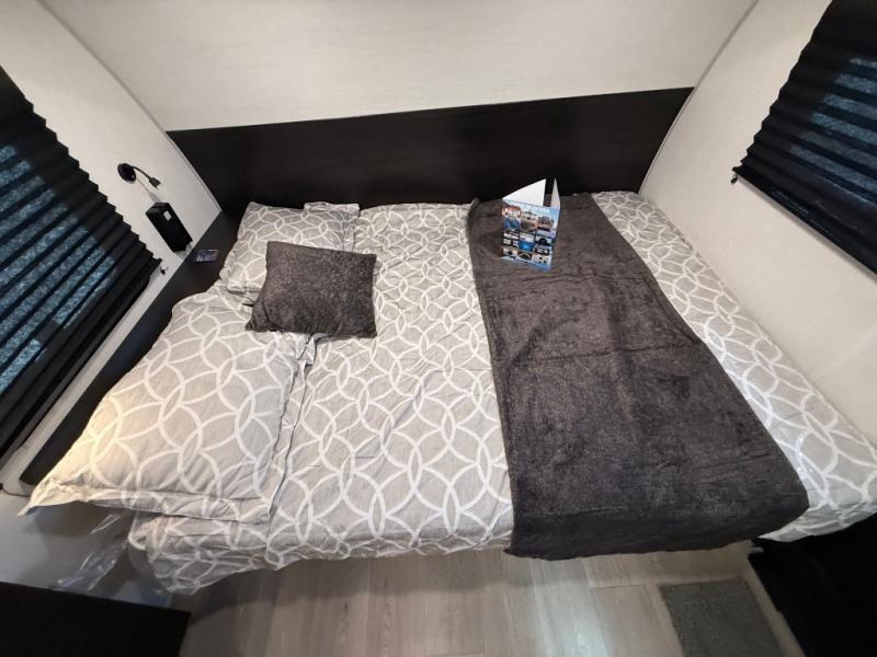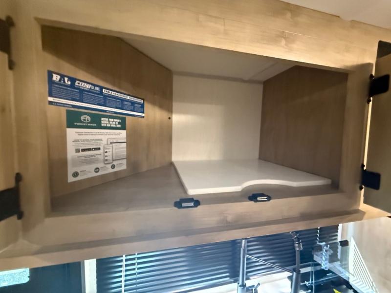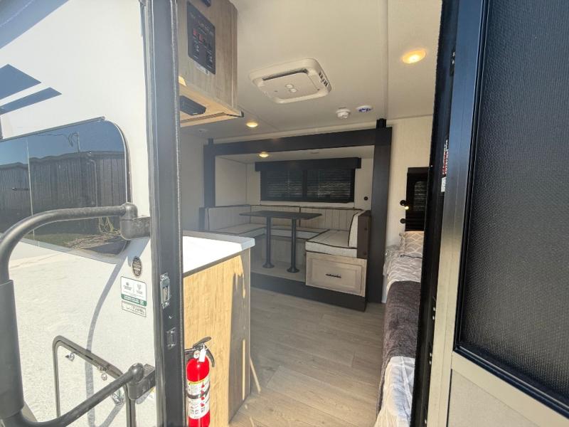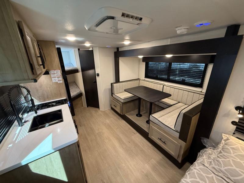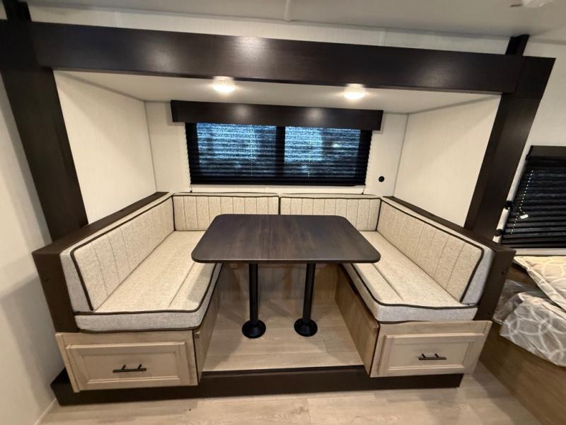 This family travel trailer is ready to head to the campground whenever you are! The kiddos can sleep on the set of double-size bed bunks and you can sleep on the front queen bed, plus the U-shaped dinette slide can also transform into an extra sleeping space when you aren't using it to enjoy a meal. You can prepare your delicious meals on the flushmount range or at the outside mini kitchen and stay protected by the power awning. The exterior not only has outside storage and an outside TV mount, but also features an outside storage plus door for access to the storage space underneath the bottom bunk bed. The rear corner bath allows everyone to stay clean and refreshed while you camp.