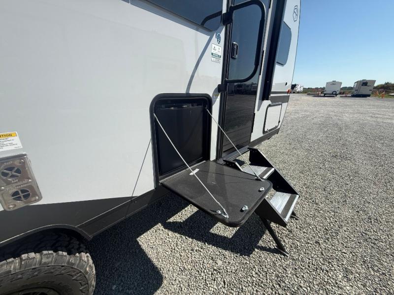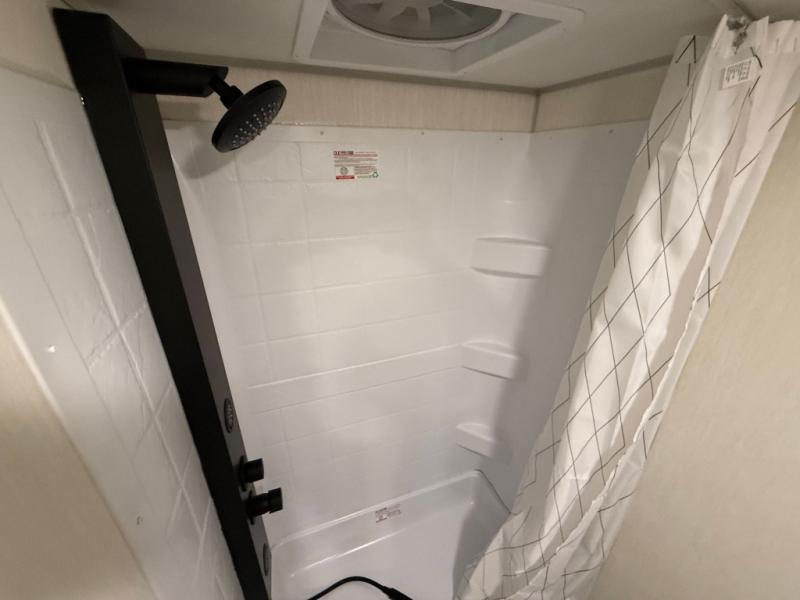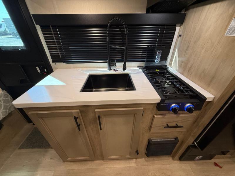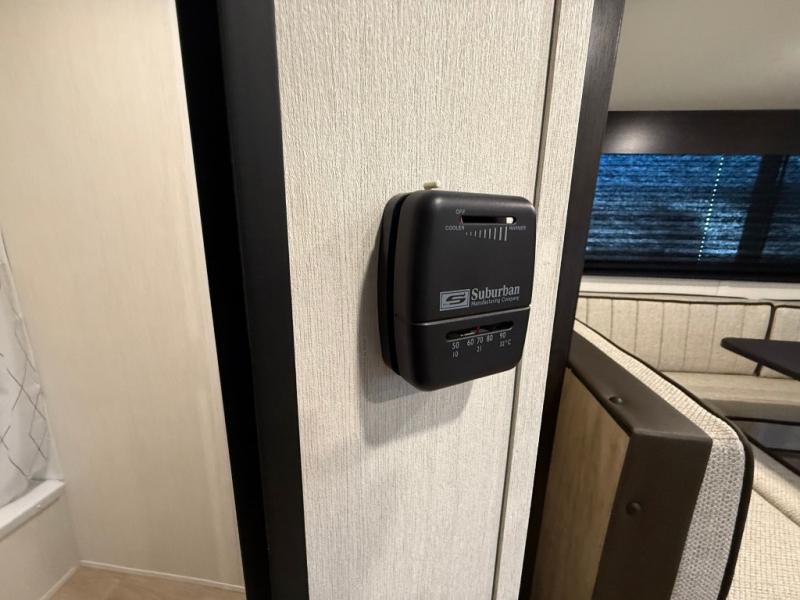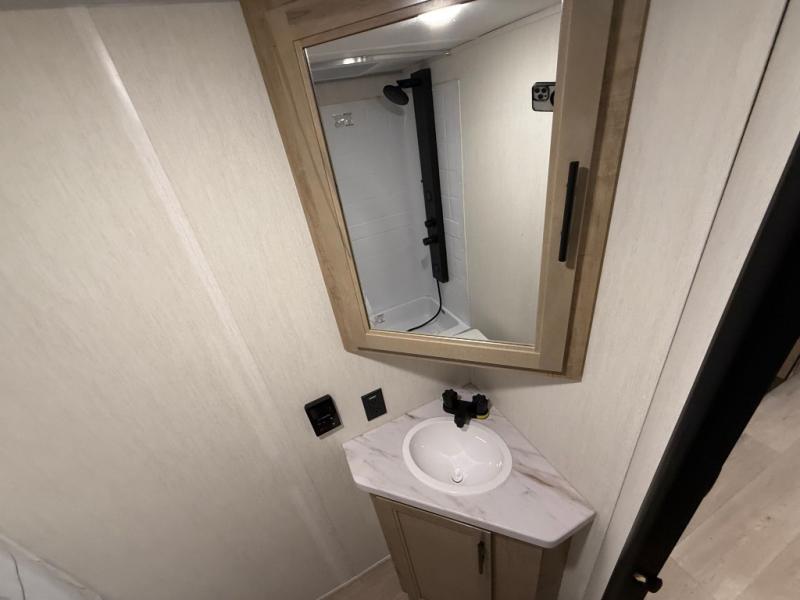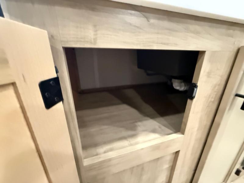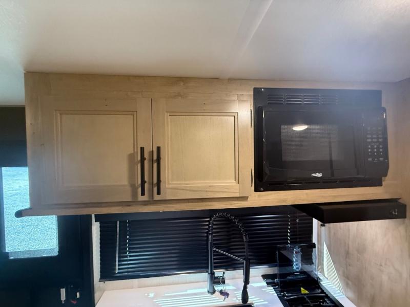 This family travel trailer is ready to head to the campground whenever you are! The kiddos can sleep on the set of double-size bed bunks and you can sleep on the front queen bed, plus the U-shaped dinette slide can also transform into an extra sleeping space when you aren't using it to enjoy a meal. You can prepare your delicious meals on the flushmount range or at the outside mini kitchen and stay protected by the power awning. The exterior not only has outside storage and an outside TV mount, but also features an outside storage plus door for access to the storage space underneath the bottom bunk bed. The rear corner bath allows everyone to stay clean and refreshed while you camp.