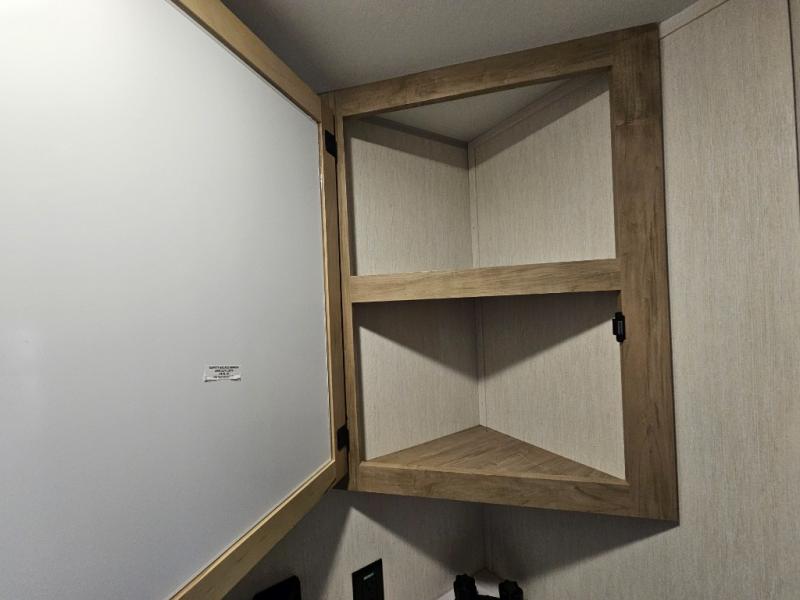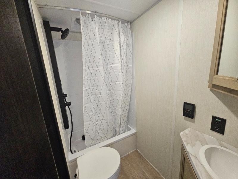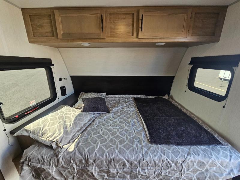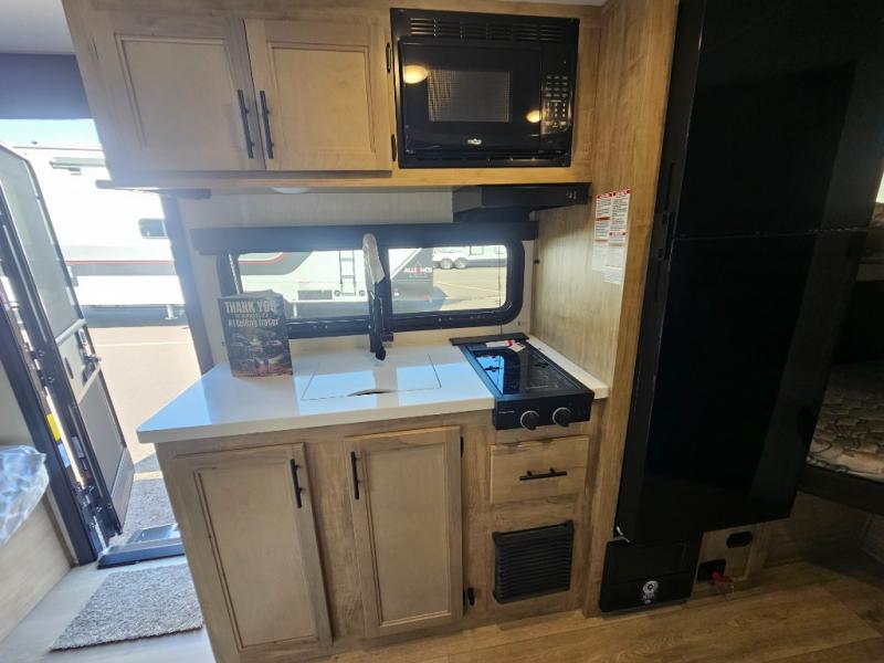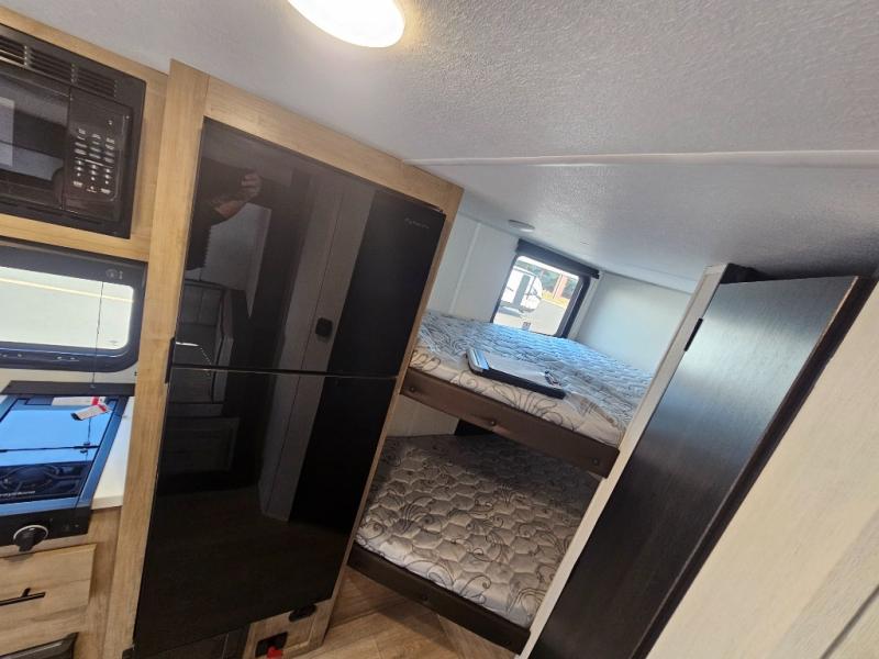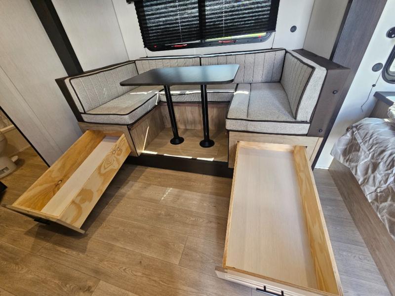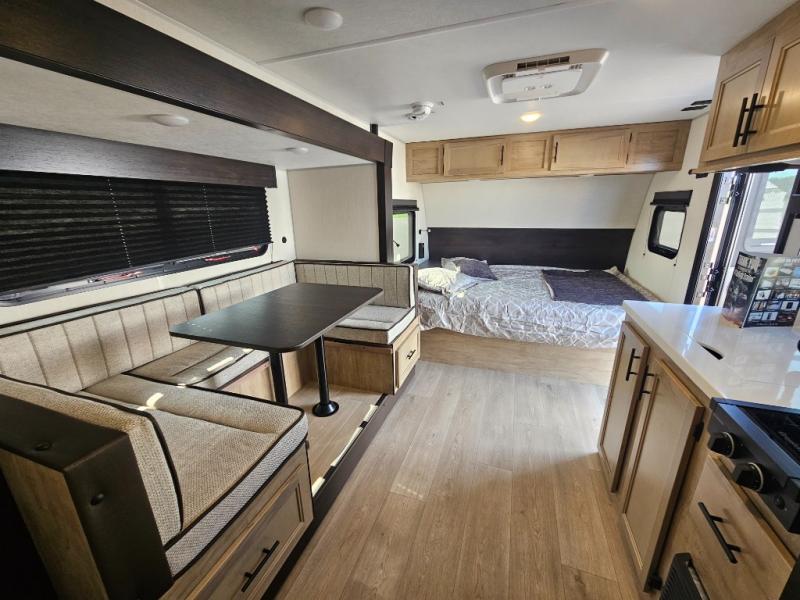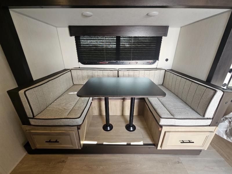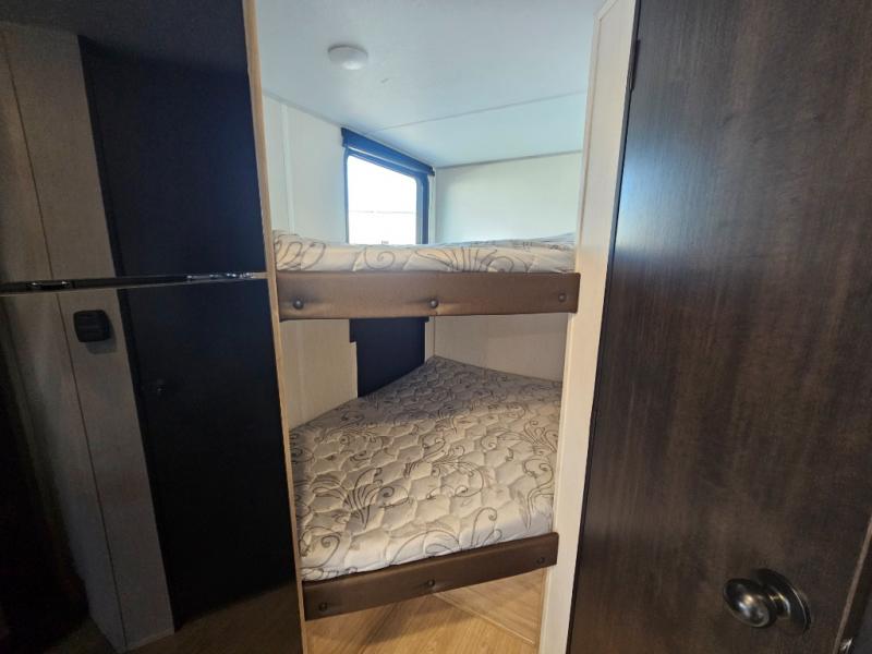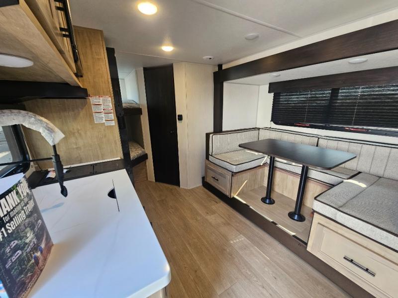 This family travel trailer is ready to head to the campground whenever you are! The kiddos can sleep on the set of double-size bed bunks and you can sleep on the front queen bed, plus the U-shaped dinette slide can also transform into an extra sleeping space when you aren't using it to enjoy a meal. You can prepare your delicious meals on the flushmount range or at the outside mini kitchen and stay protected by the power awning. The exterior not only has outside storage and an outside TV mount, but also features an outside storage plus door for access to the storage space underneath the bottom bunk bed. The rear corner bath allows everyone to stay clean and refreshed while you camp.