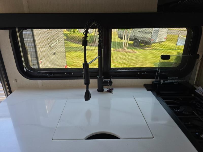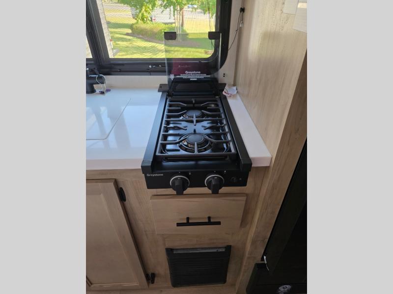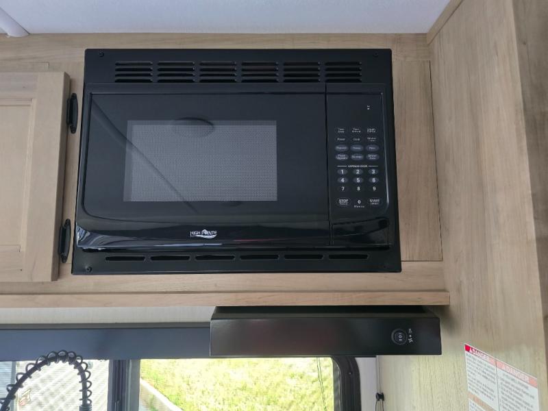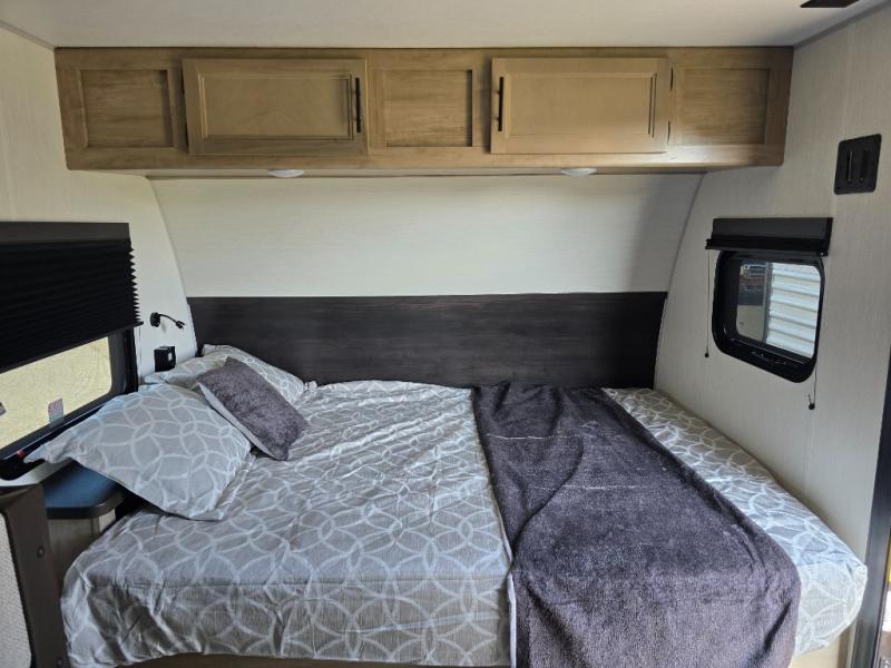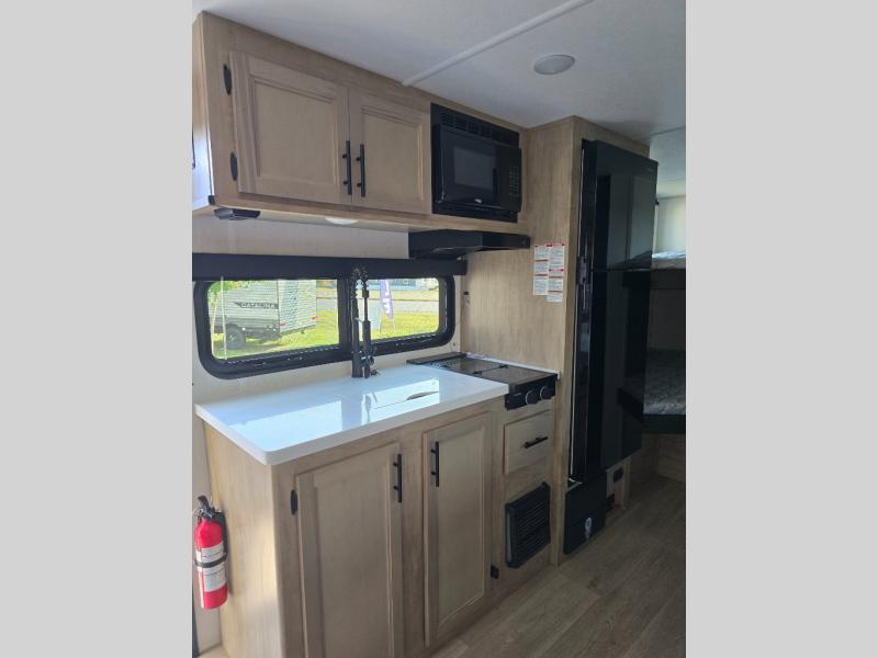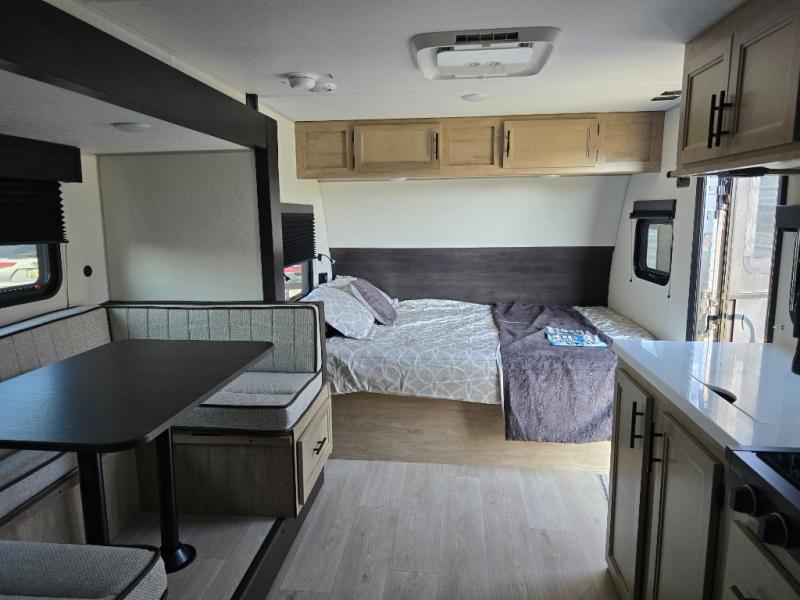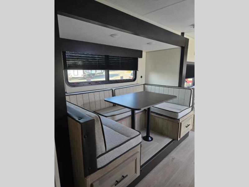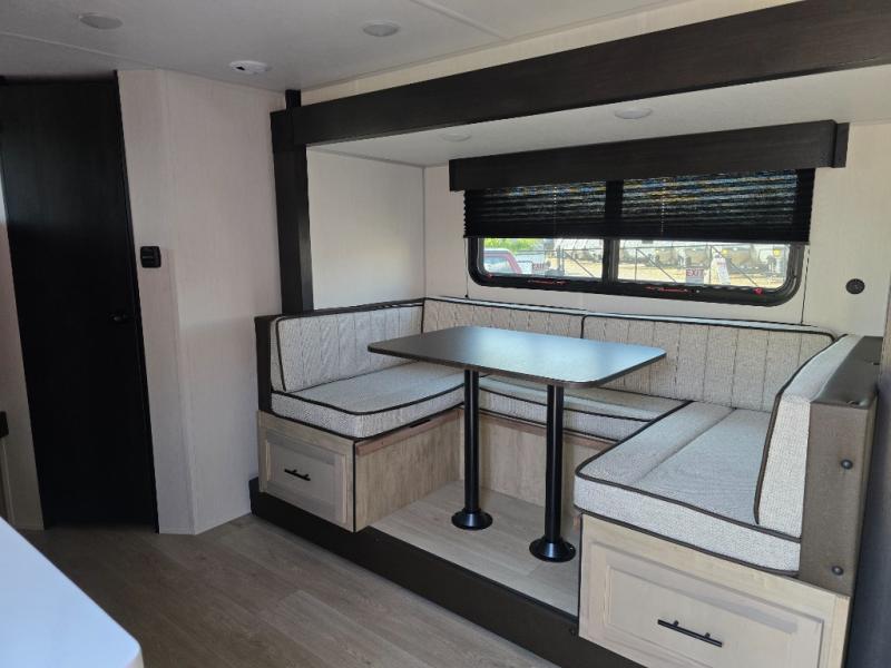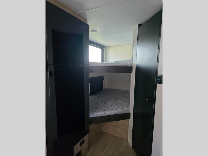 This family travel trailer is ready to head to the campground whenever you are! The kiddos can sleep on the set of double-size bed bunks and you can sleep on the front queen bed, plus the U-shaped dinette slide can also transform into an extra sleeping space when you aren't using it to enjoy a meal. You can prepare your delicious meals on the flushmount range or at the outside mini kitchen and stay protected by the power awning. The exterior not only has outside storage and an outside TV mount, but also features an outside storage plus door for access to the storage space underneath the bottom bunk bed. The rear corner bath allows everyone to stay clean and refreshed while you camp.