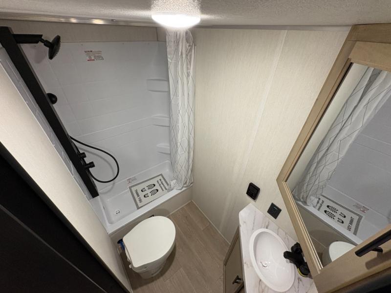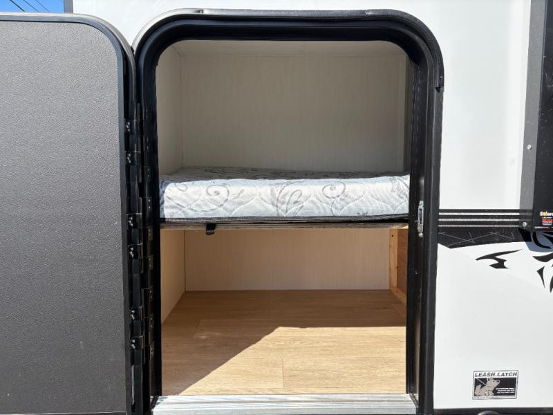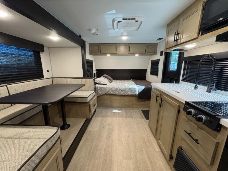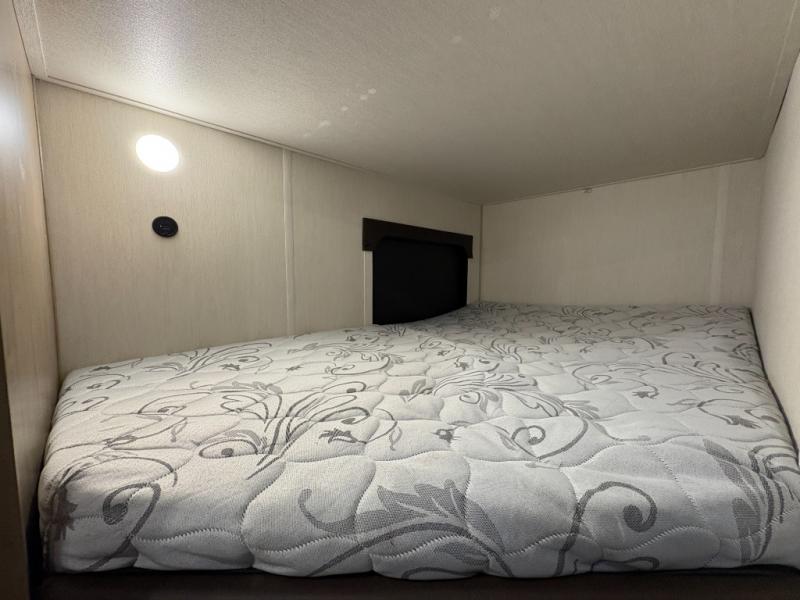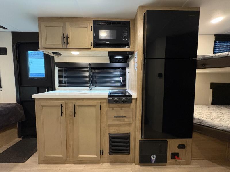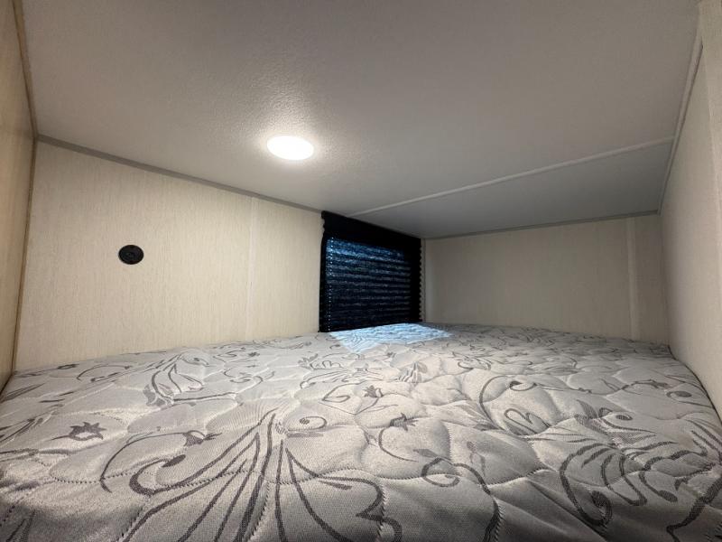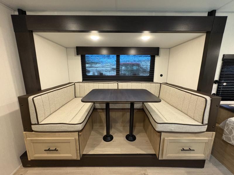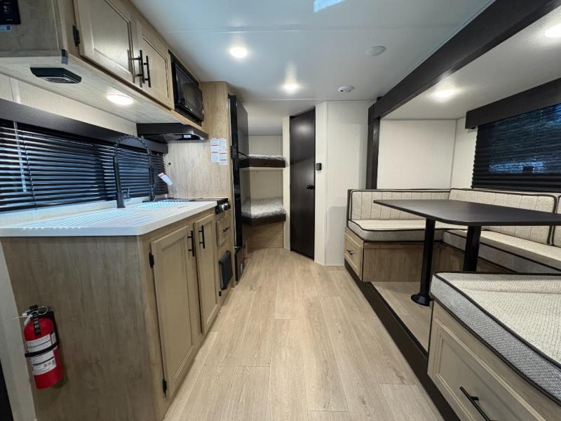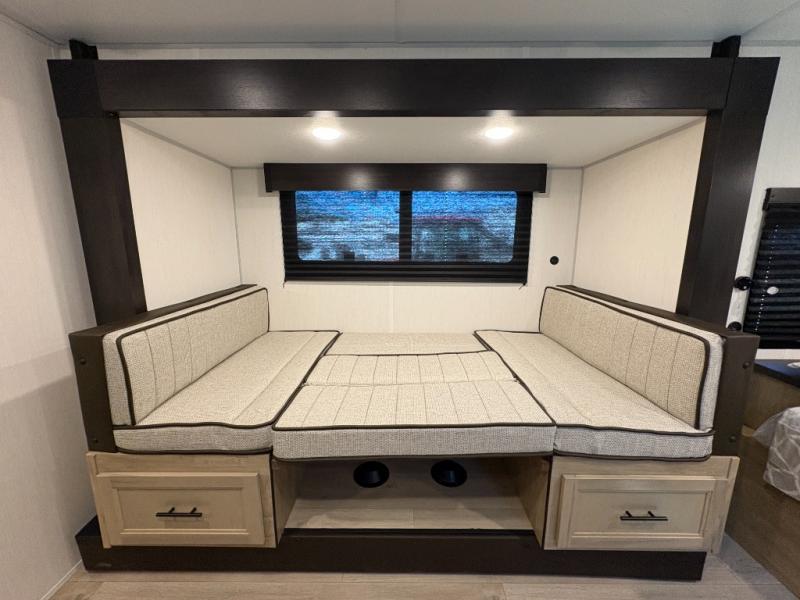 This family travel trailer is ready to head to the campground whenever you are! The kiddos can sleep on the set of double-size bed bunks and you can sleep on the front queen bed, plus the U-shaped dinette slide can also transform into an extra sleeping space when you aren't using it to enjoy a meal. You can prepare your delicious meals on the flushmount range or at the outside mini kitchen and stay protected by the power awning. The exterior not only has outside storage and an outside TV mount, but also features an outside storage plus door for access to the storage space underneath the bottom bunk bed. The rear corner bath allows everyone to stay clean and refreshed while you camp.