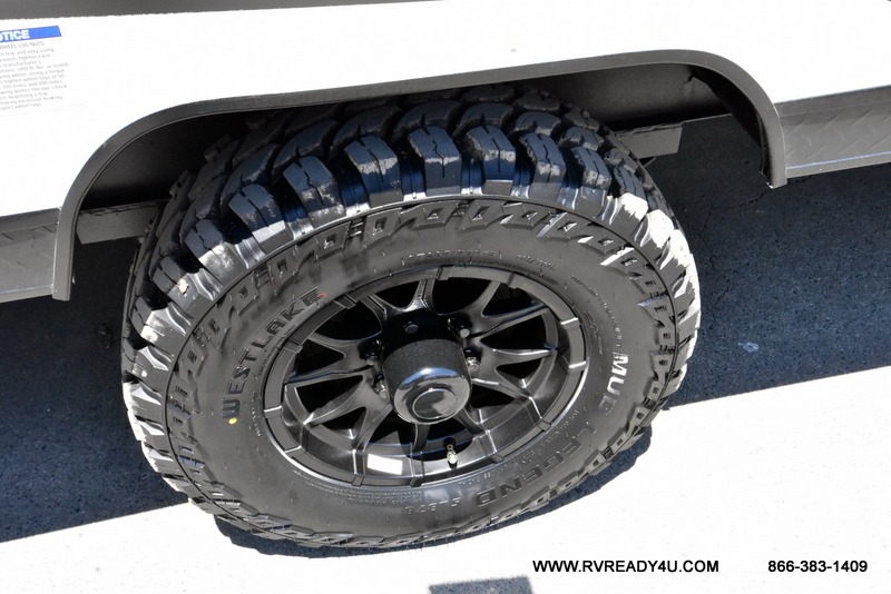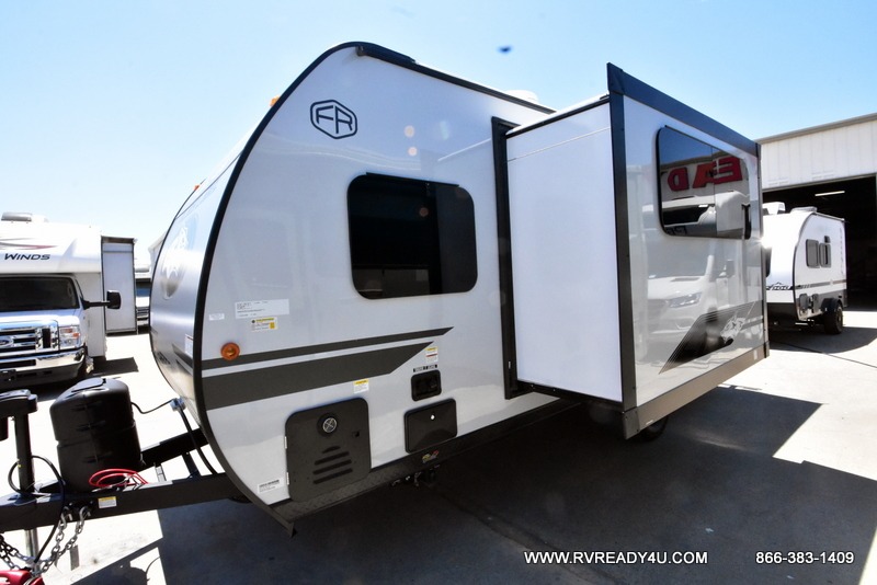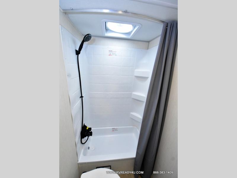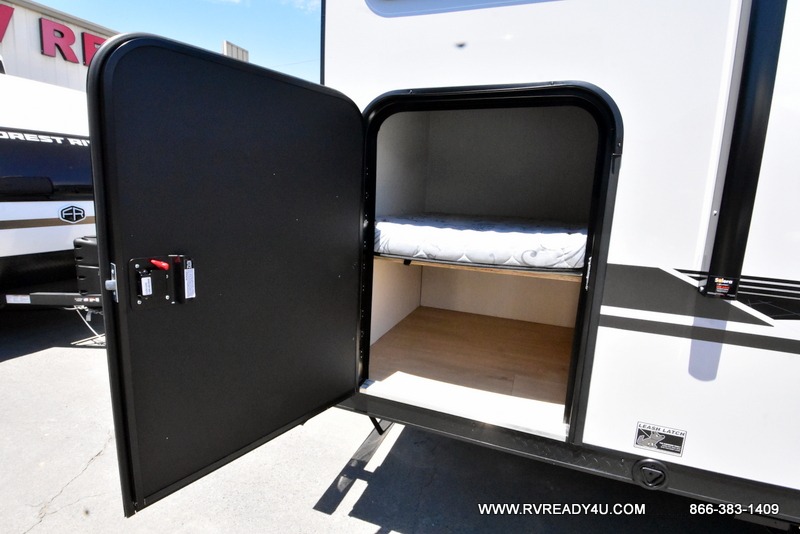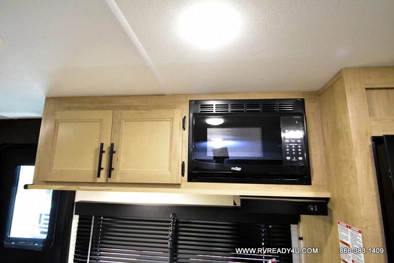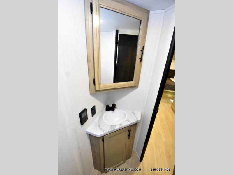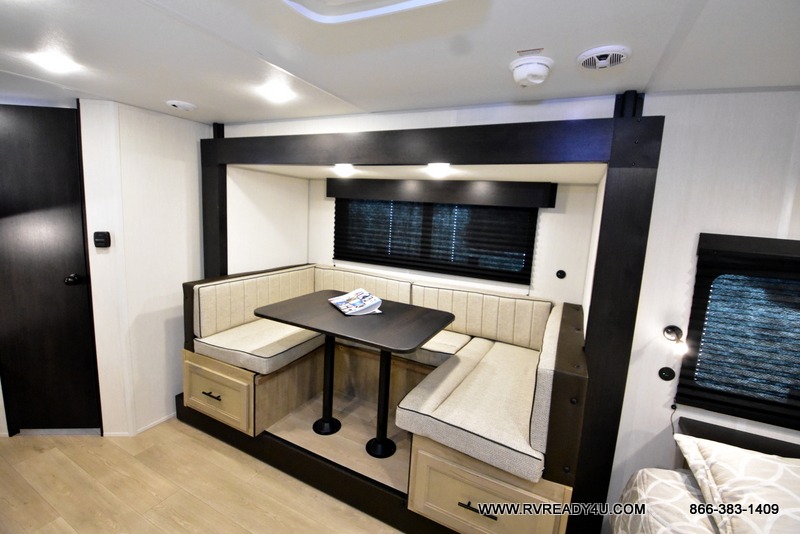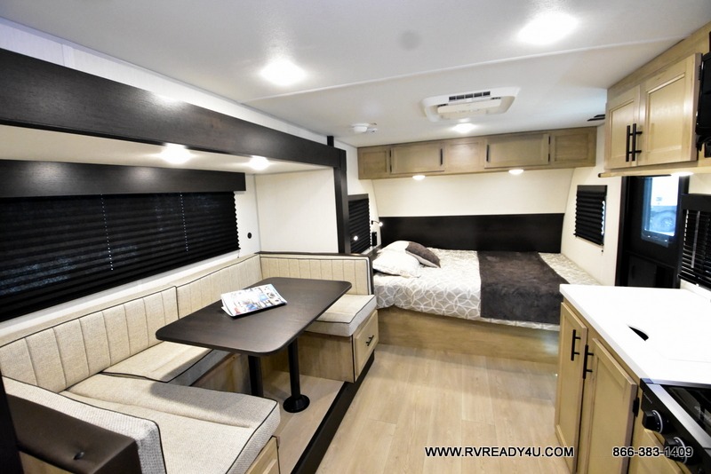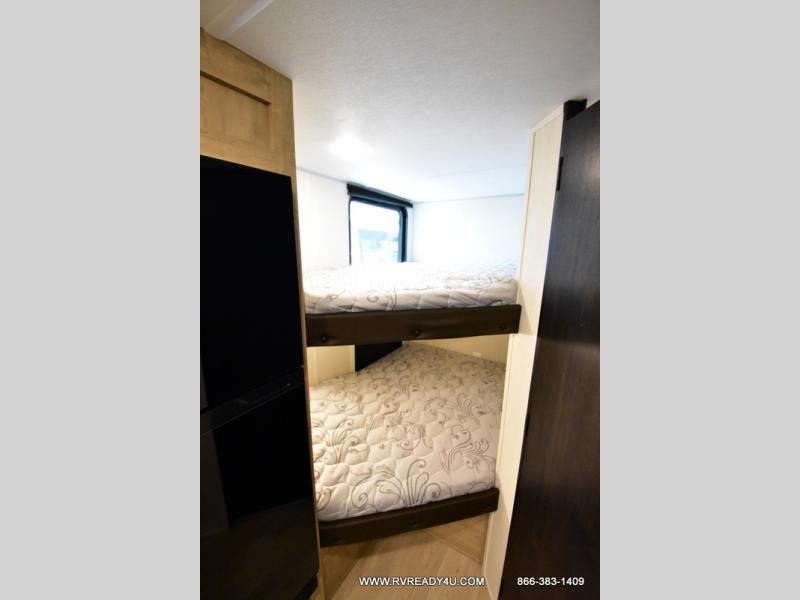 This family travel trailer is ready to head to the campground whenever you are! The kiddos can sleep on the set of double-size bed bunks and you can sleep on the front queen bed, plus the U-shaped dinette slide can also transform into an extra sleeping space when you aren't using it to enjoy a meal. You can prepare your delicious meals on the flushmount range or at the outside mini kitchen and stay protected by the power awning. The exterior not only has outside storage and an outside TV mount, but also features an outside storage plus door for access to the storage space underneath the bottom bunk bed. The rear corner bath allows everyone to stay clean and refreshed while you camp.