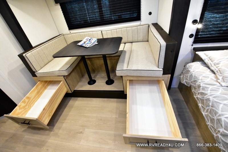 This family travel trailer is ready to head to the campground whenever you are! The kiddos can sleep on the set of double-size bed bunks and you can sleep on the front queen bed, plus the U-shaped dinette slide can also transform into an extra sleeping space when you aren't using it to enjoy a meal. You can prepare your delicious meals on the flushmount range or at the outside mini kitchen and stay protected by the power awning. The exterior not only has outside storage and an outside TV mount, but also features an outside storage plus door for access to the storage space underneath the bottom bunk bed. The rear corner bath allows everyone to stay clean and refreshed while you camp.