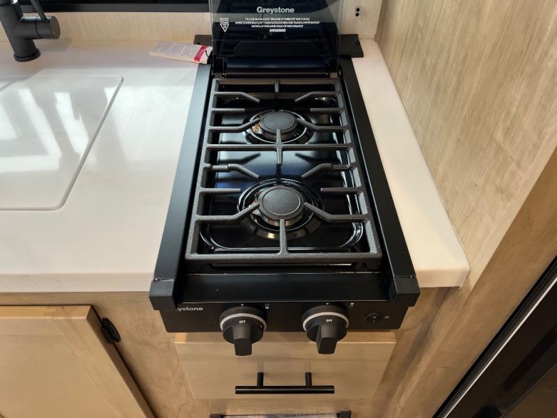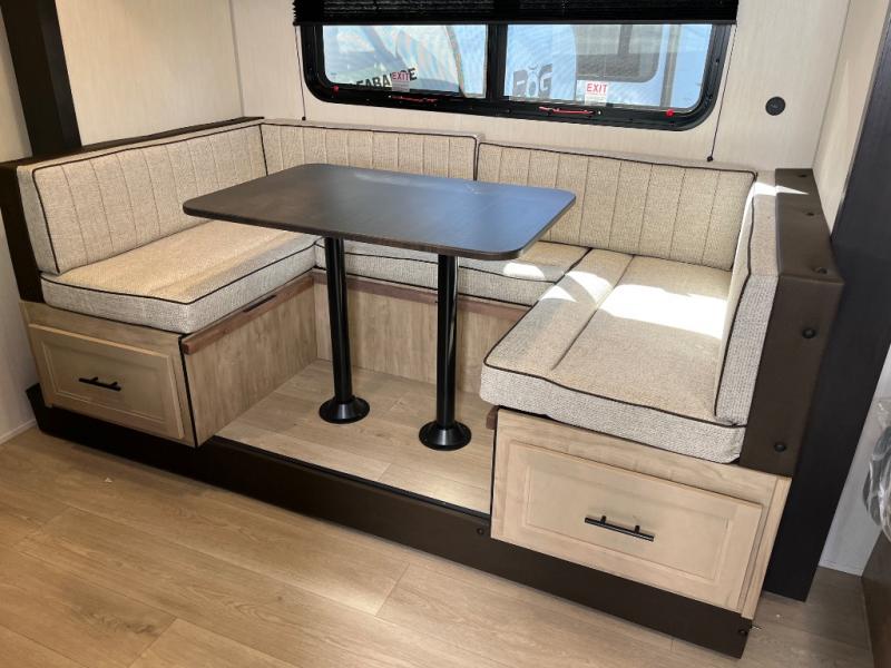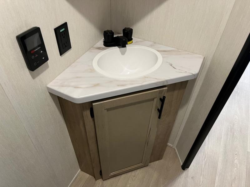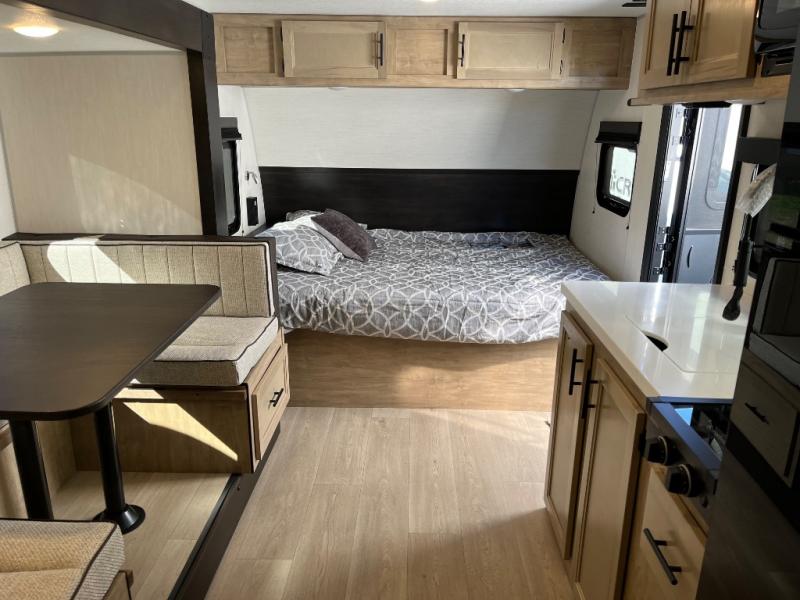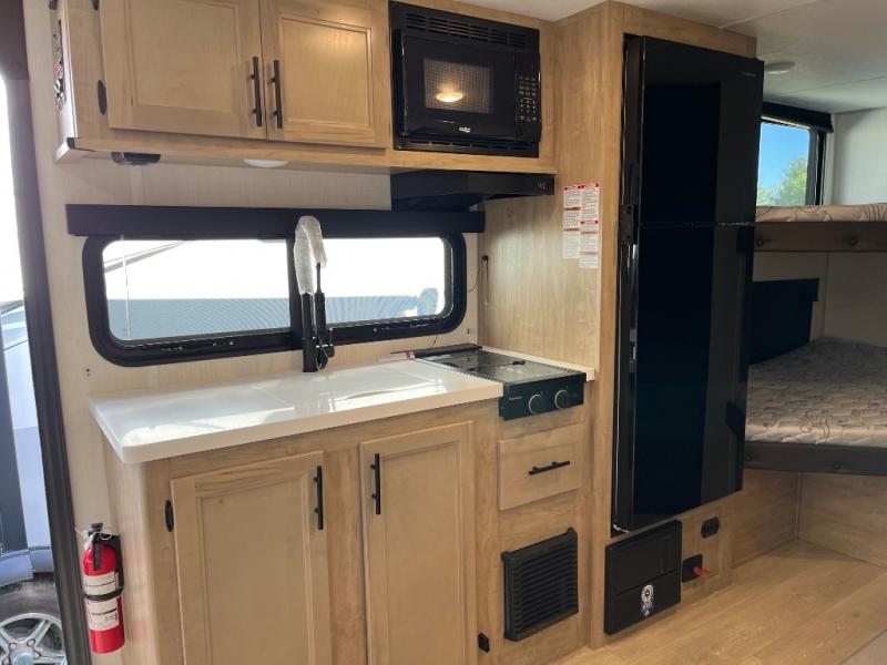 This family travel trailer is ready to head to the campground whenever you are! The kiddos can sleep on the set of double-size bed bunks, and you can sleep on the front queen bed, plus the U-shaped dinette slide can also transform into an extra sleeping space when you aren't using it to enjoy a meal. You can prepare your delicious meals on the range or at the outside mini kitchen and stay protected by the awning. The exterior not only has outside storage and an outside TV mount but also features an outside storage plus door for access to the storage space underneath the bottom bunk bed. The rear corner bath allows everyone to stay clean and refreshed while you camp.