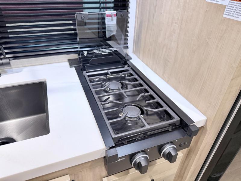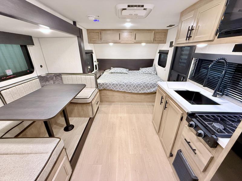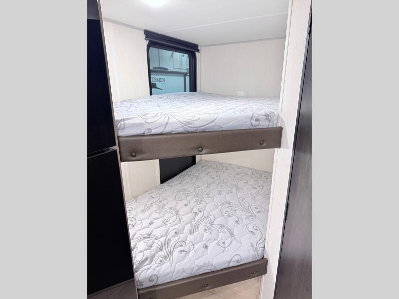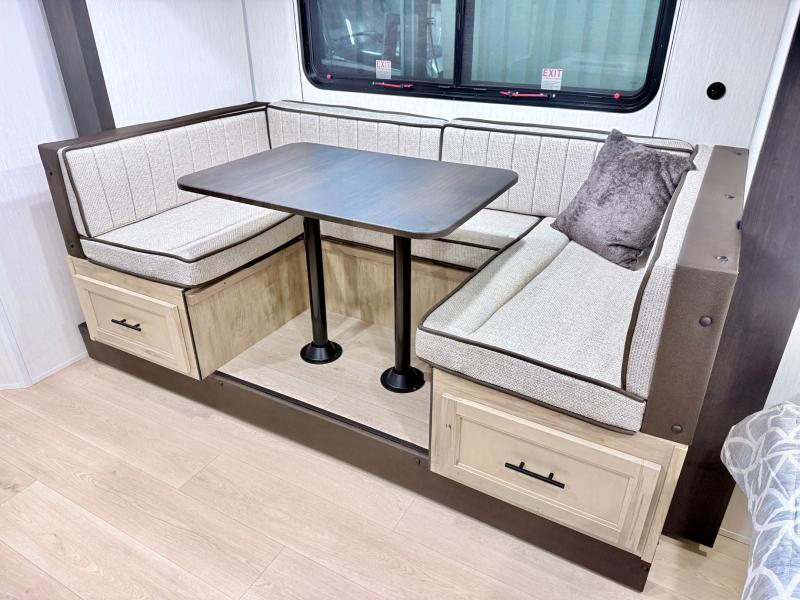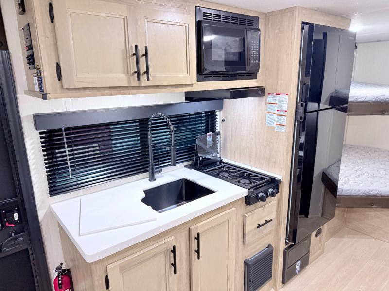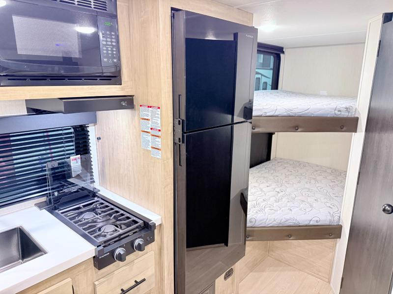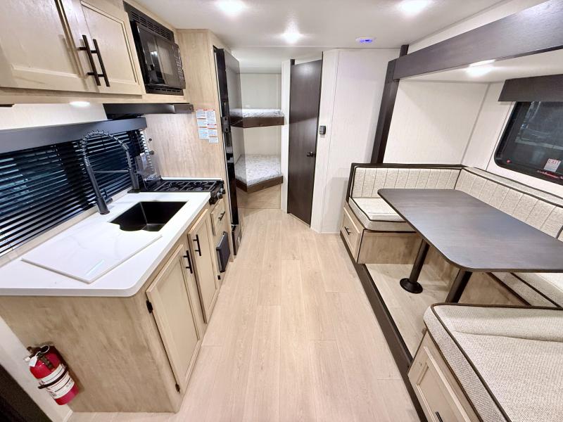 This family travel trailer is ready to head to the campground whenever you are! The kiddos can sleep on the set of double-size bed bunks, and you can sleep on the front queen bed, plus the U-shaped dinette slide can also transform into an extra sleeping space when you aren't using it to enjoy a meal. You can prepare your delicious meals on the range or at the outside mini kitchen and stay protected by the awning. The exterior not only has outside storage and an outside TV mount but also features an outside storage plus door for access to the storage space underneath the bottom bunk bed. The rear corner bath allows everyone to stay clean and refreshed while you camp.