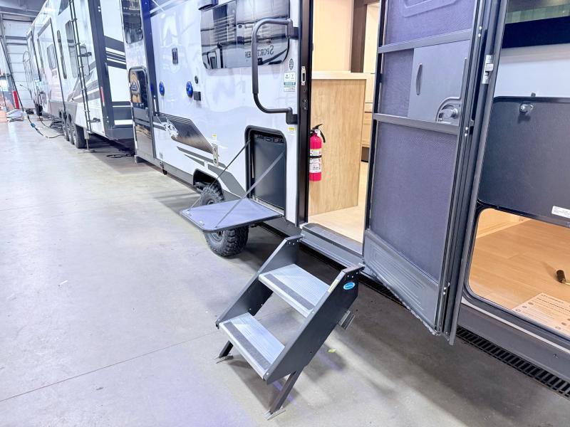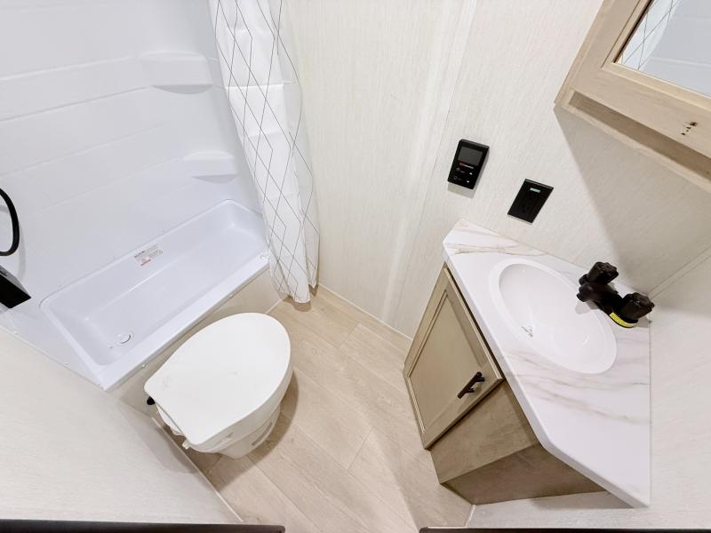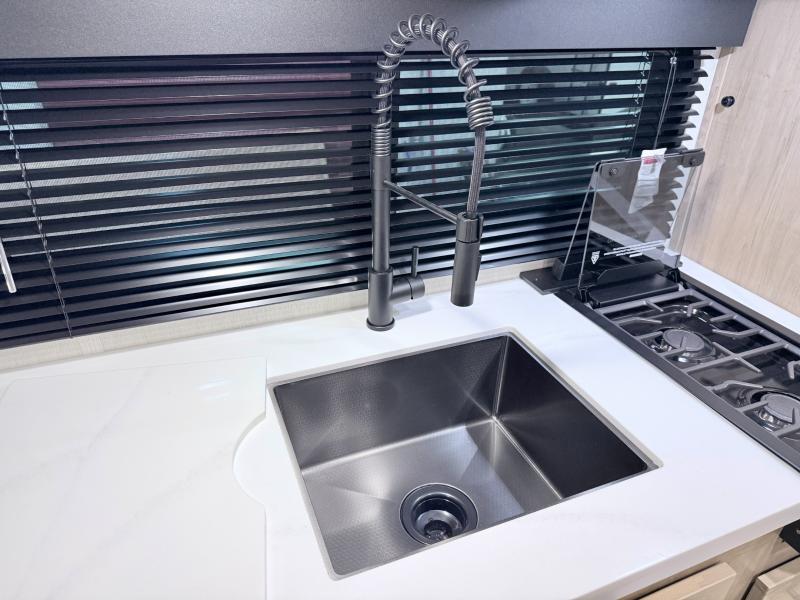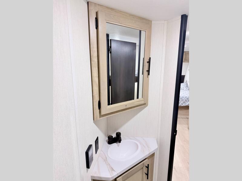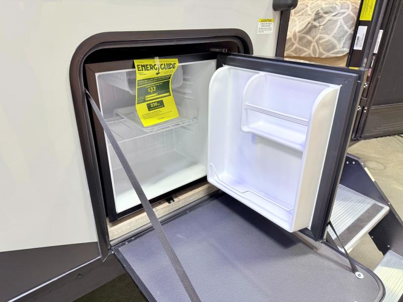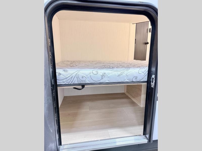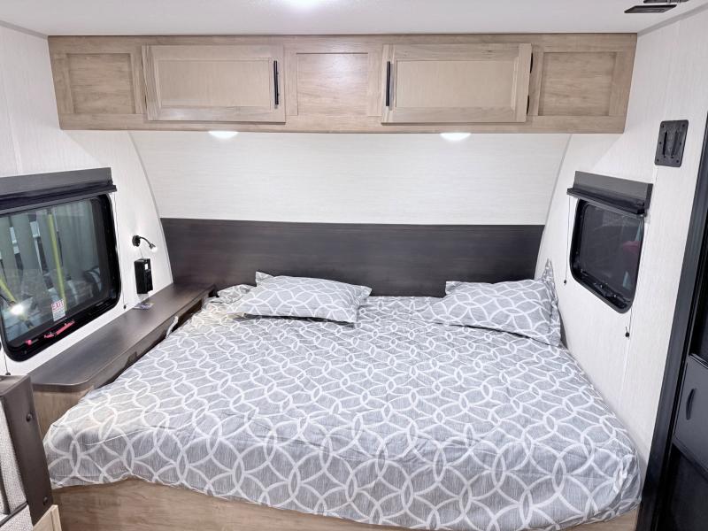 This family travel trailer is ready to head to the campground whenever you are! The kiddos can sleep on the set of double-size bed bunks, and you can sleep on the front queen bed, plus the U-shaped dinette slide can also transform into an extra sleeping space when you aren't using it to enjoy a meal. You can prepare your delicious meals on the range or at the outside mini kitchen and stay protected by the awning. The exterior not only has outside storage and an outside TV mount but also features an outside storage plus door for access to the storage space underneath the bottom bunk bed. The rear corner bath allows everyone to stay clean and refreshed while you camp.