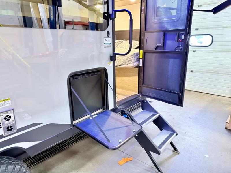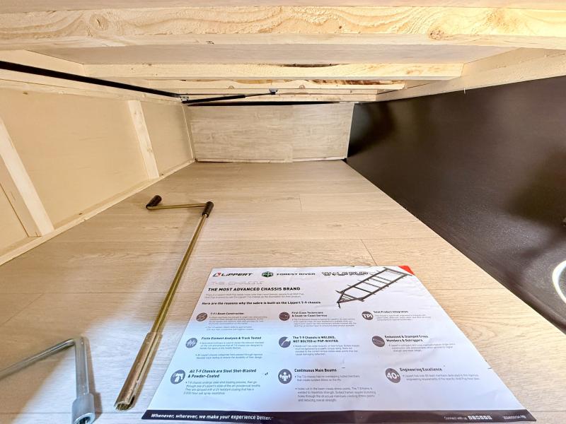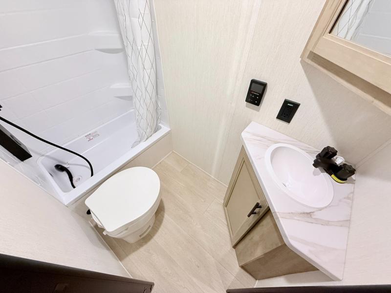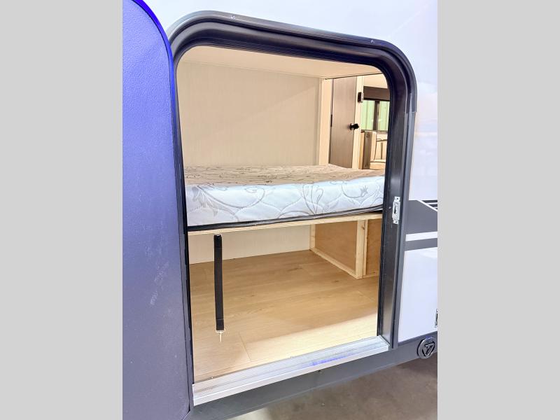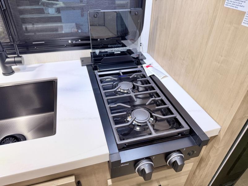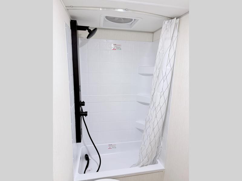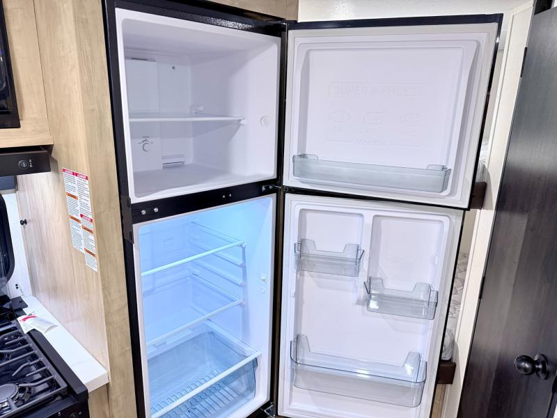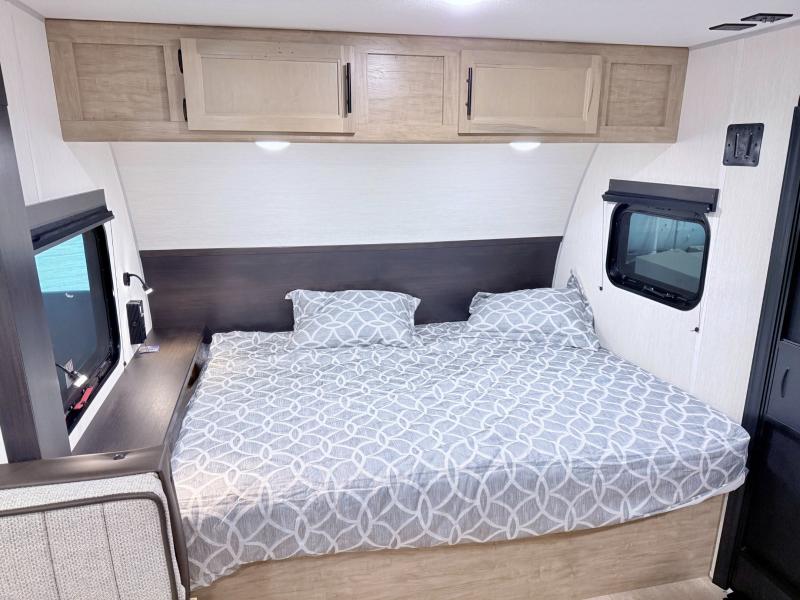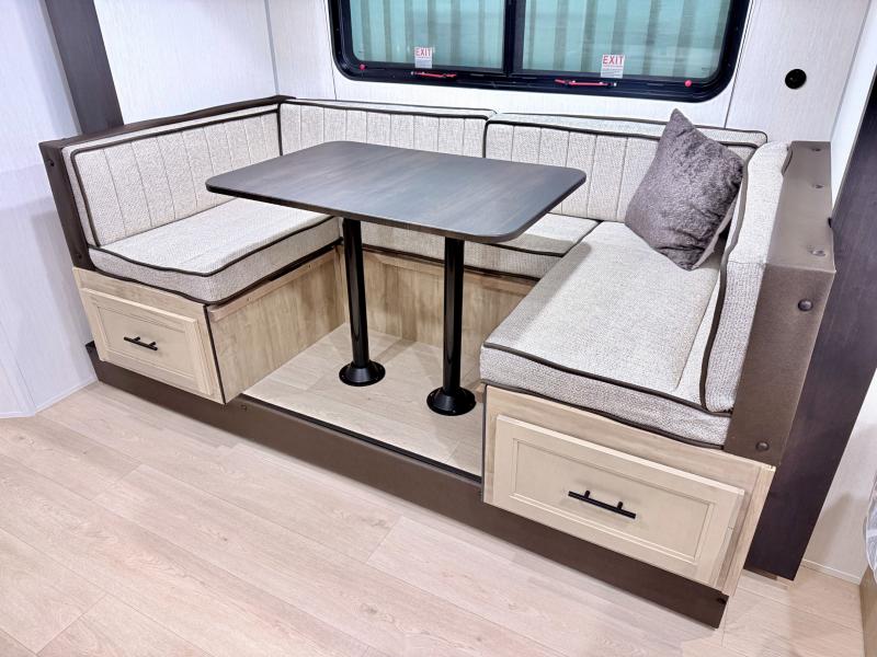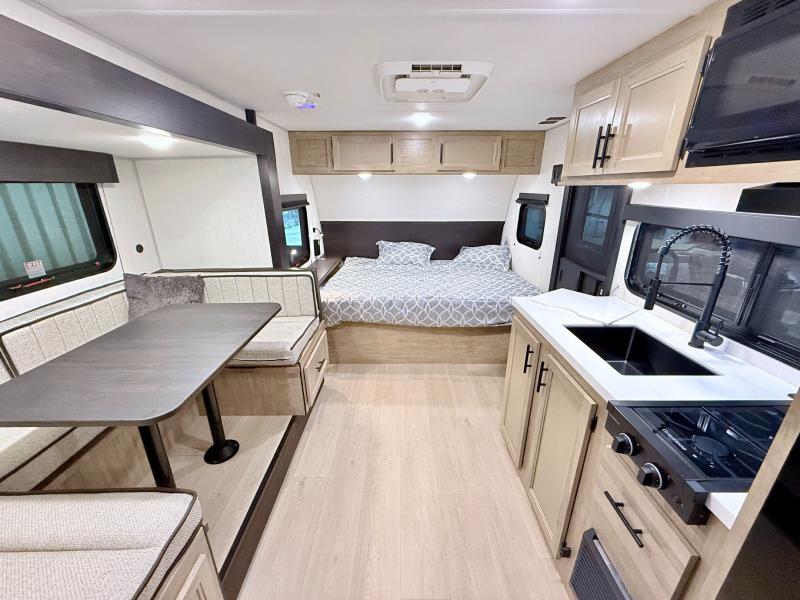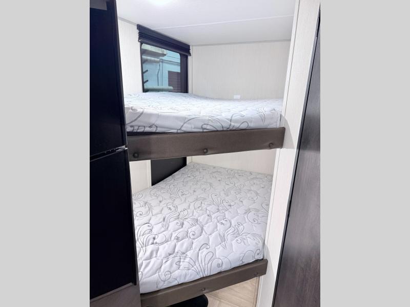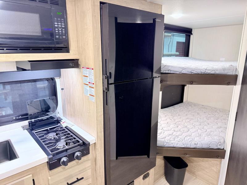 This family travel trailer is ready to head to the campground whenever you are! The kiddos can sleep on the set of double-size bed bunks, and you can sleep on the front queen bed, plus the U-shaped dinette slide can also transform into an extra sleeping space when you aren't using it to enjoy a meal. You can prepare your delicious meals on the range or at the outside mini kitchen and stay protected by the awning. The exterior not only has outside storage and an outside TV mount but also features an outside storage plus door for access to the storage space underneath the bottom bunk bed. The rear corner bath allows everyone to stay clean and refreshed while you camp.