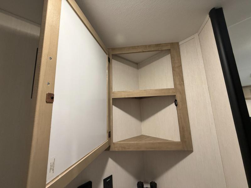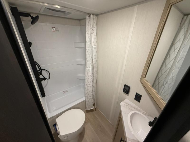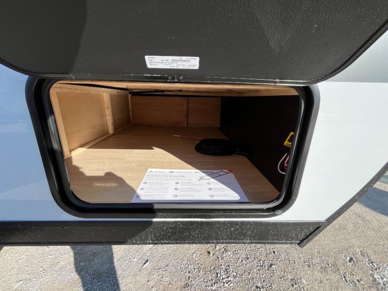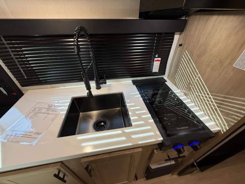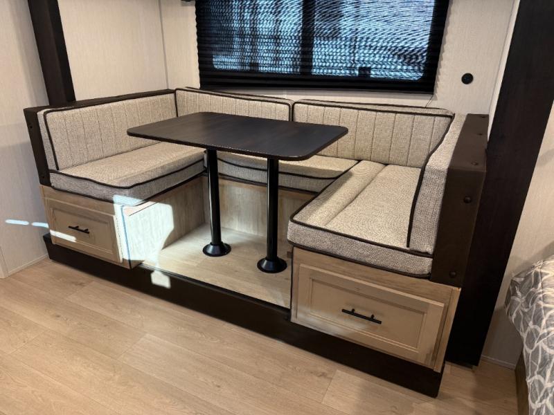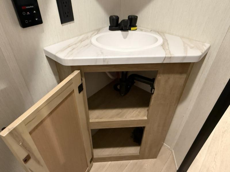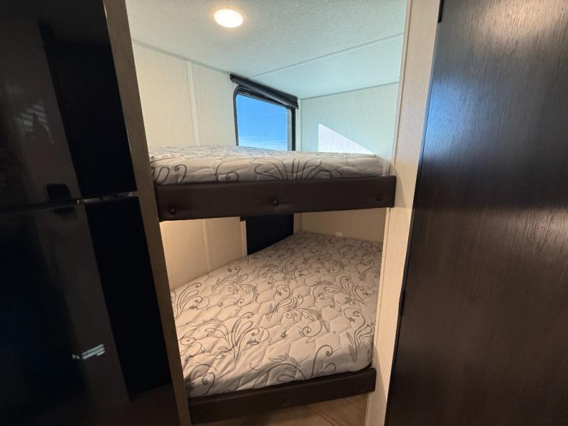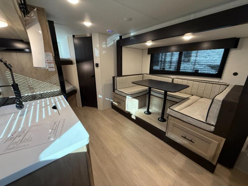 This family travel trailer is ready to head to the campground whenever you are! The kiddos can sleep on the set of double-size bed bunks, and you can sleep on the front queen bed, plus the U-shaped dinette slide can also transform into an extra sleeping space when you aren't using it to enjoy a meal. You can prepare your delicious meals on the range or at the outside mini kitchen and stay protected by the awning. The exterior not only has outside storage and an outside TV mount but also features an outside storage plus door for access to the storage space underneath the bottom bunk bed. The rear corner bath allows everyone to stay clean and refreshed while you camp.