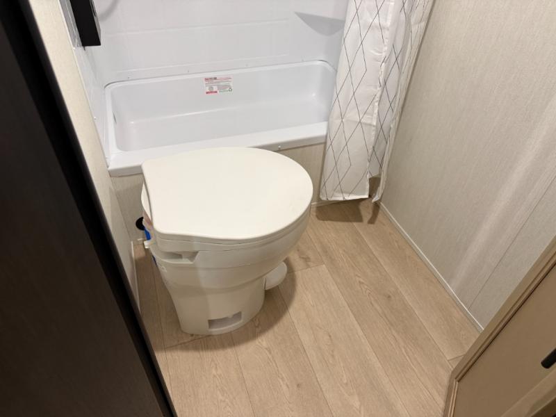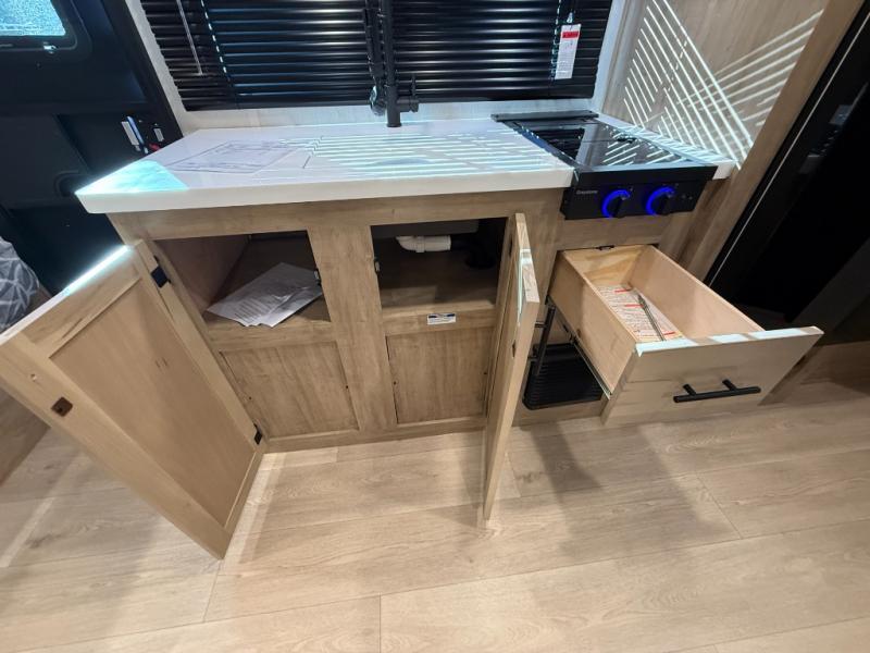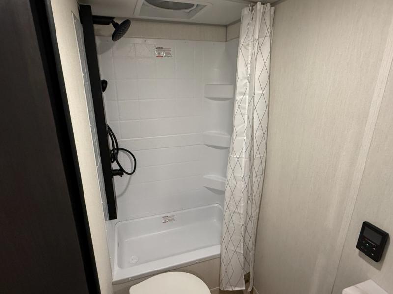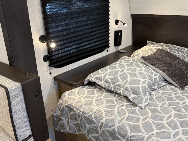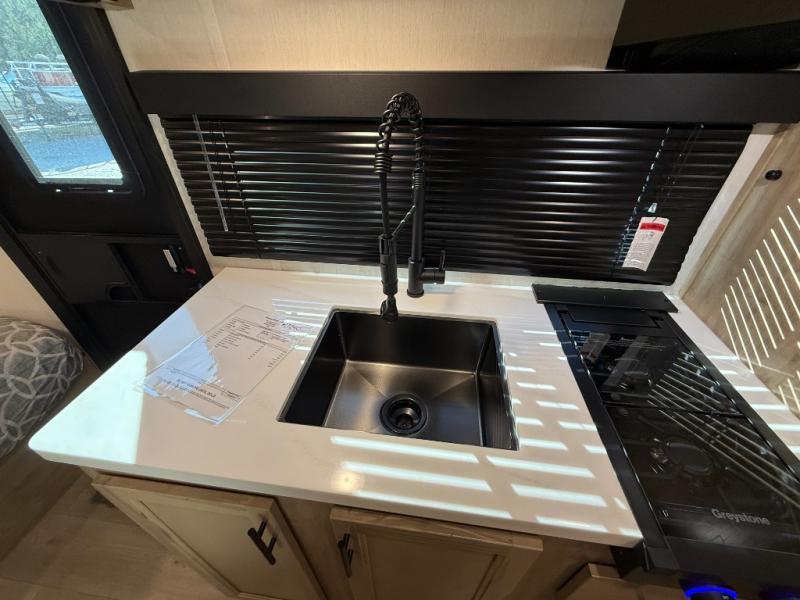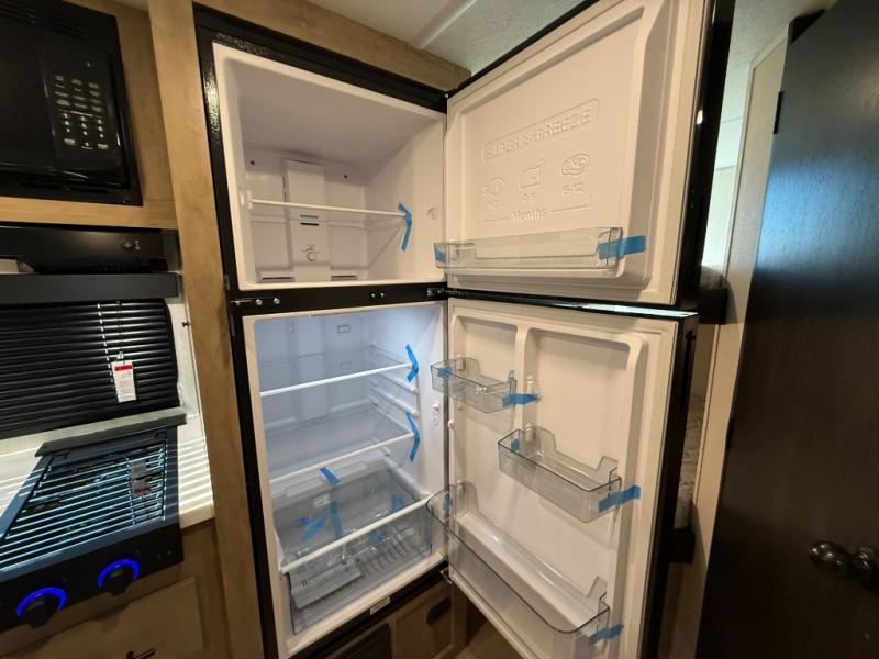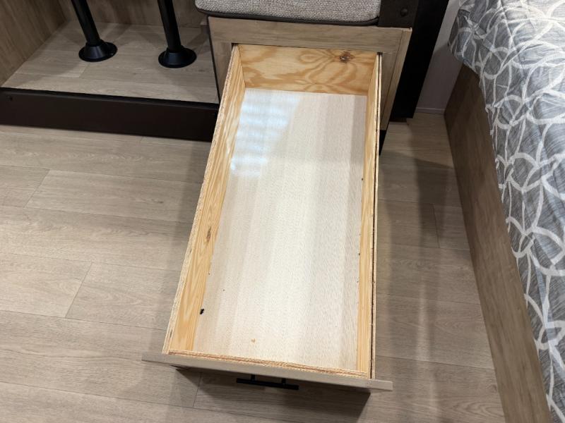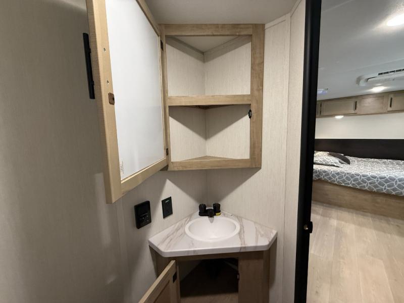 This family travel trailer is ready to head to the campground whenever you are! The kiddos can sleep on the set of double-size bed bunks, and you can sleep on the front queen bed, plus the U-shaped dinette slide can also transform into an extra sleeping space when you aren't using it to enjoy a meal. You can prepare your delicious meals on the range or at the outside mini kitchen and stay protected by the awning. The exterior not only has outside storage and an outside TV mount but also features an outside storage plus door for access to the storage space underneath the bottom bunk bed. The rear corner bath allows everyone to stay clean and refreshed while you camp.