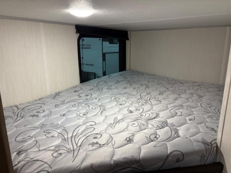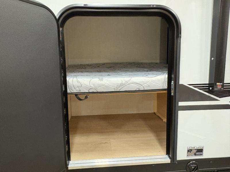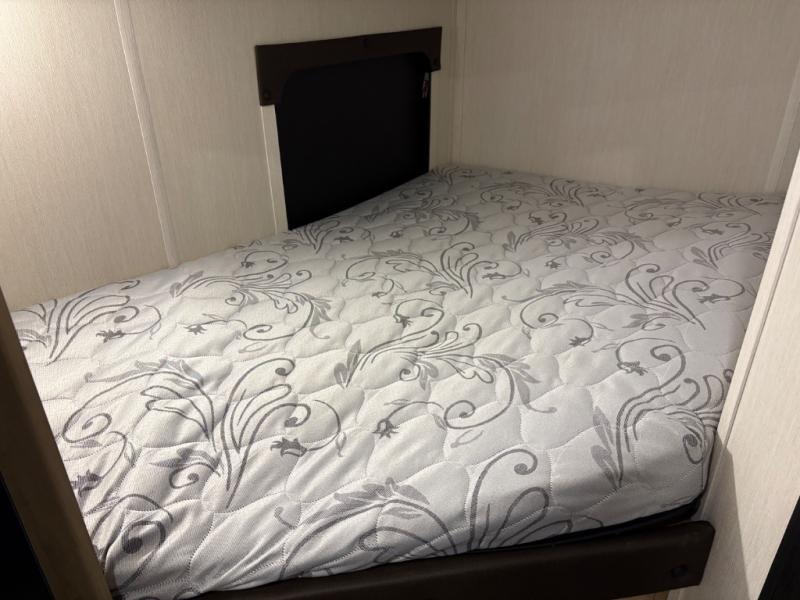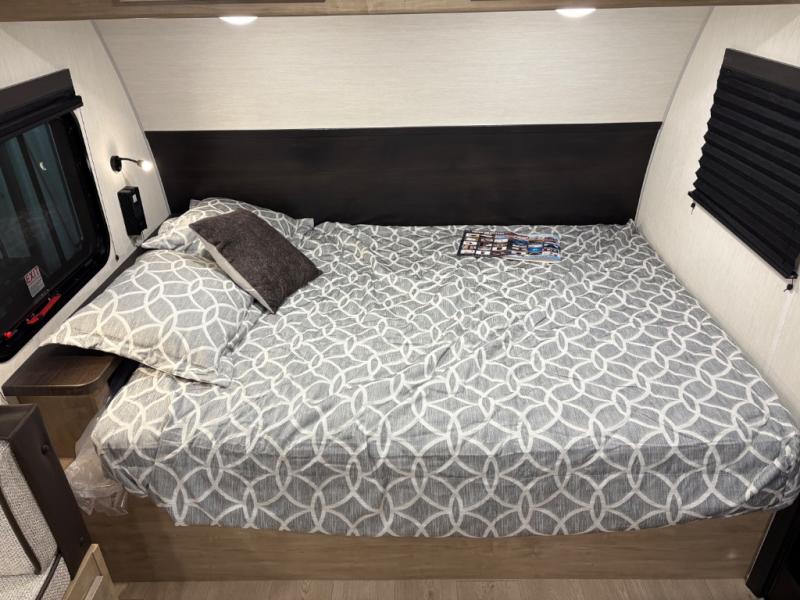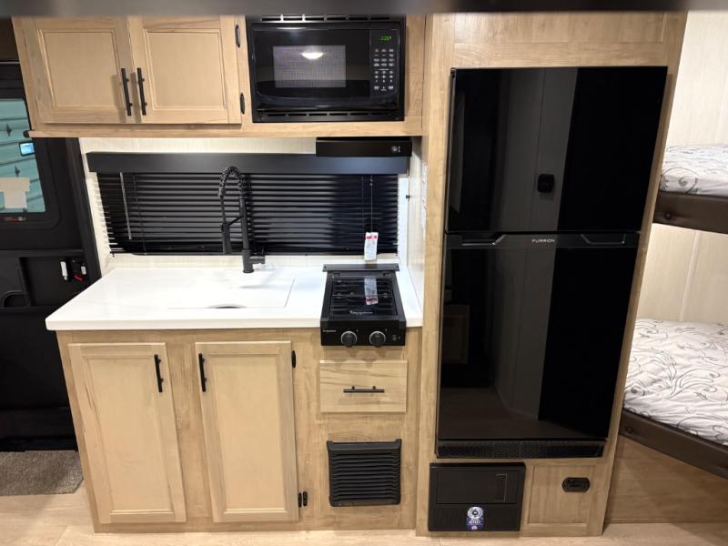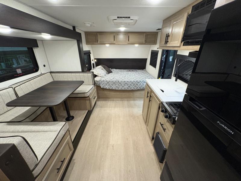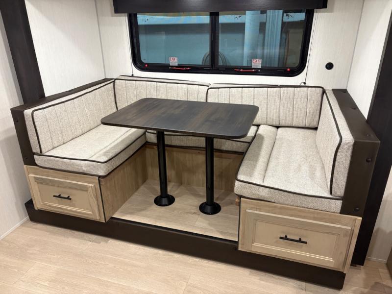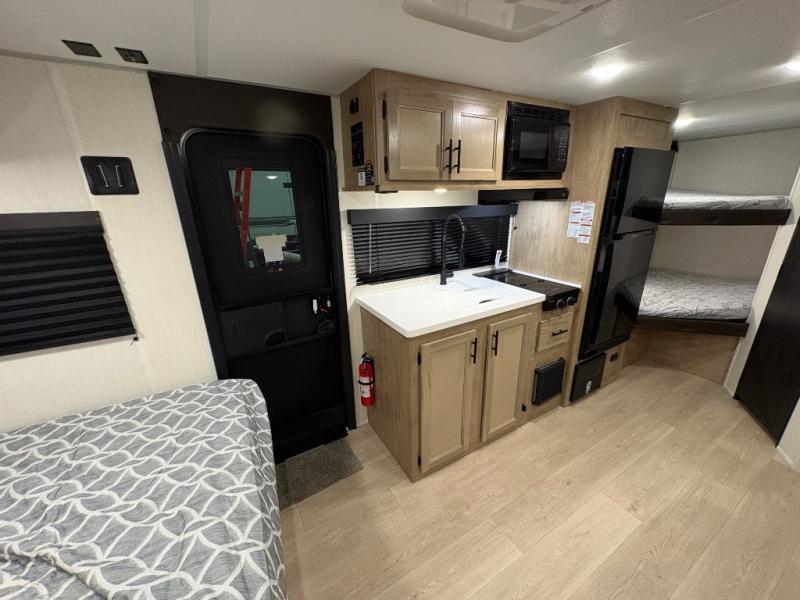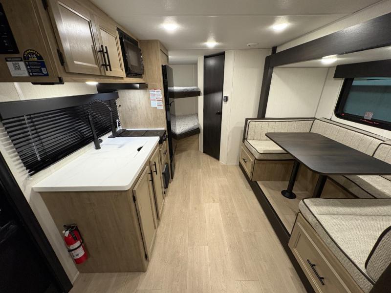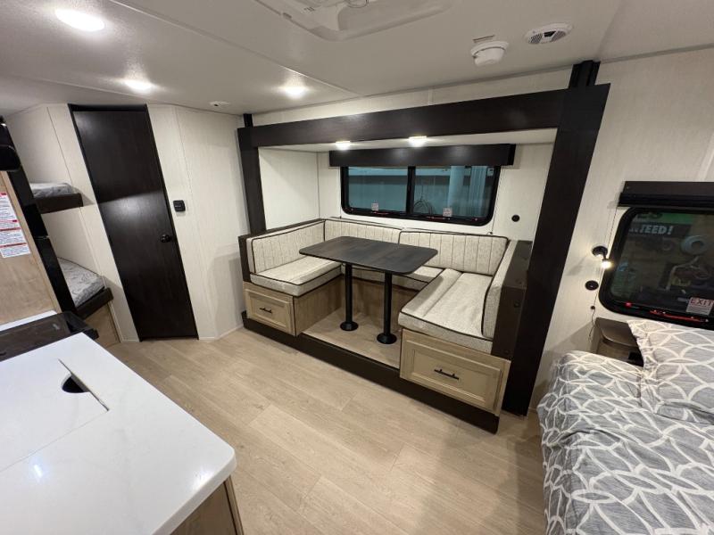This family travel trailer is ready to head to the campground whenever you are! The kiddos can sleep on the set of double-size bed bunks, and you can sleep on the front queen bed, plus the U-shaped dinette slide can also transform into an extra sleeping space when you aren't using it to enjoy a meal. You can prepare your delicious meals on the range or at the outside mini kitchen and stay protected by the awning. The exterior not only has outside storage and an outside TV mount but also features an outside storage plus door for access to the storage space underneath the bottom bunk bed. The rear corner bath allows everyone to stay clean and refreshed while you camp.