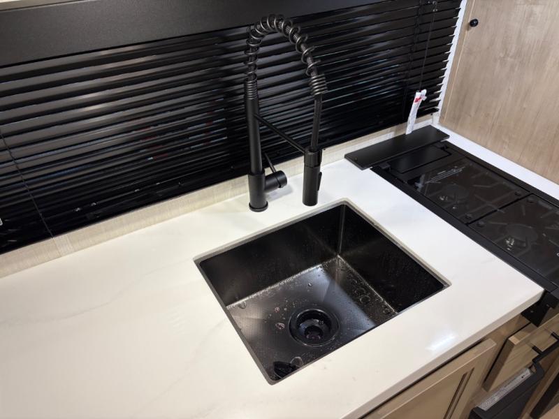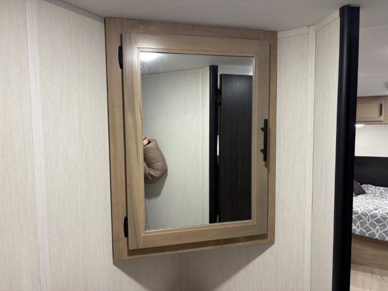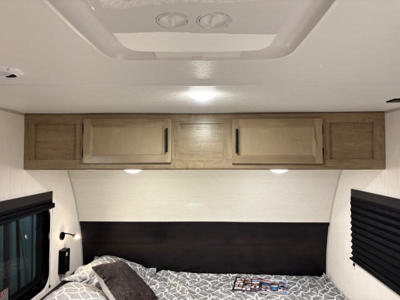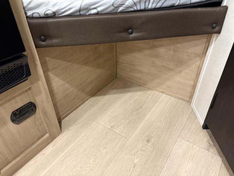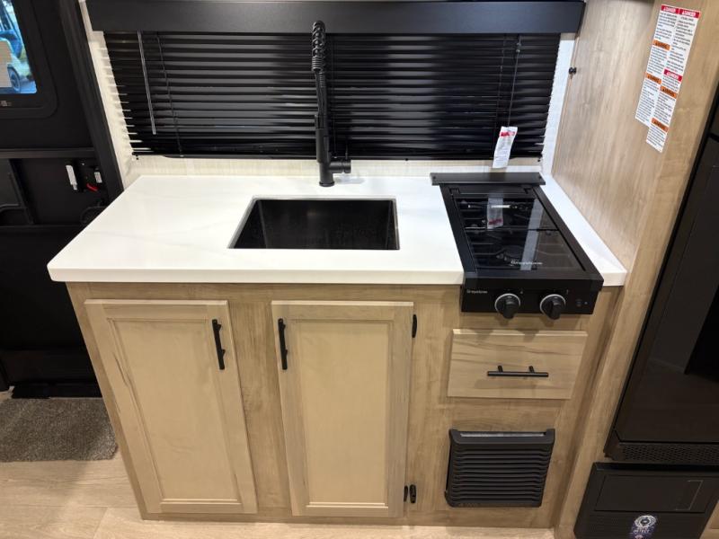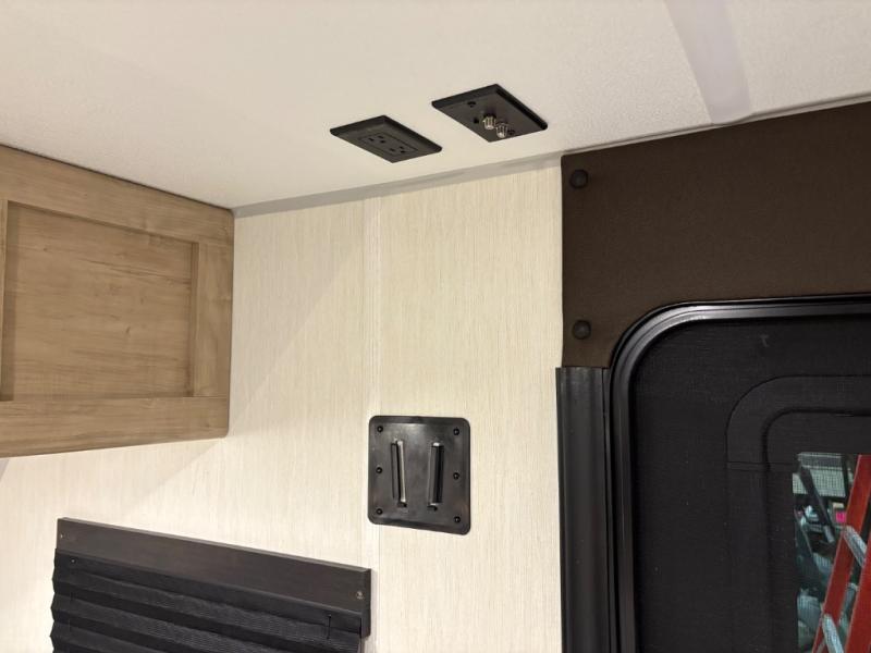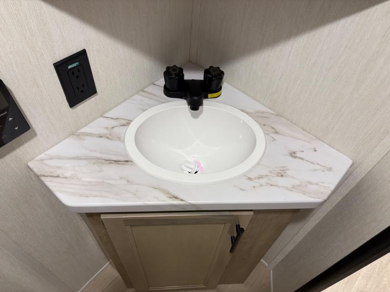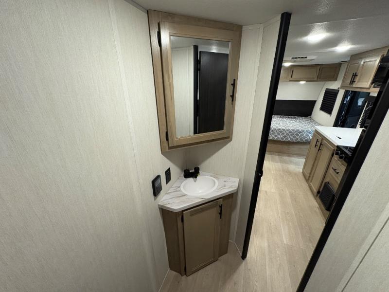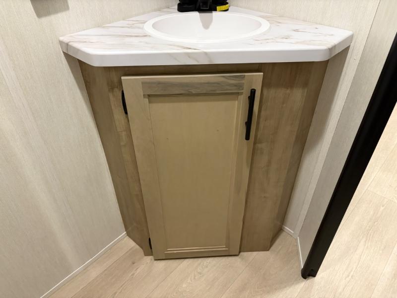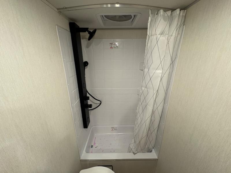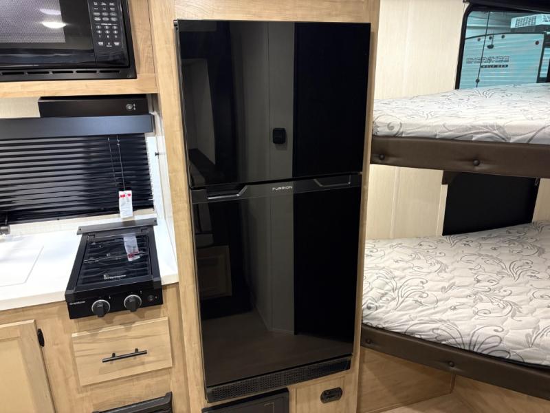 This family travel trailer is ready to head to the campground whenever you are! The kiddos can sleep on the set of double-size bed bunks, and you can sleep on the front queen bed, plus the U-shaped dinette slide can also transform into an extra sleeping space when you aren't using it to enjoy a meal. You can prepare your delicious meals on the range or at the outside mini kitchen and stay protected by the awning. The exterior not only has outside storage and an outside TV mount but also features an outside storage plus door for access to the storage space underneath the bottom bunk bed. The rear corner bath allows everyone to stay clean and refreshed while you camp.