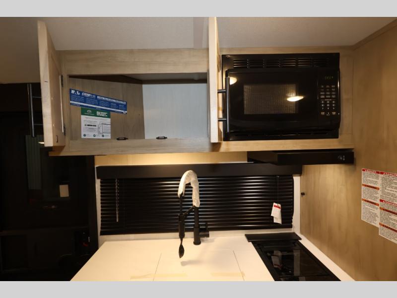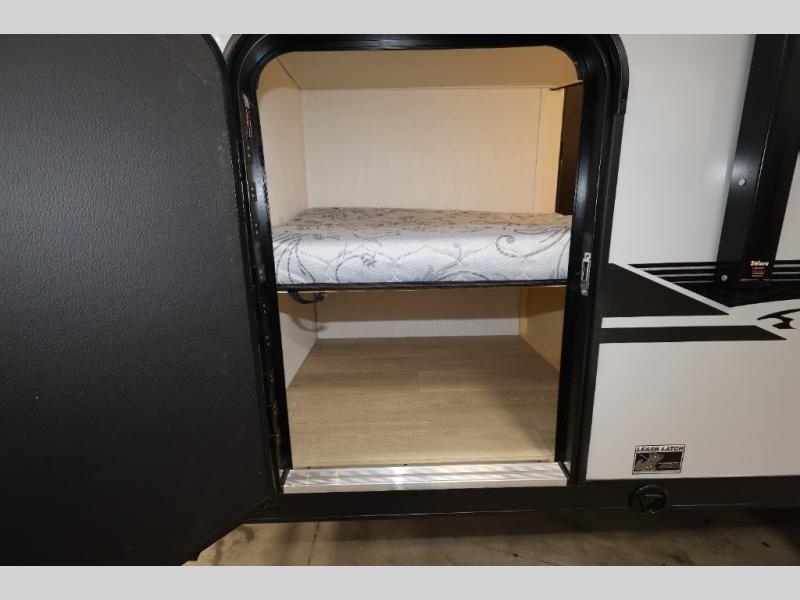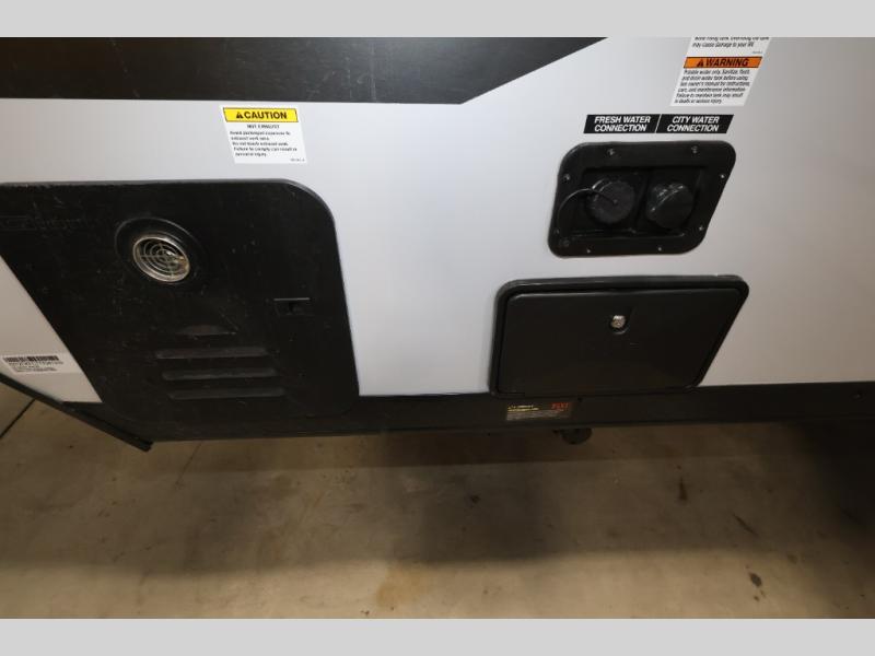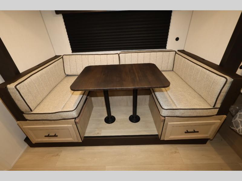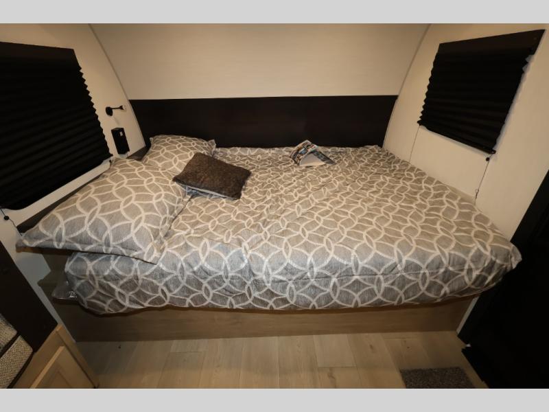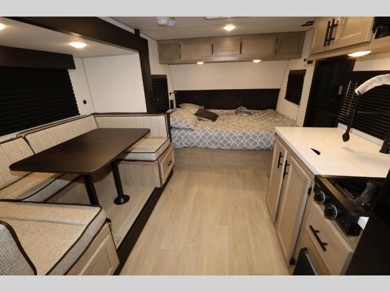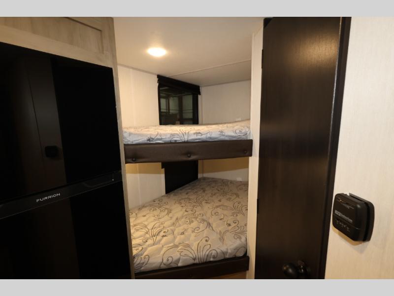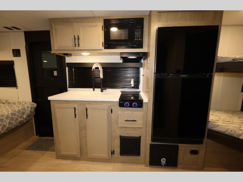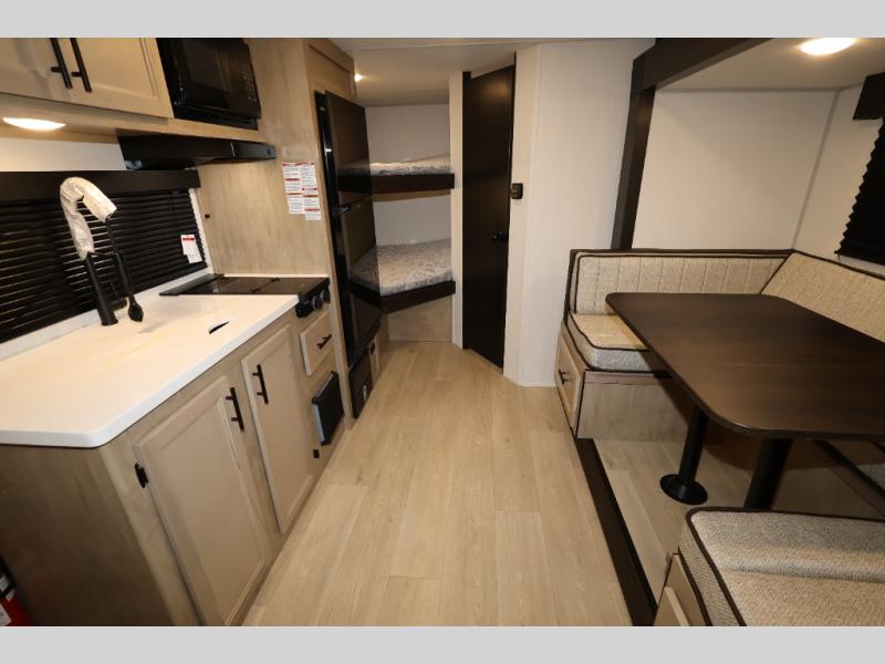 This family travel trailer is ready to head to the campground whenever you are! The kiddos can sleep on the set of double-size bed bunks, and you can sleep on the front queen bed, plus the U-shaped dinette slide can also transform into an extra sleeping space when you aren't using it to enjoy a meal. You can prepare your delicious meals on the range or at the outside mini kitchen and stay protected by the awning. The exterior not only has outside storage and an outside TV mount but also features an outside storage plus door for access to the storage space underneath the bottom bunk bed. The rear corner bath allows everyone to stay clean and refreshed while you camp.
