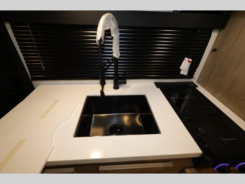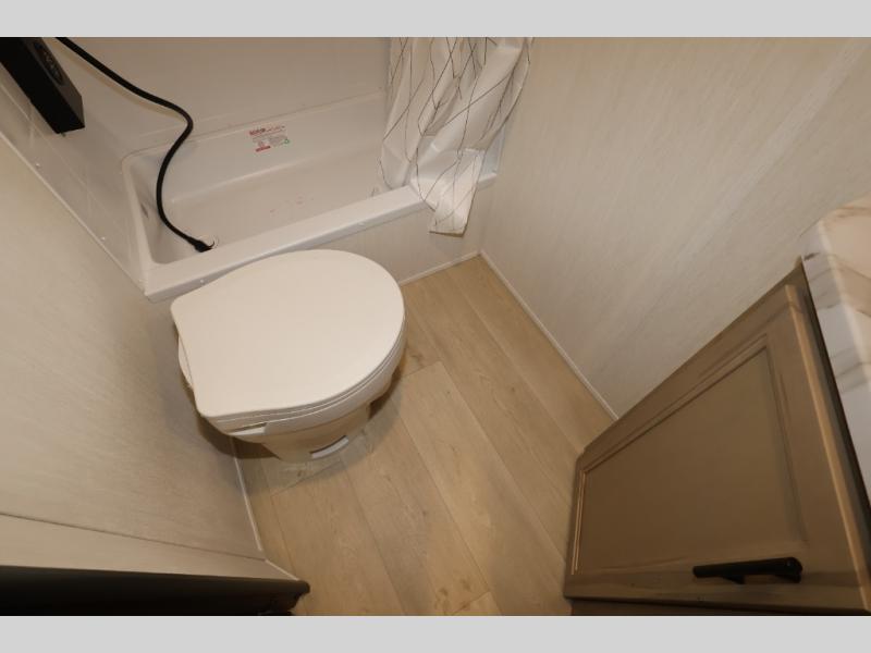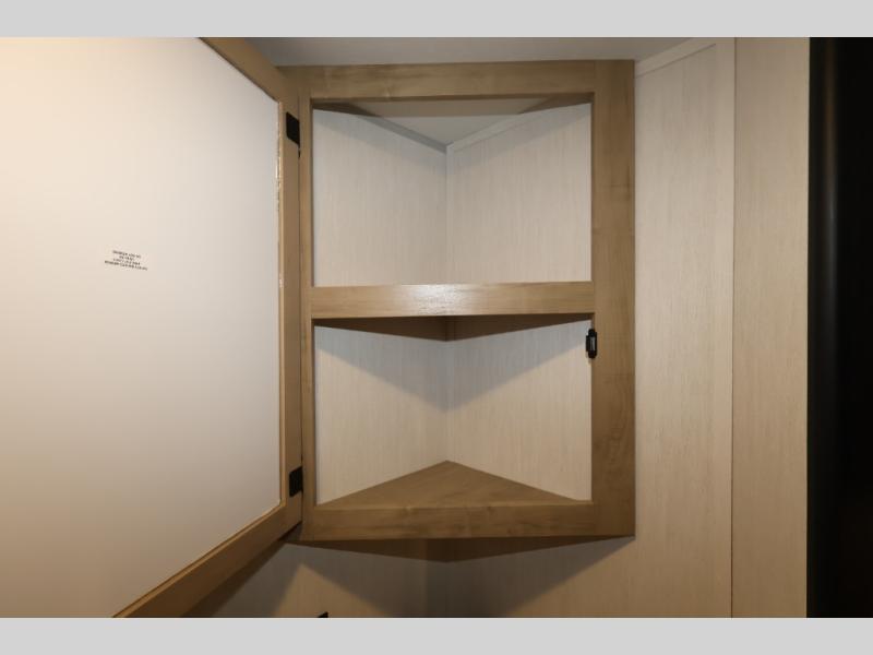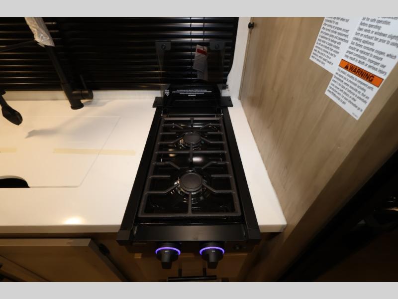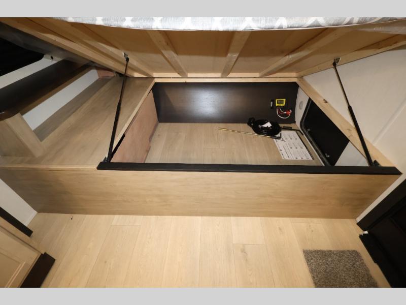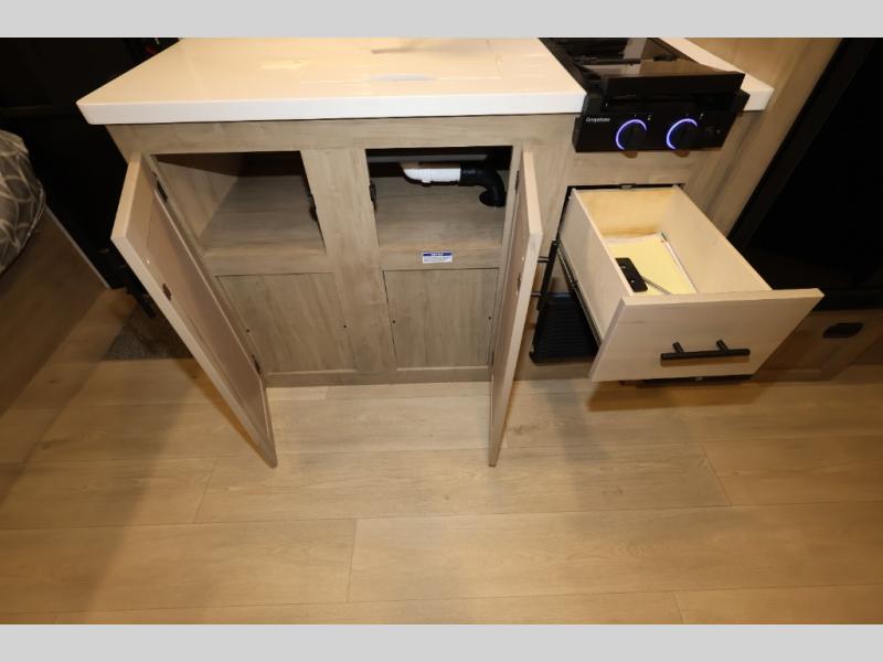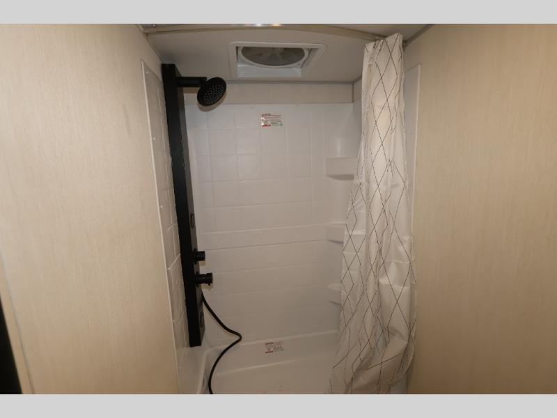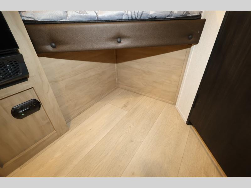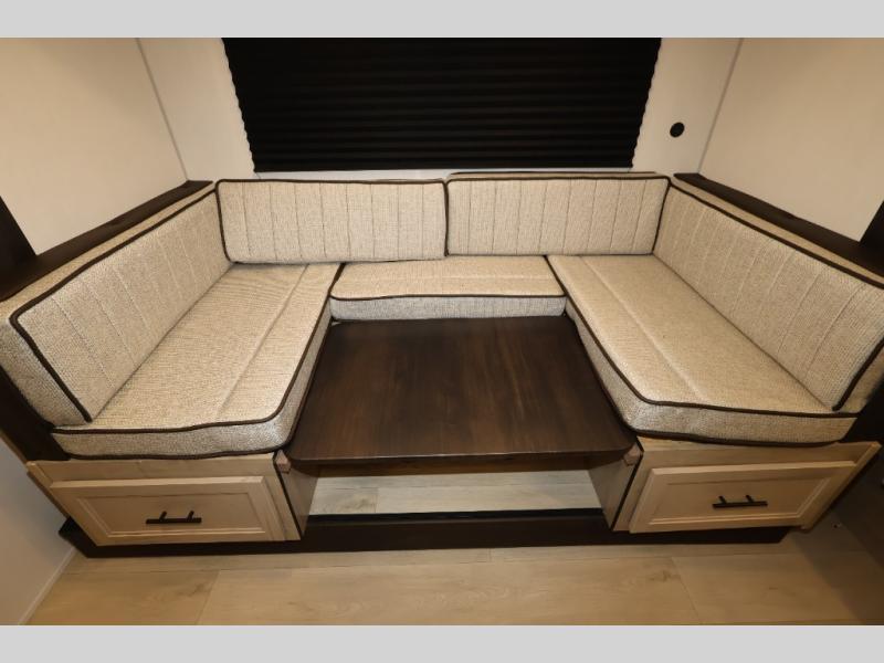 This family travel trailer is ready to head to the campground whenever you are! The kiddos can sleep on the set of double-size bed bunks, and you can sleep on the front queen bed, plus the U-shaped dinette slide can also transform into an extra sleeping space when you aren't using it to enjoy a meal. You can prepare your delicious meals on the range or at the outside mini kitchen and stay protected by the awning. The exterior not only has outside storage and an outside TV mount but also features an outside storage plus door for access to the storage space underneath the bottom bunk bed. The rear corner bath allows everyone to stay clean and refreshed while you camp.