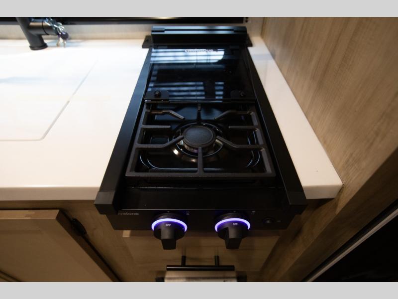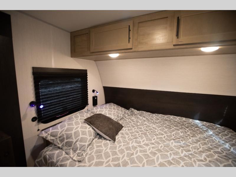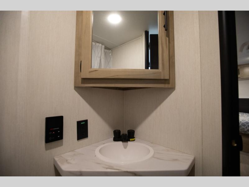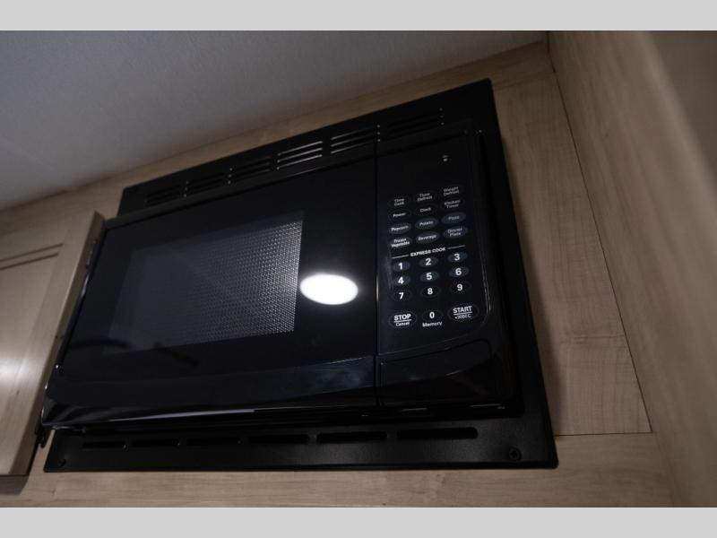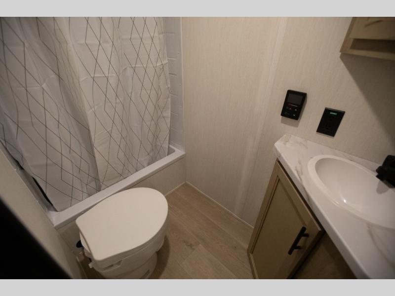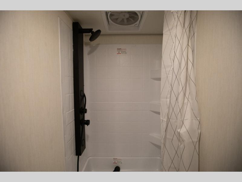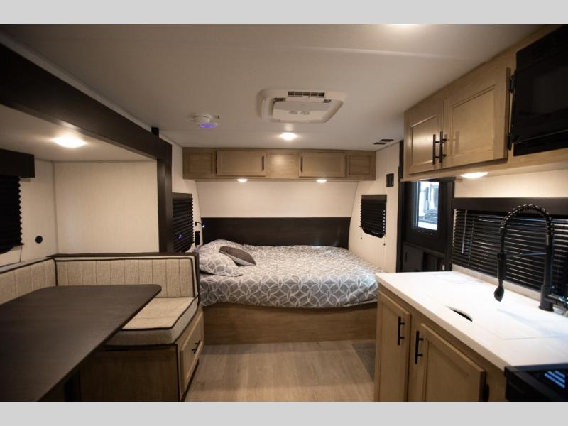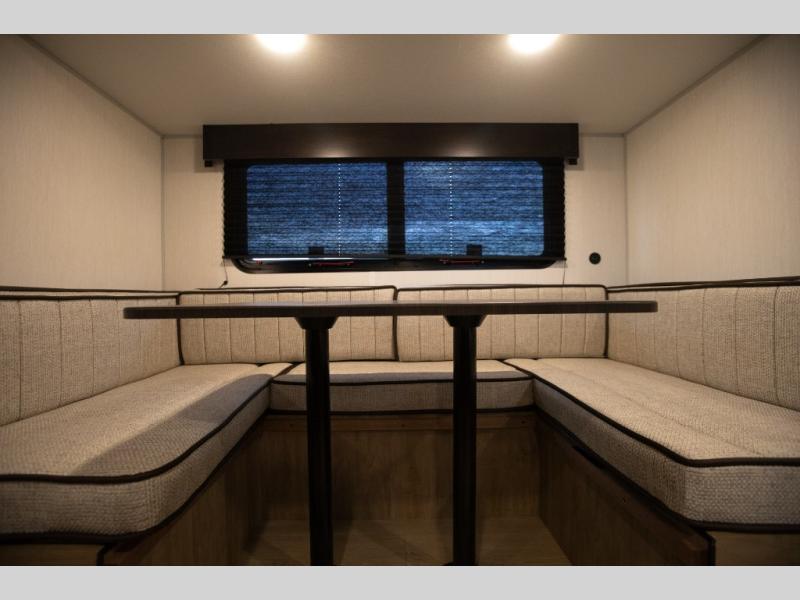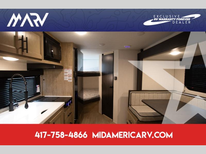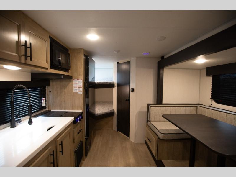 This family travel trailer is ready to head to the campground whenever you are! The kiddos can sleep on the set of double-size bed bunks, and you can sleep on the front queen bed, plus the U-shaped dinette slide can also transform into an extra sleeping space when you aren't using it to enjoy a meal. You can prepare your delicious meals on the range or at the outside mini kitchen and stay protected by the awning. The exterior not only has outside storage and an outside TV mount but also features an outside storage plus door for access to the storage space underneath the bottom bunk bed. The rear corner bath allows everyone to stay clean and refreshed while you camp.