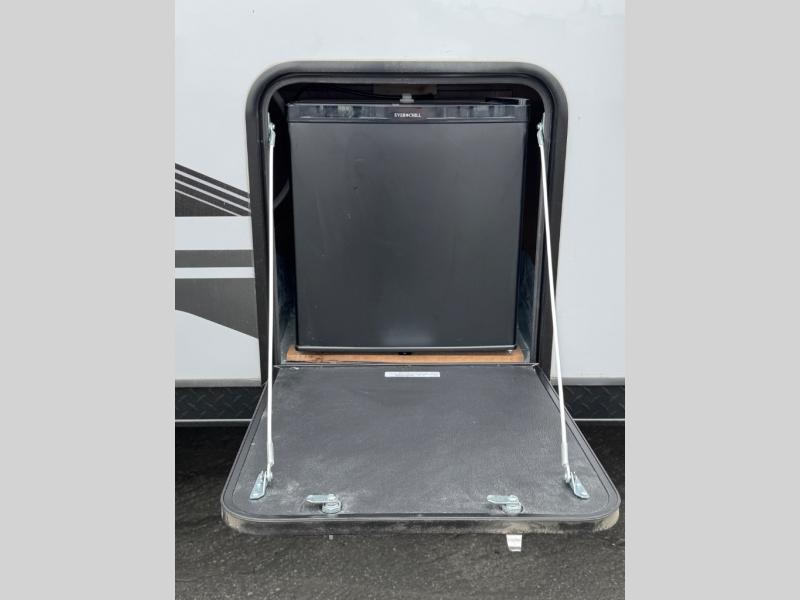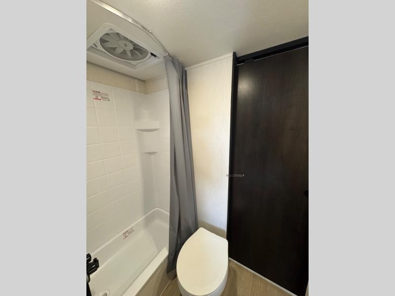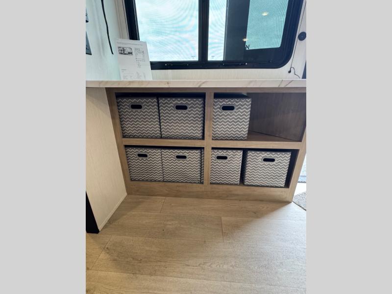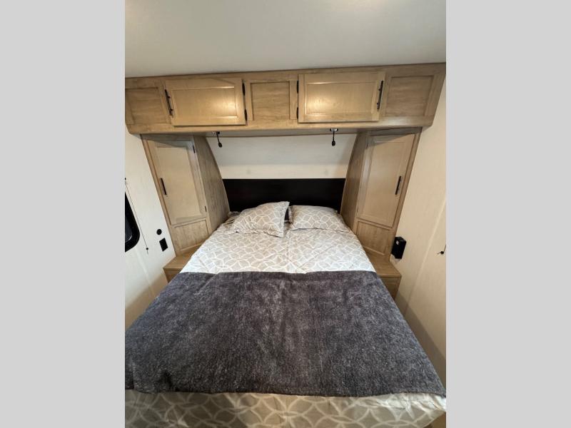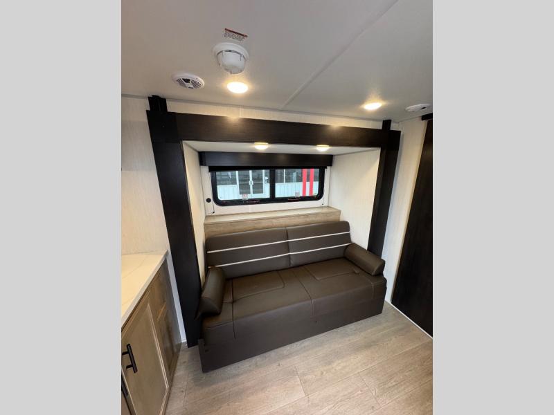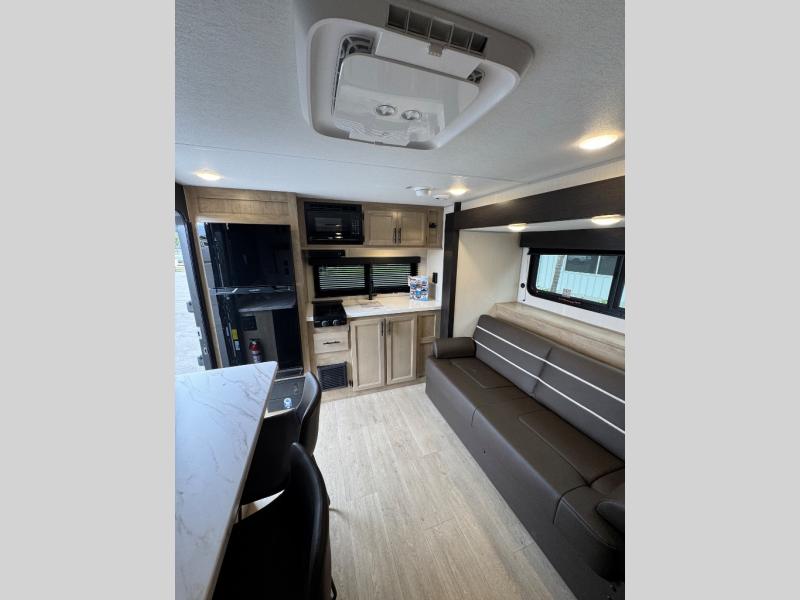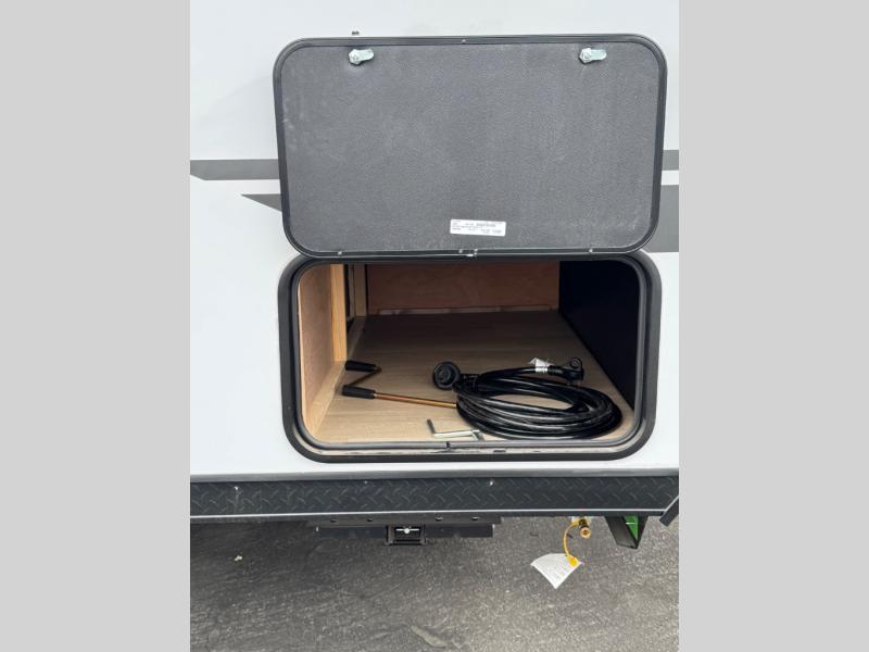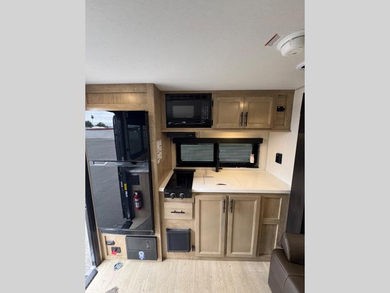 Convenient camping is found with this lightweight travel trailer! Once you arrive at your destination, put out the power awning, then make lunch on the exterior mini kitchen. Inside, you can dine at the bar top with stools, freshen up in the tub/shower, and sleep soundly on the queen bed in the master bedroom. There is also a sofa slide out to provide additional seating, sleeping, and interior space! And you're sure to find plenty of storage spaces both inside and outside, including a rear storage rack!