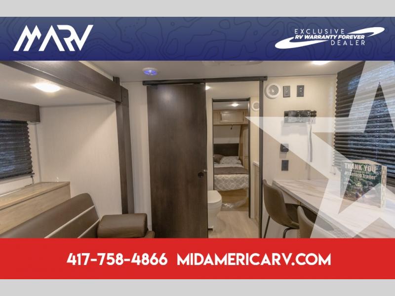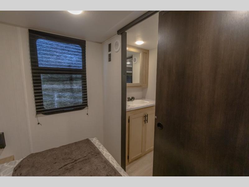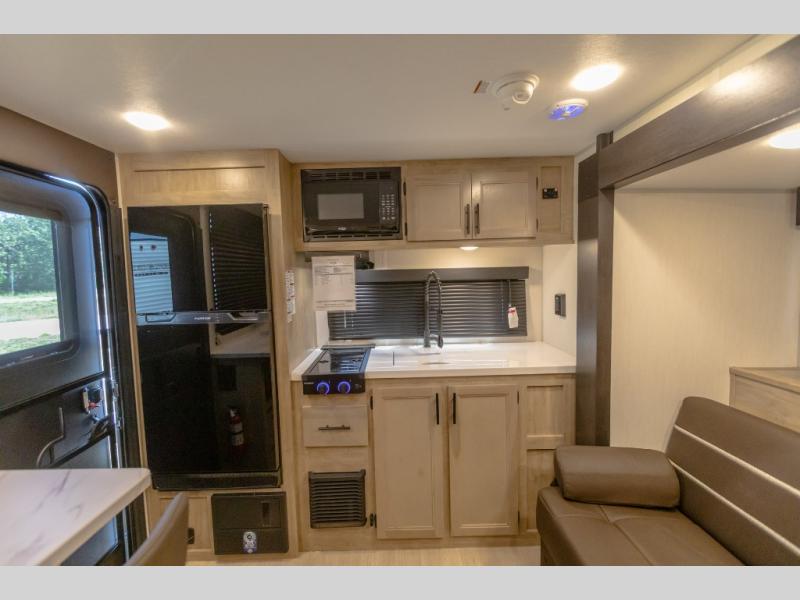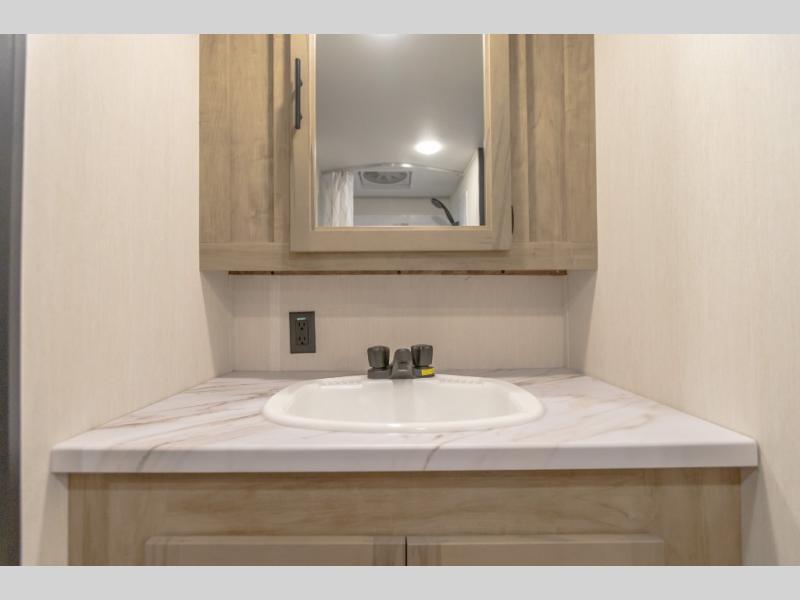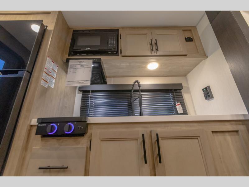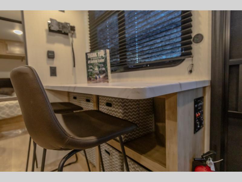 Convenient camping is found with this lightweight travel trailer! Once you arrive at your destination, put out the power awning, then make lunch on the exterior mini kitchen. Inside, you can dine at the bar top with stools, freshen up in the tub/shower, and sleep soundly on the queen bed in the master bedroom. There is also a sofa slide out to provide additional seating, sleeping, and interior space! And you're sure to find plenty of storage spaces both inside and outside, including a rear storage rack!