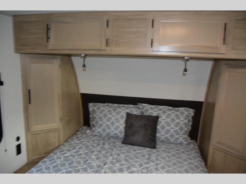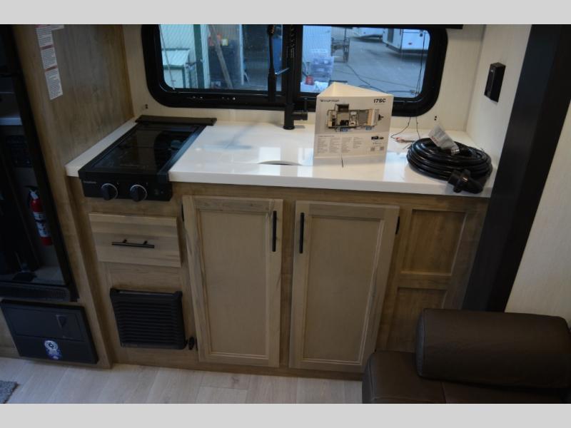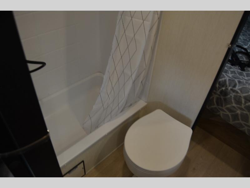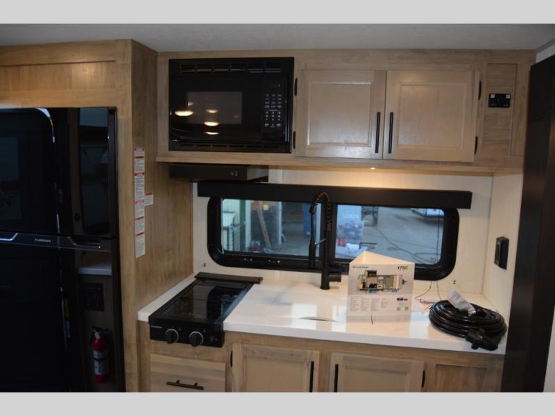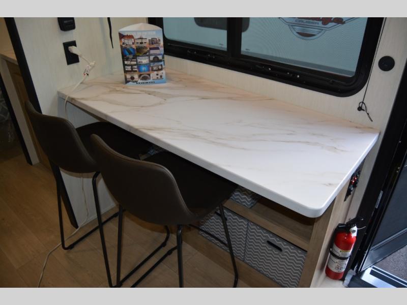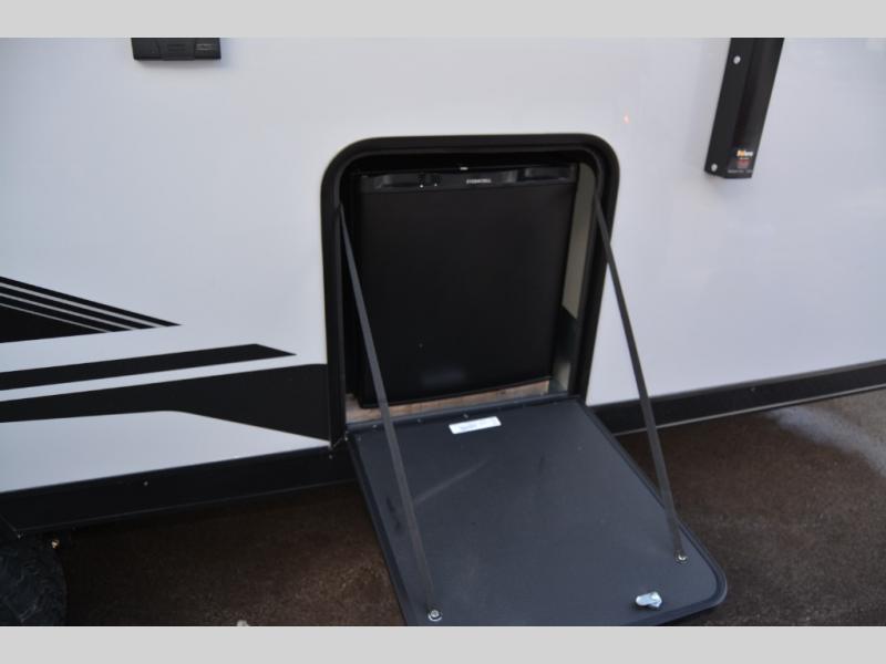 Convenient camping is found with this lightweight travel trailer! Once you arrive at your destination, put out the power awning, then make lunch on the exterior mini kitchen. Inside, you can dine at the bar top with stools, freshen up in the tub/shower, and sleep soundly on the queen bed in the master bedroom. There is also a sofa slide out to provide additional seating, sleeping, and interior space! And you're sure to find plenty of storage spaces both inside and outside, including a rear storage rack!