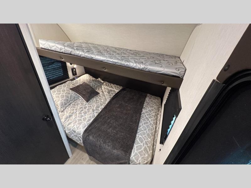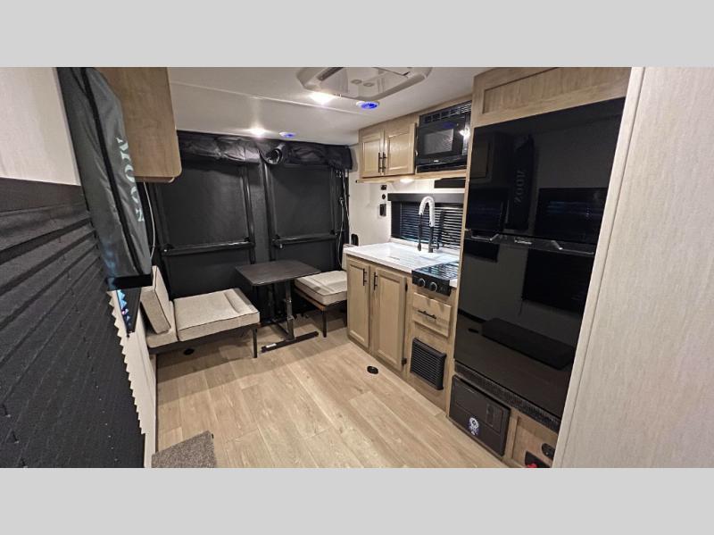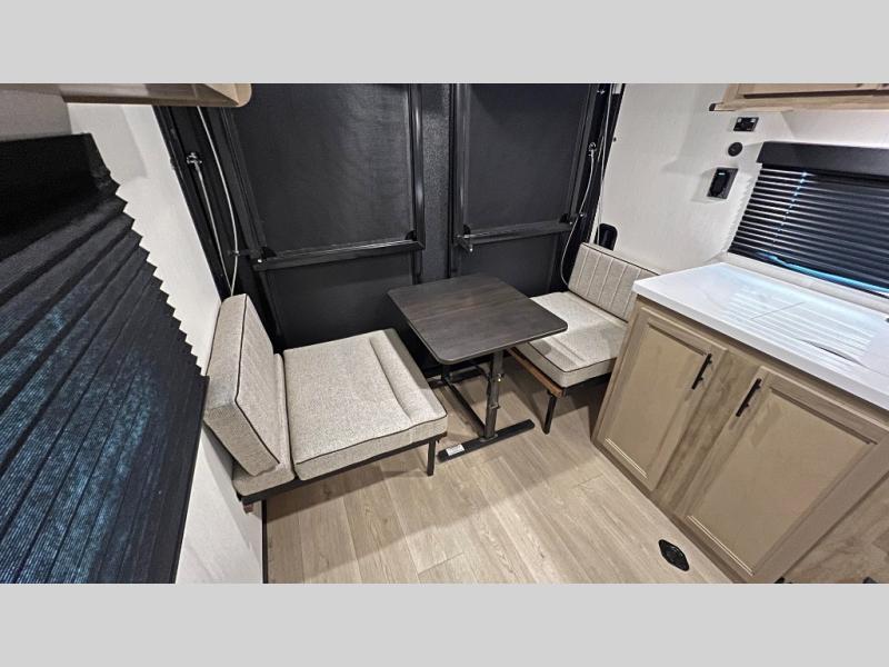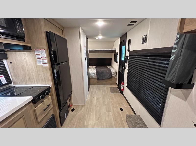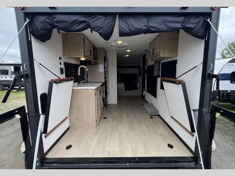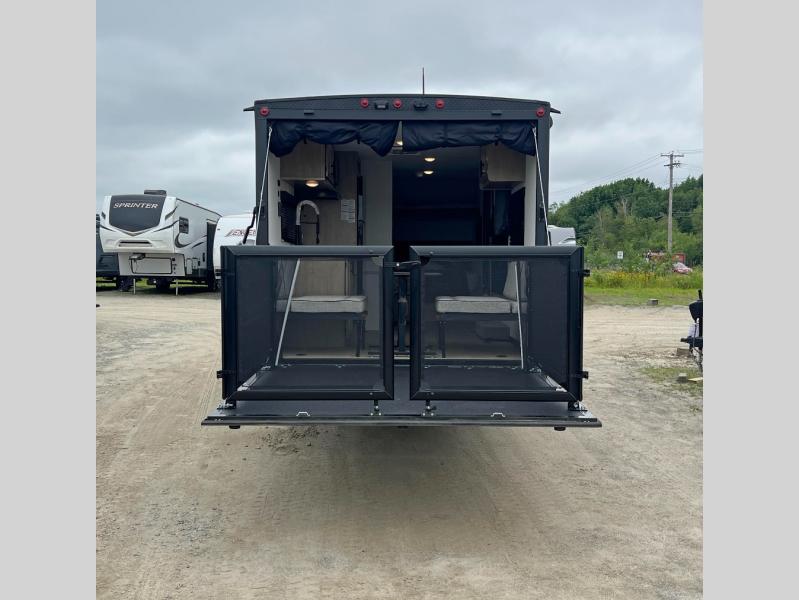 Load up your favorite off-road toys with the ramp door into the 9' 4" garage with 13' 11" total cargo space when you utilize the space up front! This model has the same layout of 18RJBBL, with an added 6 inches in width! Enjoy all of the at home features like a fully equipped kitchen with a high output cooktop, a 12V high efficiency refrigerator, and a high output microwave. Comfortably eat your delicious meals at the rear dinette with a removable table for convenience. The full bathroom has a tub/shower for you to freshen up in the morning after getting a good night's rest on the front queen bed which also has a bunk bed above it too. There is also outside storage and an outside shower with hot and cold water!