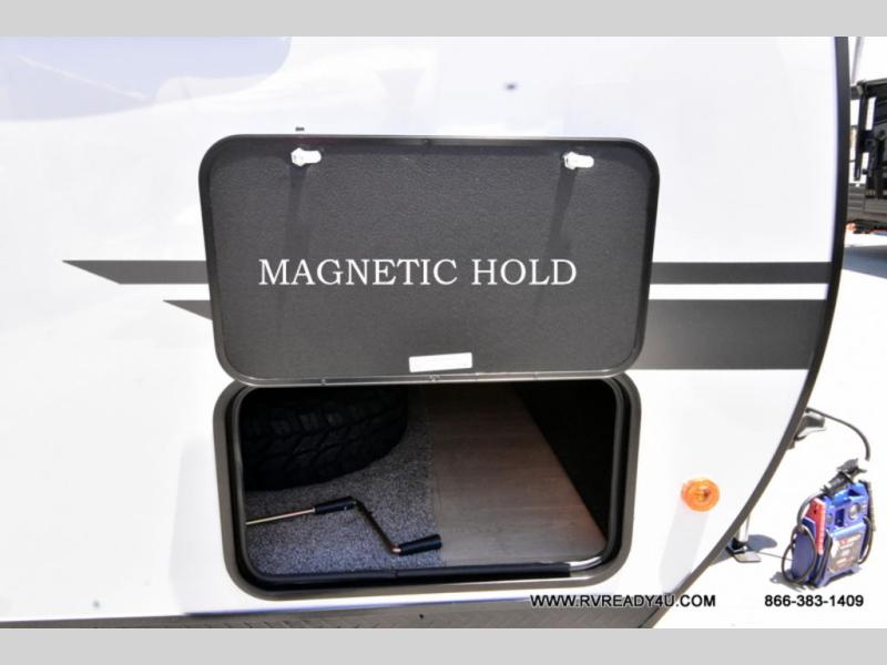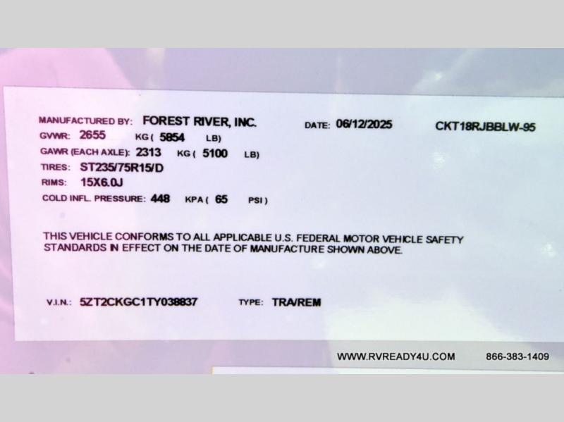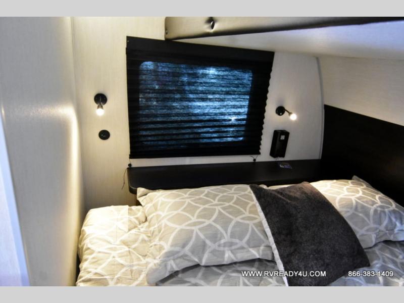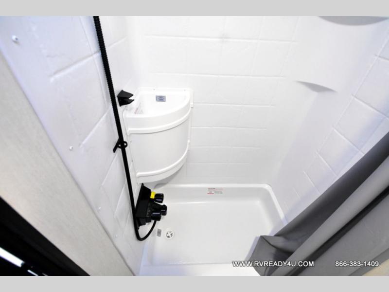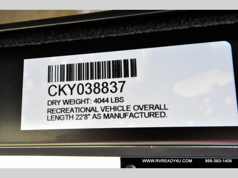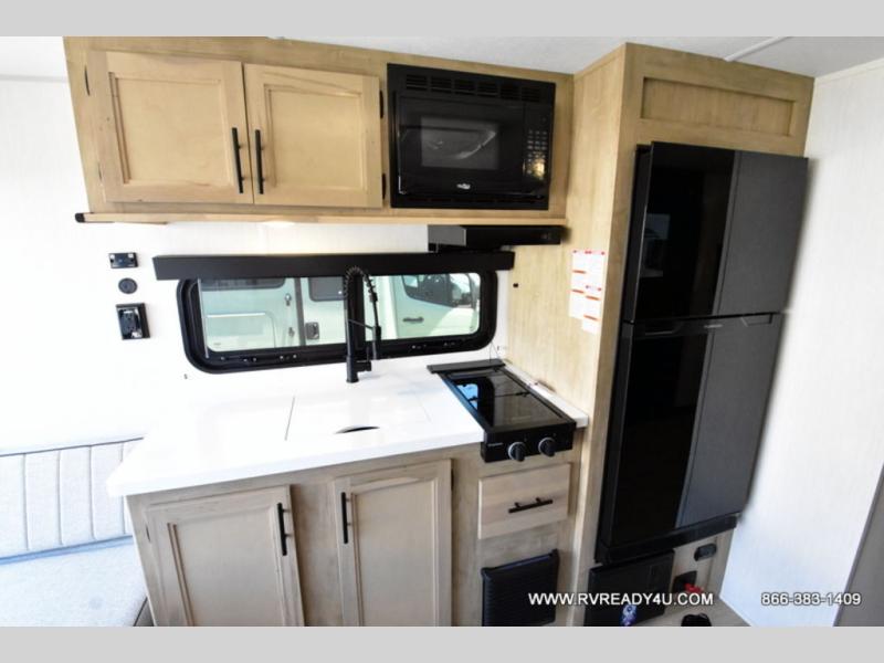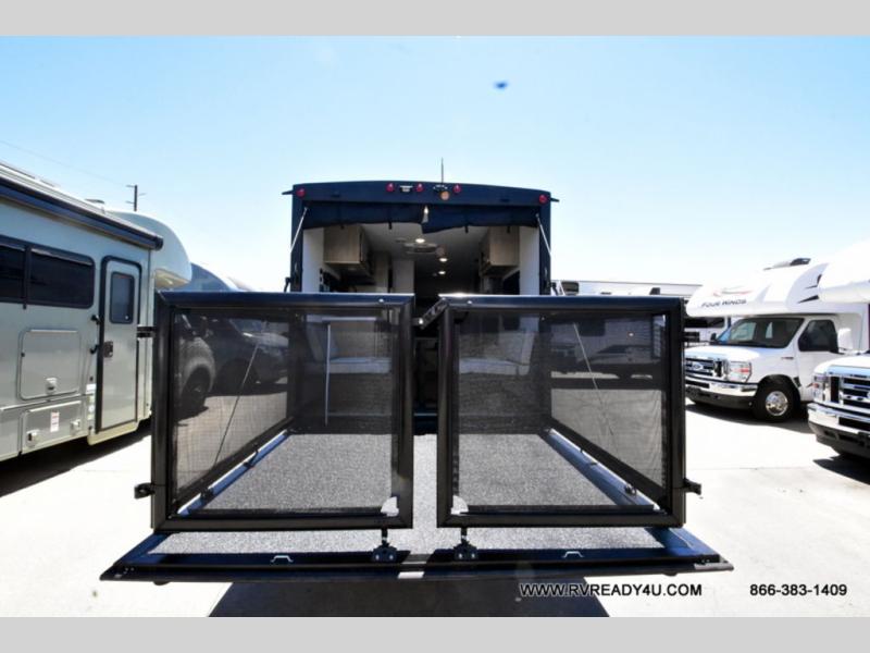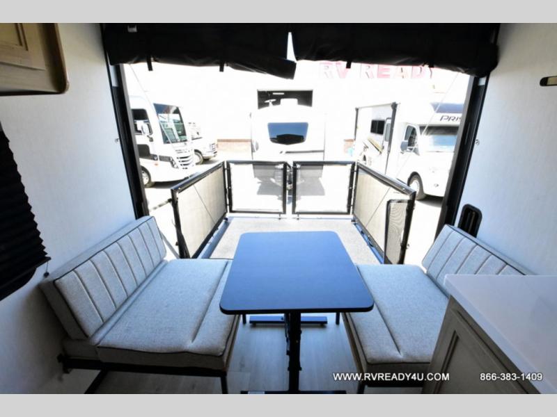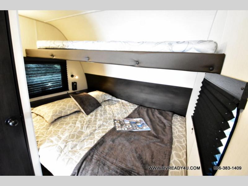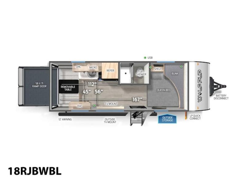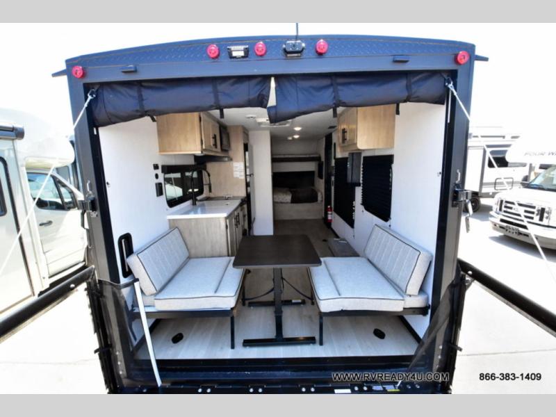 Load up your favorite off-road toys with the ramp door into the 9' 4" garage with 13' 11" total cargo space when you utilize the space up front! This model has the same layout of 18RJBBL, with an added 6 inches in width! Enjoy all of the at home features like a fully equipped kitchen with a high output cooktop, a 12V high efficiency refrigerator, and a high output microwave. Comfortably eat your delicious meals at the rear dinette with a removable table for convenience. The full bathroom has a tub/shower for you to freshen up in the morning after getting a good night's rest on the front queen bed which also has a bunk bed above it too. There is also outside storage and an outside shower with hot and cold water!