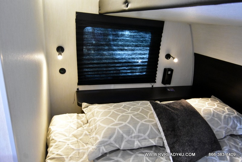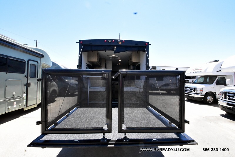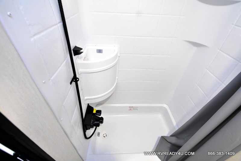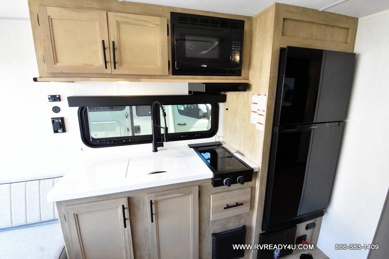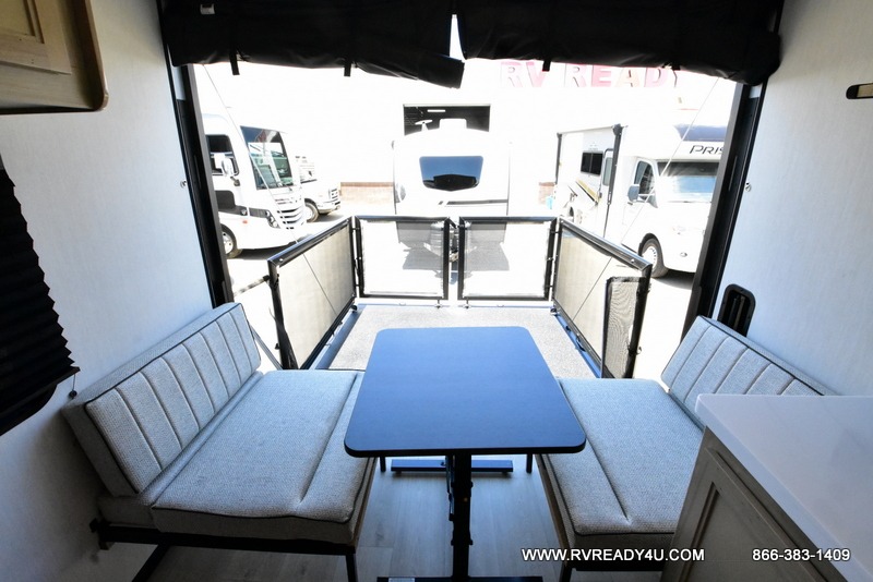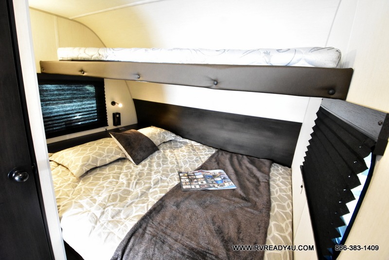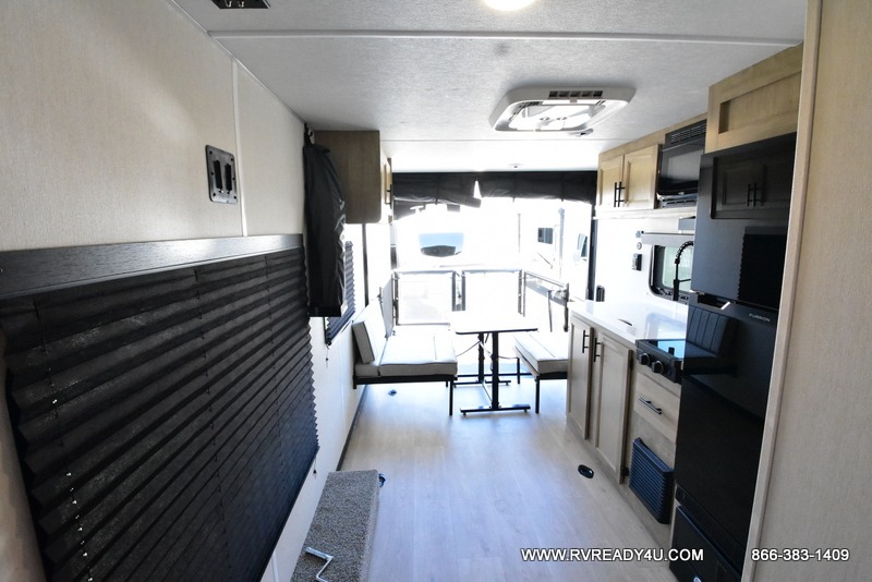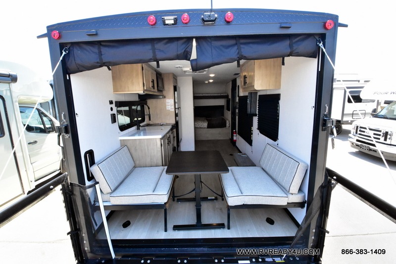 Load up your favorite off-road toys with the ramp door into the 9' 4" garage with 13' 11" total cargo space when you utilize the space up front! This model has the same layout of 18RJBBL, with an added 6 inches in width! Enjoy all of the at home features like a fully equipped kitchen with a high output cooktop, a 12V high efficiency refrigerator, and a high output microwave. Comfortably eat your delicious meals at the rear dinette with a removable table for convenience. The full bathroom has a tub/shower for you to freshen up in the morning after getting a good night's rest on the front queen bed which also has a bunk bed above it too. There is also outside storage and an outside shower with hot and cold water!