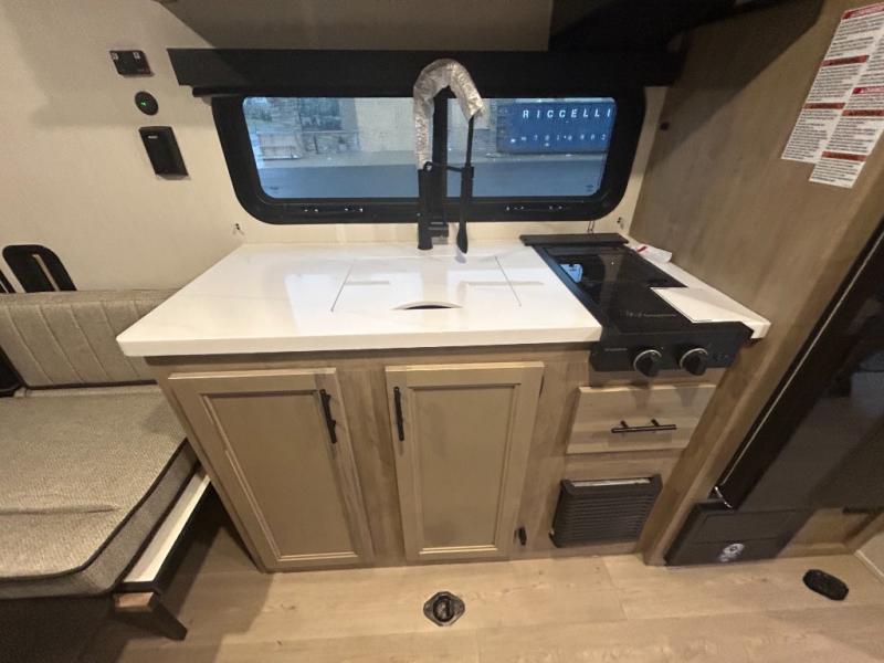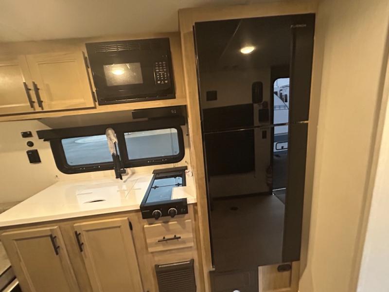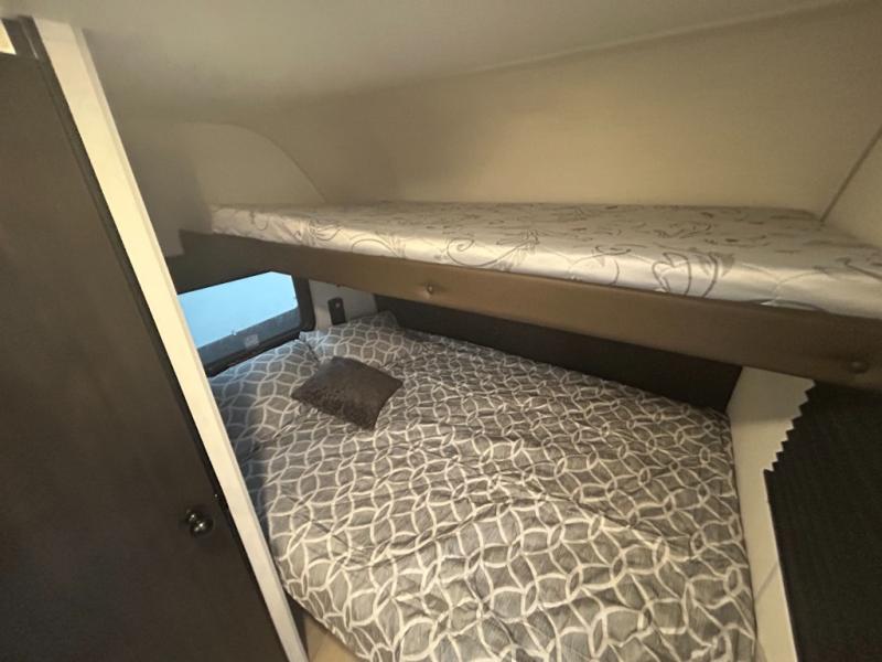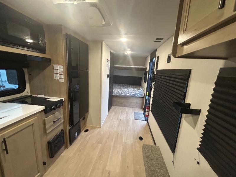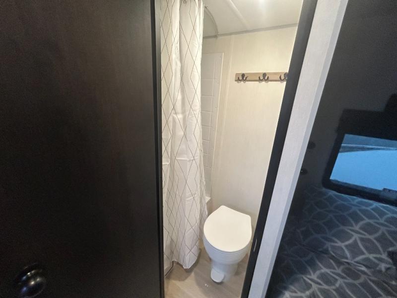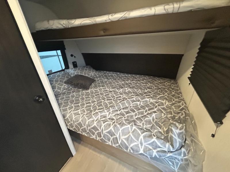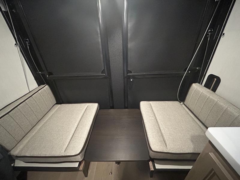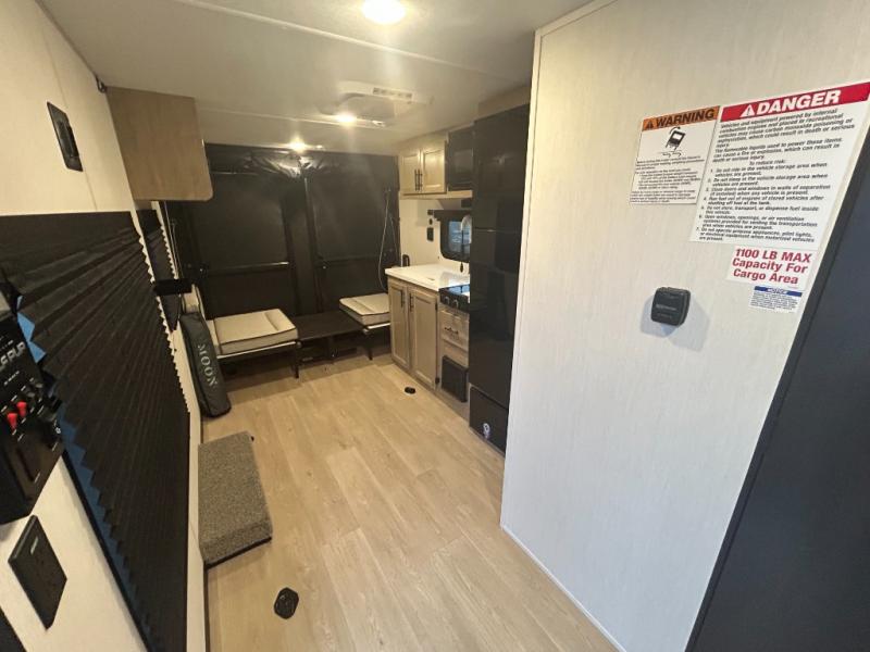 Load up your favorite off-road toys with the ramp door into the 9' 4" garage with 13' 11" total cargo space when you utilize the space up front! Enjoy all of the at home features like a fully equipped kitchen with a cooktop, refrigerator, and a microwave. Comfortably eat your delicious meals at the rear dinette with a removable table for convenience. The private bathroom has a tub/shower for you to freshen up in the morning after getting a good night's rest on the front queen bed which also has a bunk bed above it too. There is also outside storage for your hiking or riding gear!