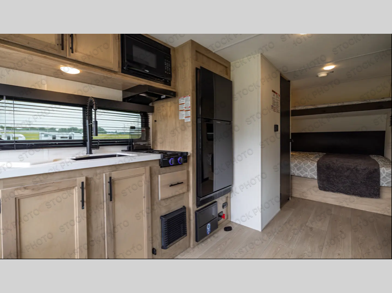 Load up your favorite off-road toys with the ramp door into the 9' 4" garage with 13' 11" total cargo space when you utilize the space up front! Enjoy all of the at home features like a fully equipped kitchen with a cooktop, refrigerator, and a microwave. Comfortably eat your delicious meals at the rear dinette with a removable table for convenience. The private bathroom has a tub/shower for you to freshen up in the morning after getting a good night's rest on the front queen bed which also has a bunk bed above it too. There is also outside storage for your hiking or riding gear!