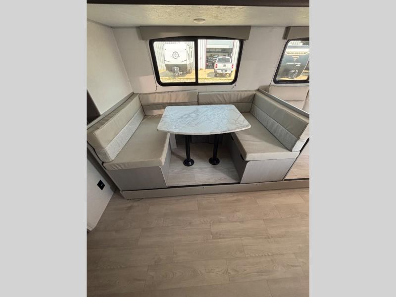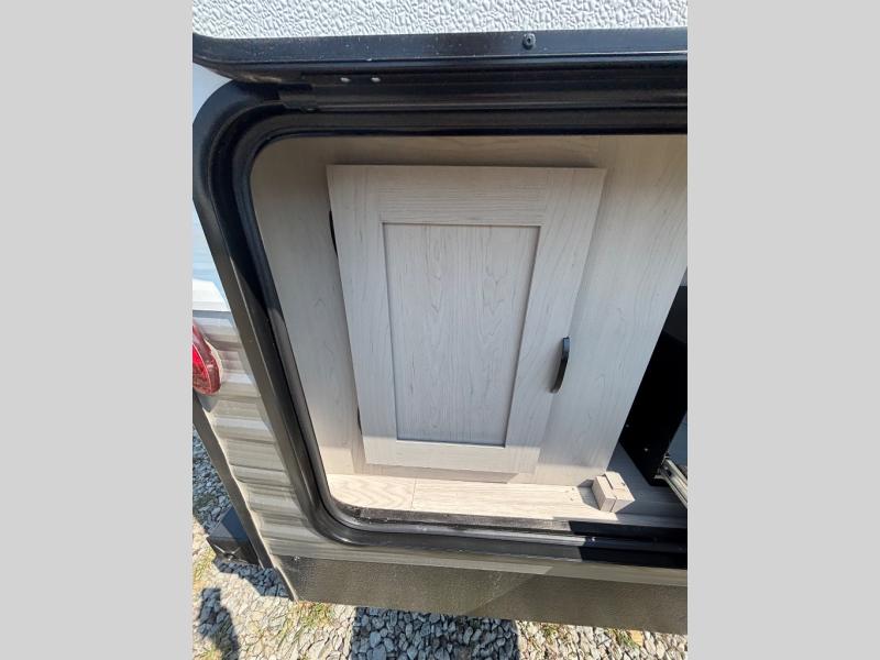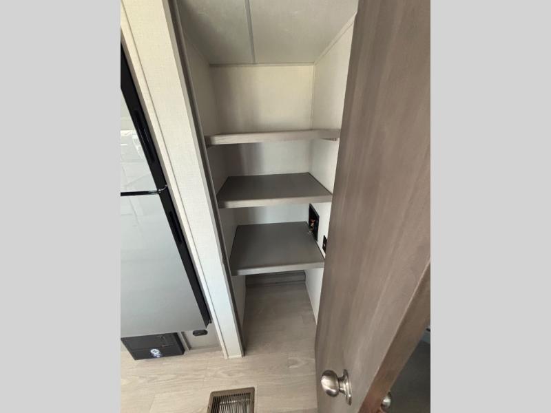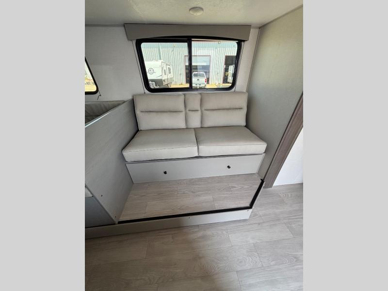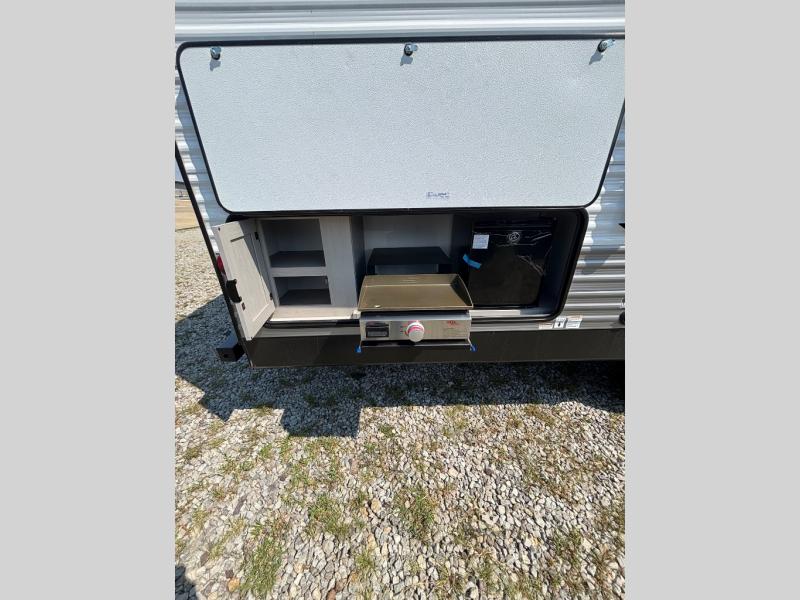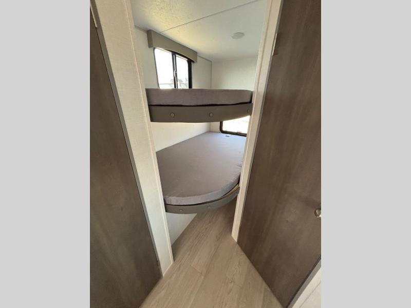 Pack your bags and head to the campground in this spacious travel trailer for eight! The owners will love having their own space in the front private bedroom, complete with an RV queen bed and dual wardrobes and shelves. There are double-size bunks in the rear corner, with the full bath in the other rear corner for easy nighttime use. Everyone can meet in the combined living area and kitchen while the cook makes breakfast. There is a sofa and booth dinette within the large slide out and an entertainment center with an optional fireplace if you want to make this space more cozy. This unit also includes a large pantry with washer and dryer prep, giving you the option to add these appliances, and an optional camp kitchen can be added for the cook who loves being outdoors!