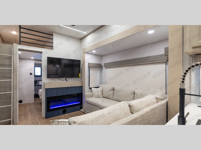 Camping with friends and family just got a whole lot easier in this spacious fifth wheel! Up front, you'll find a private bedroom with a queen bed slide out, a dresser, a wardrobe with a shelf, plus washer and dryer prep if you plan to go full-time. The master bedroom towards the back includes a queen bed slide out, a wardrobe and a dresser, plus a full rear bath with a unique rear entry door. There is also a 60" x 72" queen loft bed above this rear room for added sleeping or storage space! Everyone can meet in the middle kitchen and living room that includes a pull-out table with chairs, an L-shaped sofa, and an entertainment center with a fireplace.