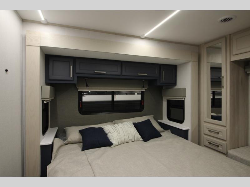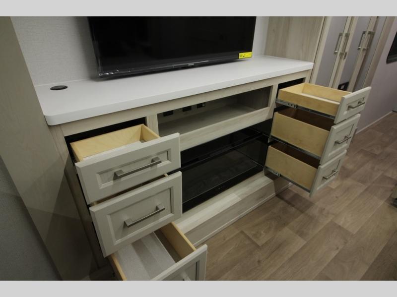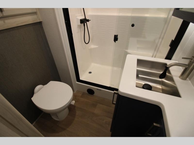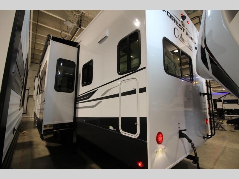 Experience a different camping life with residential furnishings and high-end features in each one of these Forest River Columbus fifth wheels! Durable construction begins with a 101" wide body, an all-welded aluminum frame superstructure, and high-gloss fiberglass vacuum bonded walls and slide out ends with dual Azdel. You will appreciate the Lippert axles, MORryde CRE 3000 suspension system, and 16" wheels with nitrogen-filled tires for a smooth tow from home to campground. Additional exterior features include a tire pressure monitoring system, a heated utility convenience center, an outside sprayer, and slam latch on all the storage doors. Inside, you'll be met with many luxurious amenities, including residential style crown molding throughout, roller day/night shades, upgraded true solid surface countertops in the bath and kitchen, plus solid wood steps.