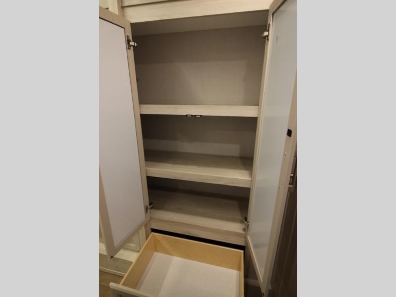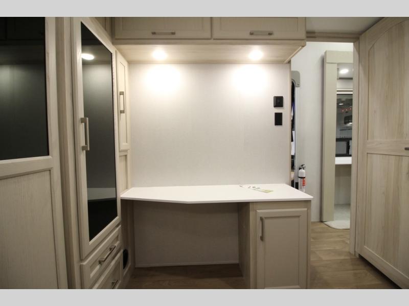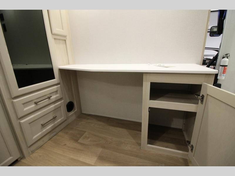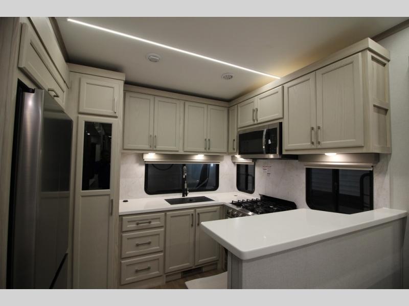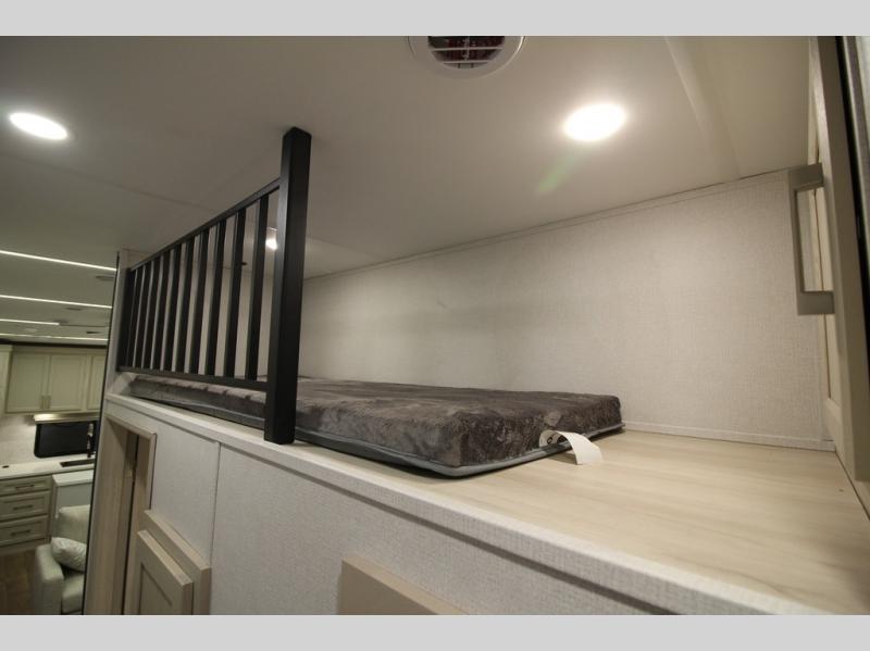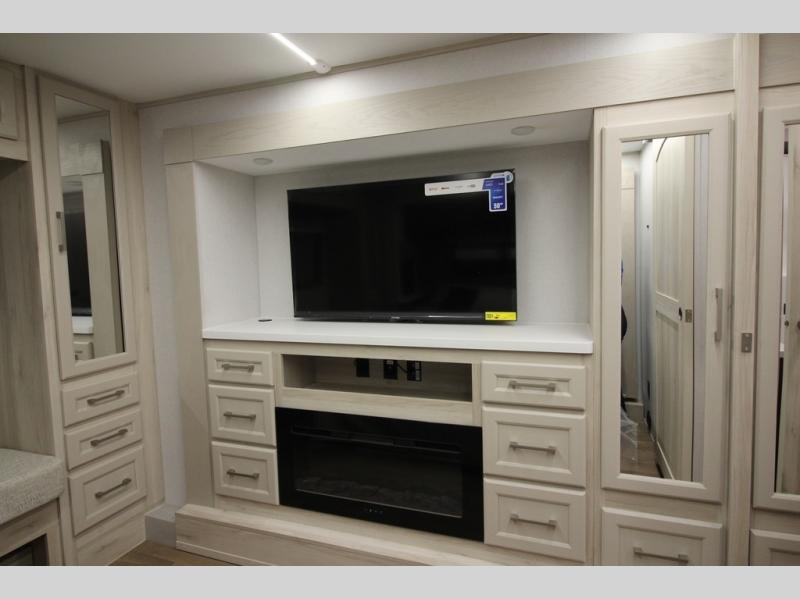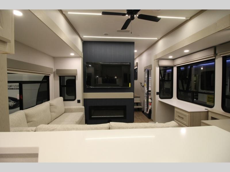 If you enjoy camping with a large group of family or friends, this fifth wheel will be perfect for you! There are five slides, giving your crew plenty of space to relax, plus there is a mid-bunk room with a tri-fold sofa, a 30" x 68" bunk, and a desk. And above this room is a 30" x 68" loft for even more sleeping or storage space. You can claim the front private bedroom all to yourselves which includes a king bed, front bench with dual wardrobes, plus a bedroom fireplace and Smart TV. Everyone can enjoy visiting together in the middle living room on the L-lounge by the entertainment center with a second fireplace. There is a table and chairs for dining space, plus a desk with a chair if you need to get some work done. And don't overlook the rear kitchen with a large refrigerator and pantry, all the appliances to make meals, plus ample counter space, including a bar top that overlooks the main living area!