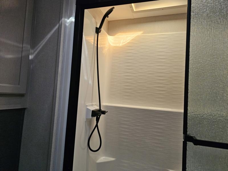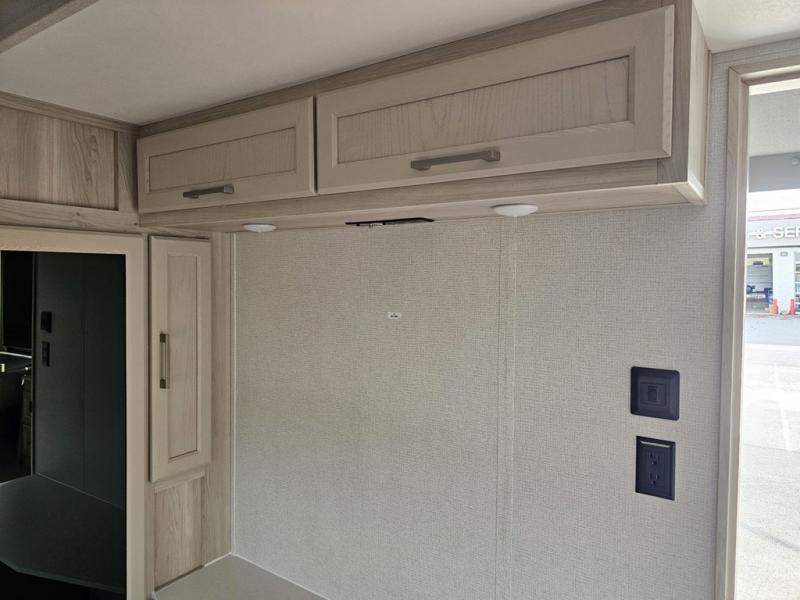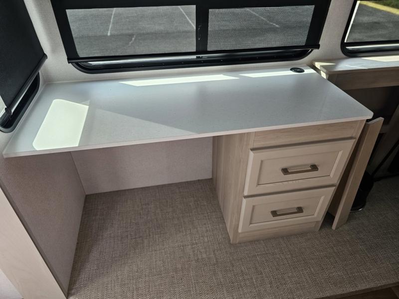If you enjoy camping with a large group of family or friends, this fifth wheel will be perfect for you! There are five slides, giving your crew plenty of space to relax, plus there is a mid-bunk room with a tri-fold sofa, a 30" x 68" bunk, and a desk. And above this room is a 30" x 68" loft for even more sleeping or storage space. You can claim the front private bedroom all to yourselves which includes a king bed, front bench with dual wardrobes, plus a bedroom fireplace and Smart TV. Everyone can enjoy visiting together in the middle living room on the L-lounge by the entertainment center with a second fireplace. There is a table and chairs for dining space, plus a desk with a chair if you need to get some work done. And don't overlook the rear kitchen with a large refrigerator and pantry, all the appliances to make meals, plus ample counter space, including a bar top that overlooks the main living area!