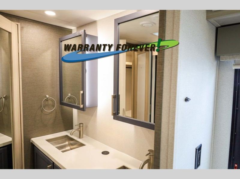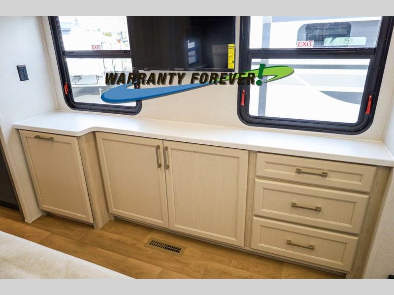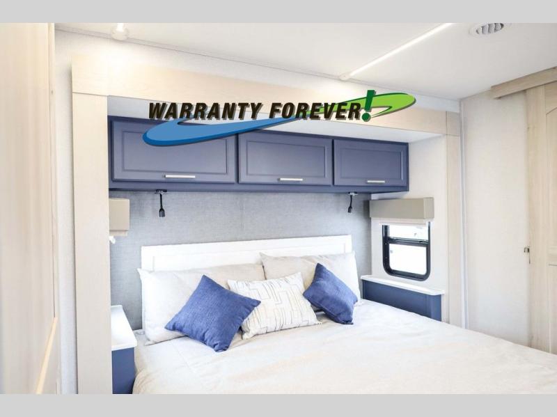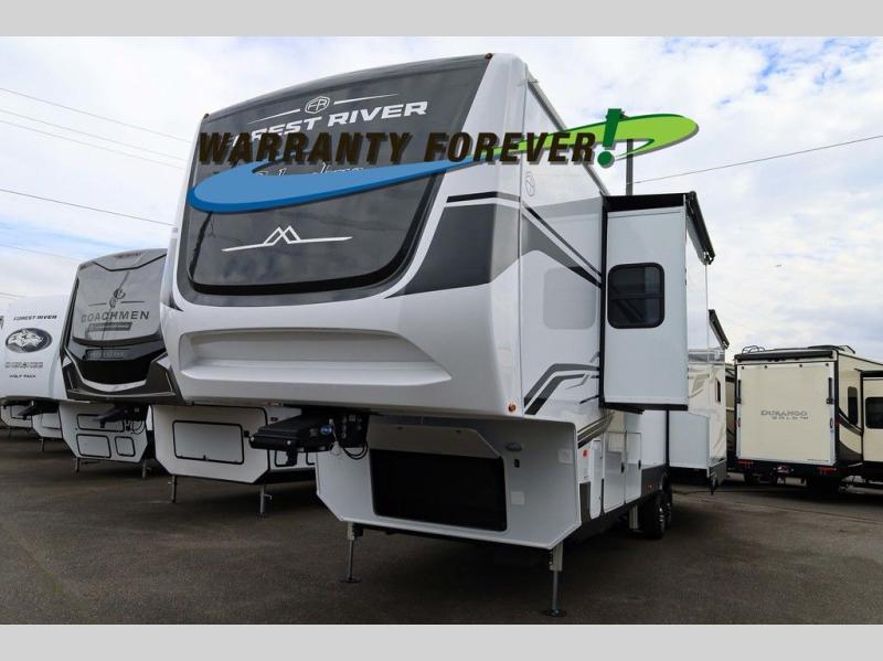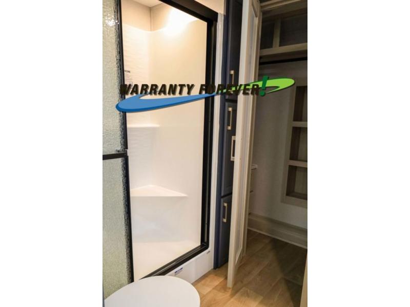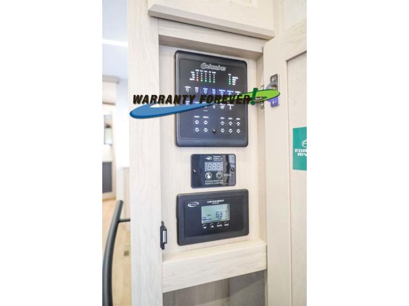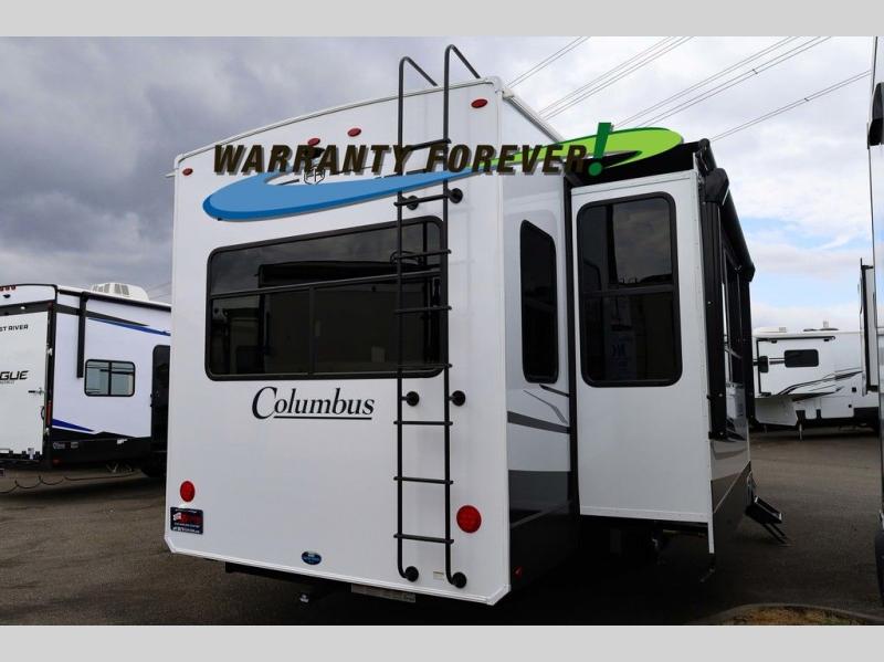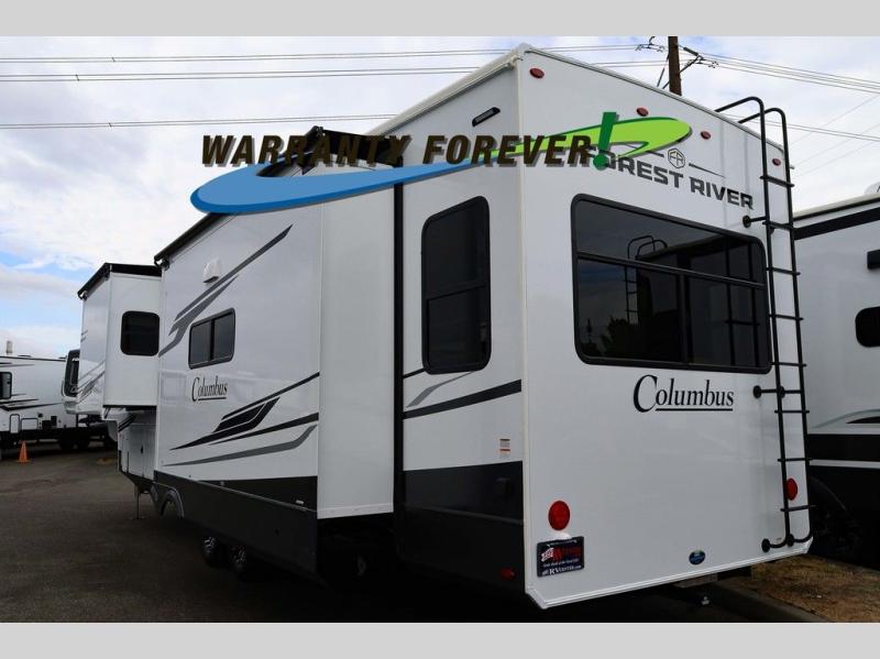 Experience a different camping life with residential furnishings and high-end features in each one of these Forest River Columbus fifth wheels! Durable construction begins with a 101" wide body, an all-welded aluminum frame superstructure, and high-gloss fiberglass vacuum bonded walls and slide out ends with dual Azdel. You will appreciate the Lippert axles, MORryde CRE 3000 suspension system, and 16" wheels with nitrogen-filled tires for a smooth tow from home to campground. Additional exterior features include a tire pressure monitoring system, a heated utility convenience center, an outside sprayer, and slam latch on all the storage doors. Inside, you'll be met with many luxurious amenities, including residential style crown molding throughout, roller day/night shades, upgraded true solid surface countertops in the bath and kitchen, plus solid wood steps.