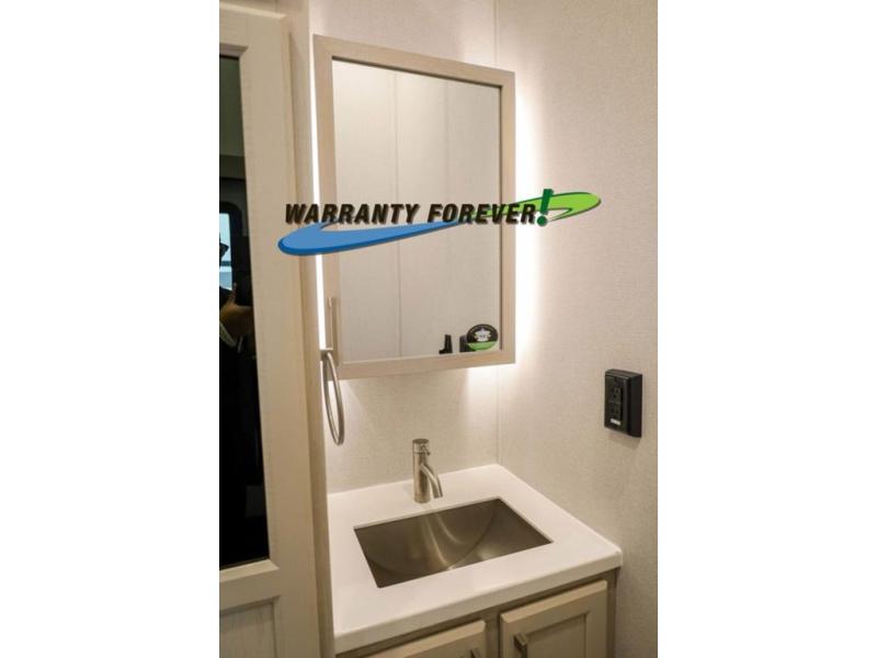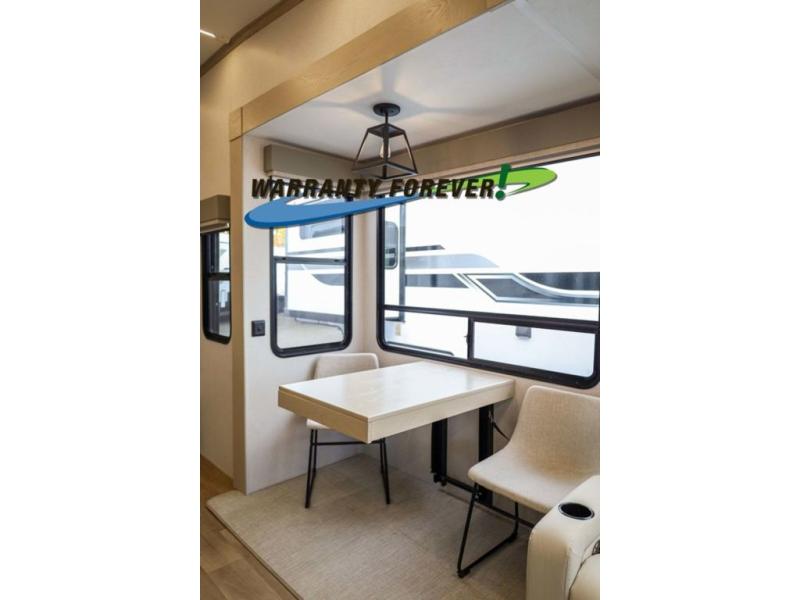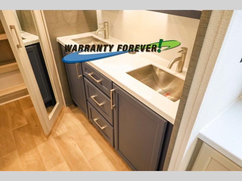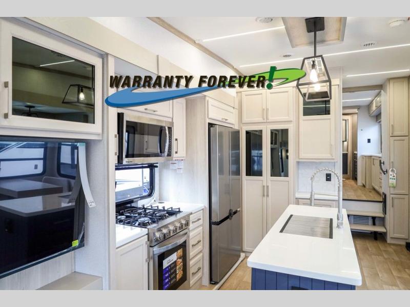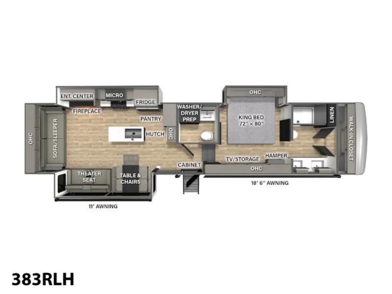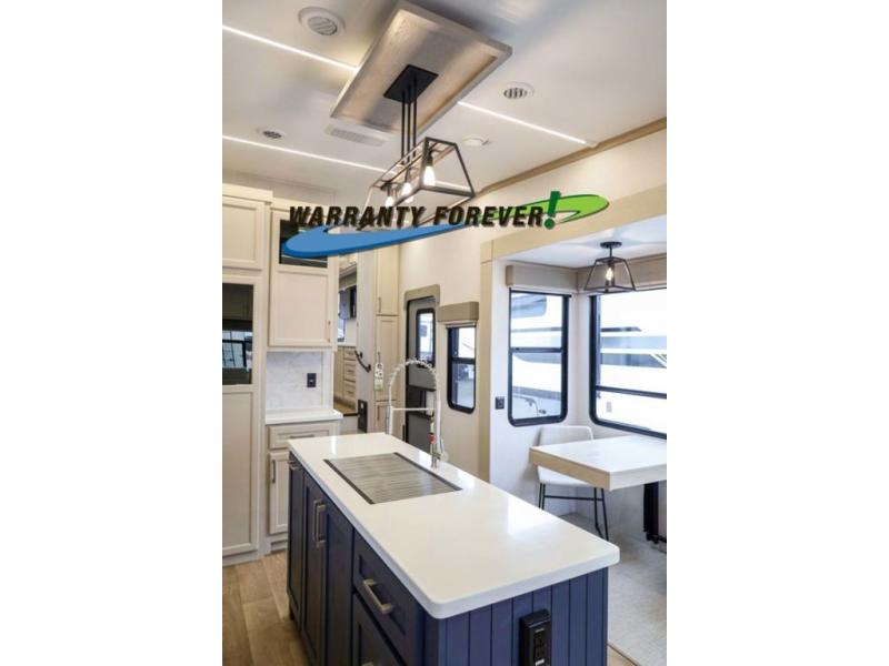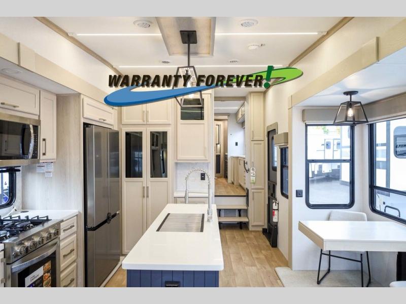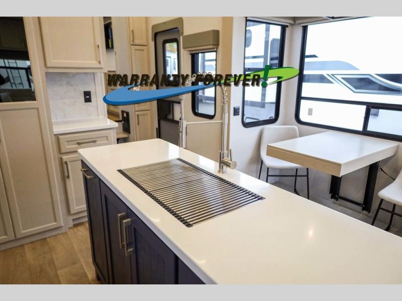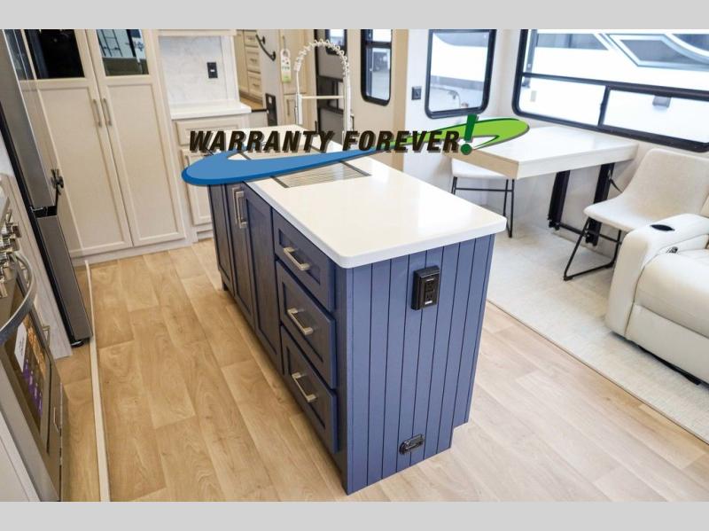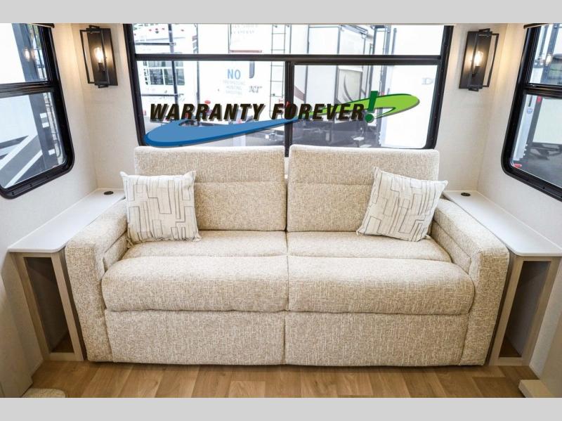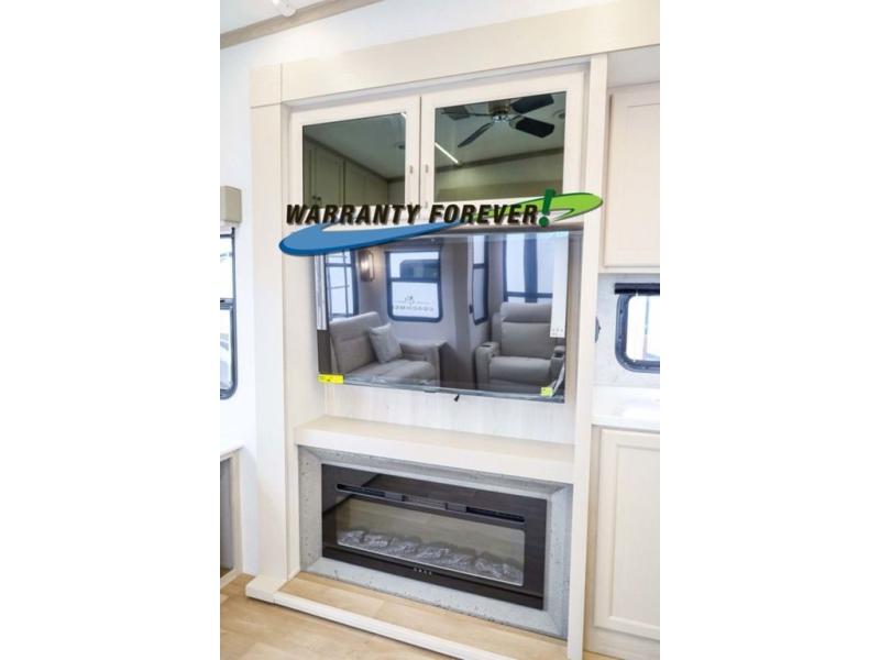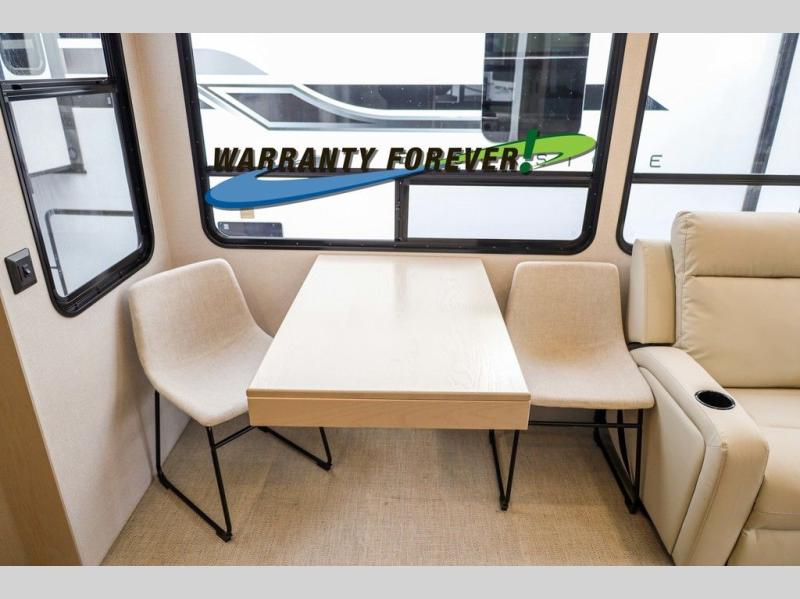 Everyone will stay clean with a bath and a half in this fifth wheel! The kitchen has a pantry big enough for everyone's favorite snacks, a gas cooktop, and a kitchen island to prepare your best meals. You can have game night indoors at the table and chairs or set up a table and chairs underneath the two power awnings. The rear living area offers a comfortable place to watch the big game too with a sofa/sleeper and theater seating directly across from the entertainment center with a 50" Smart TV and fireplace. Two can get ready at once in the front bathroom featuring a vanity with dual sinks, and since there is washer and dryer prep, you have the option to make wash day easier!