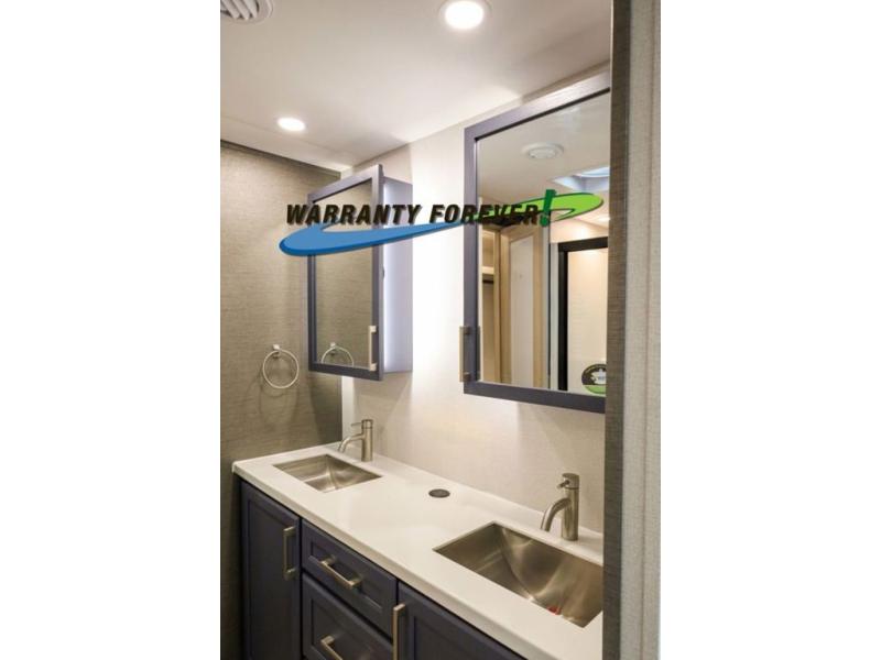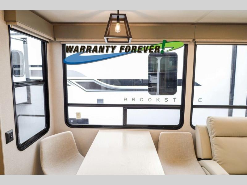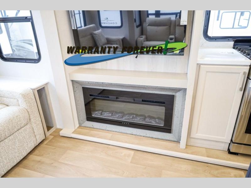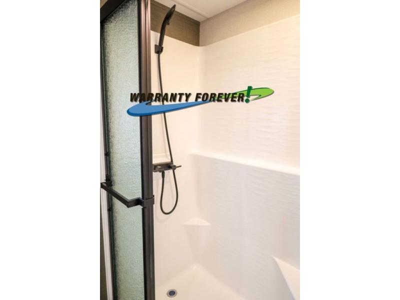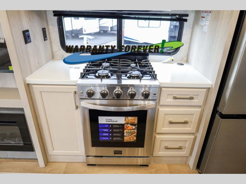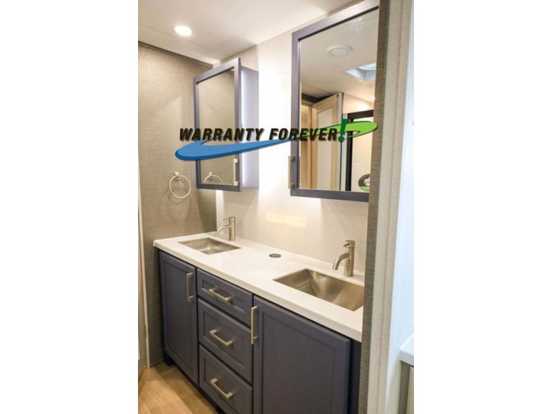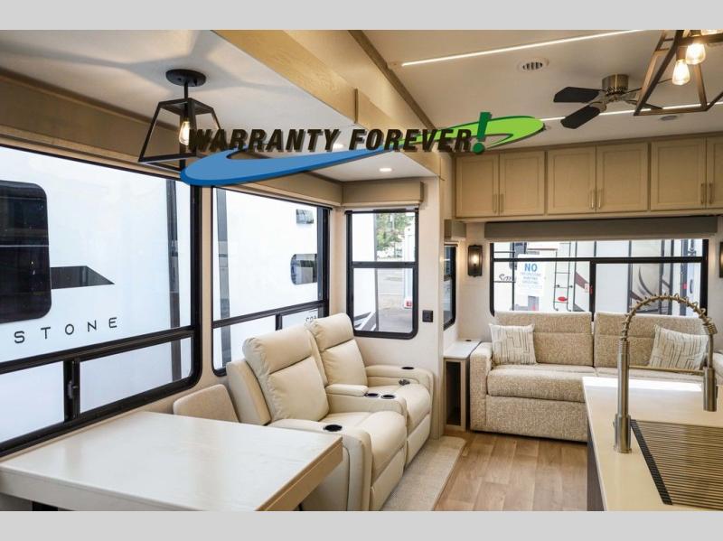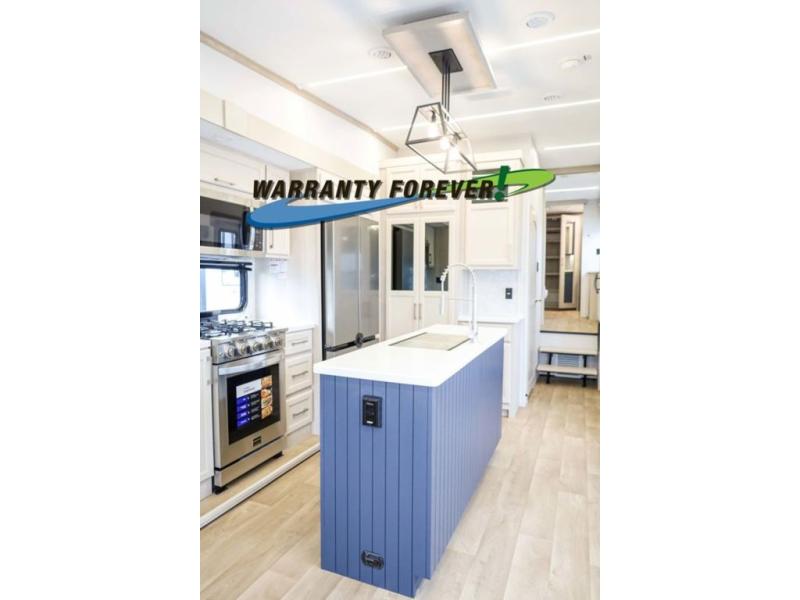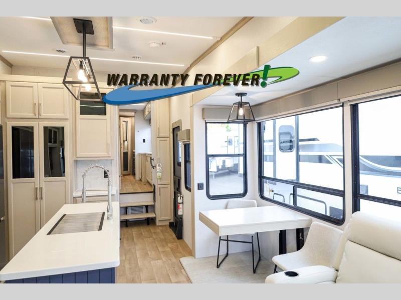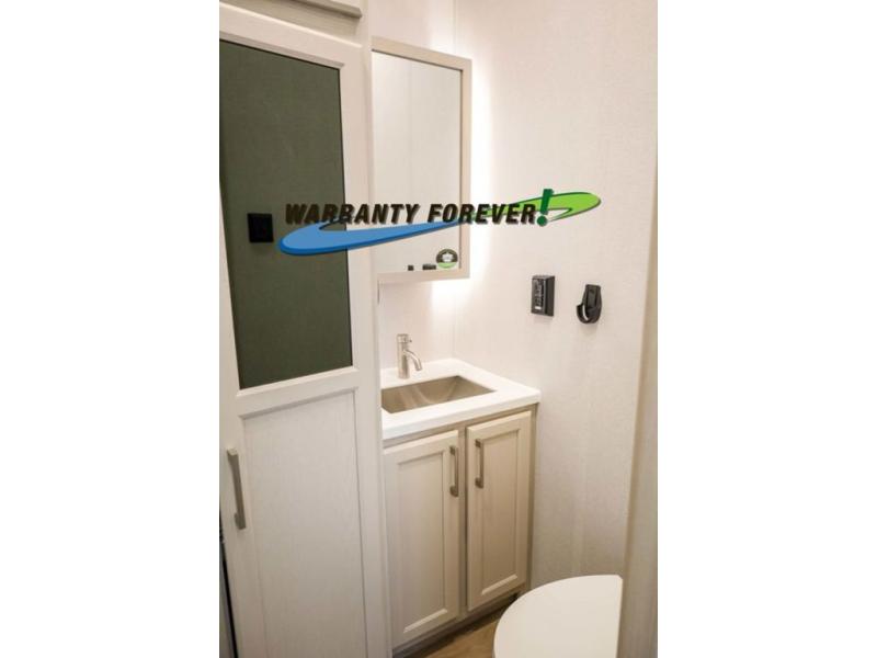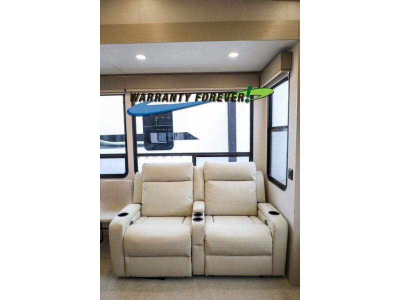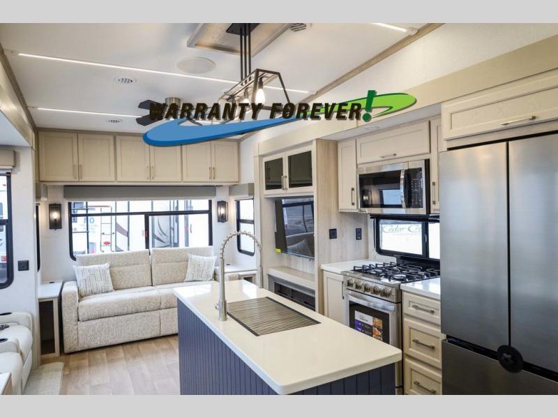 Everyone will stay clean with a bath and a half in this fifth wheel! The kitchen has a pantry big enough for everyone's favorite snacks, a gas cooktop, and a kitchen island to prepare your best meals. You can have game night indoors at the table and chairs or set up a table and chairs underneath the two power awnings. The rear living area offers a comfortable place to watch the big game too with a sofa/sleeper and theater seating directly across from the entertainment center with a 50" Smart TV and fireplace. Two can get ready at once in the front bathroom featuring a vanity with dual sinks, and since there is washer and dryer prep, you have the option to make wash day easier!