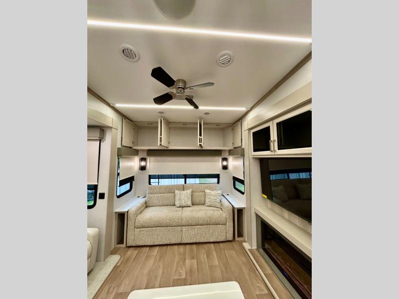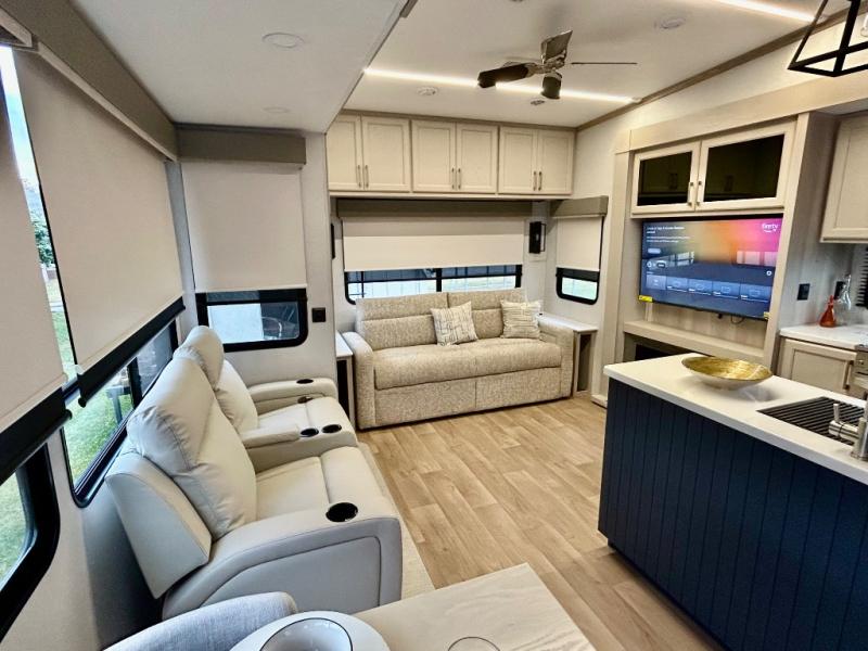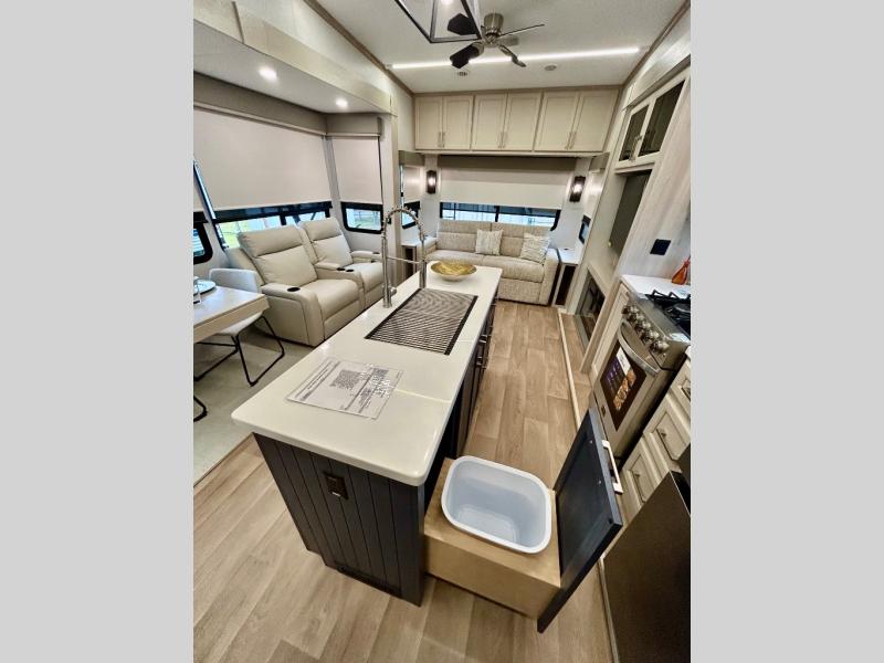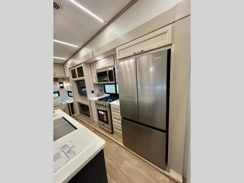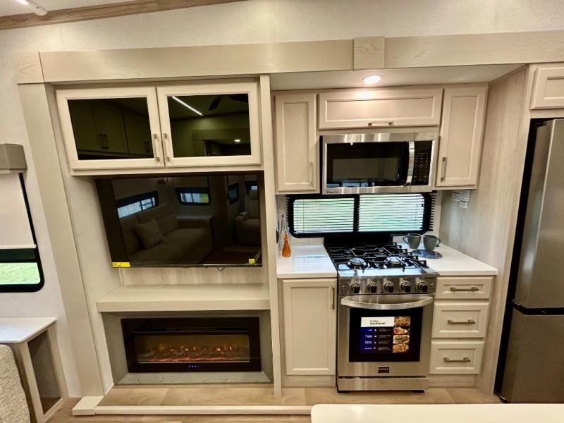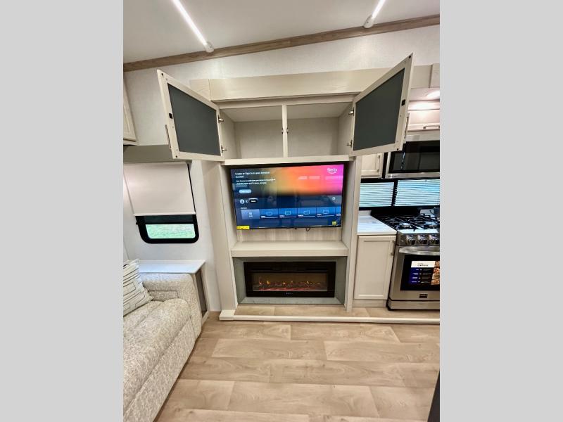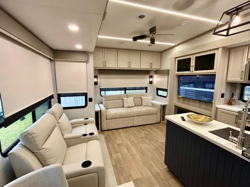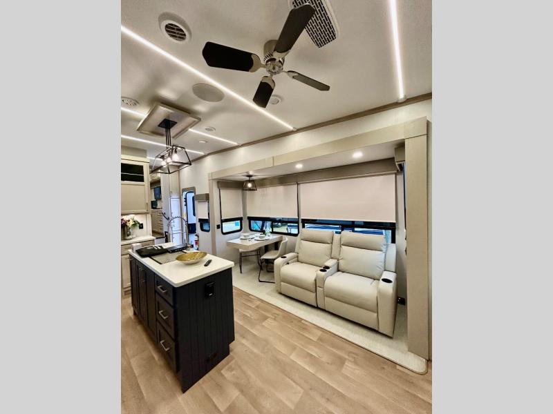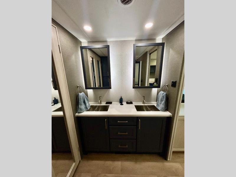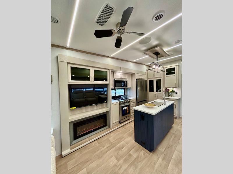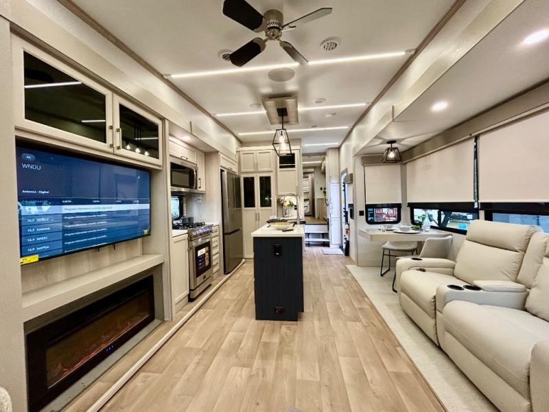Everyone will stay clean with a bath and a half in this fifth wheel! The kitchen has a pantry big enough for everyone's favorite snacks, a gas cooktop, and a kitchen island to prepare your best meals. You can have game night indoors at the table and chairs or set up a table and chairs underneath the two power awnings. The rear living area offers a comfortable place to watch the big game too with a sofa/sleeper and theater seating directly across from the entertainment center with a 50" Smart TV and fireplace. Two can get ready at once in the front bathroom featuring a vanity with dual sinks, and since there is washer and dryer prep, you have the option to make wash day easier!
