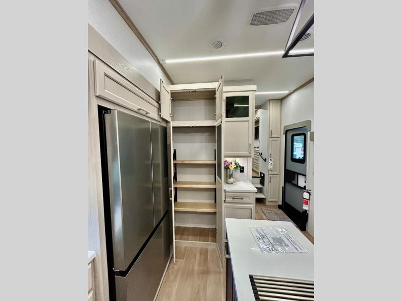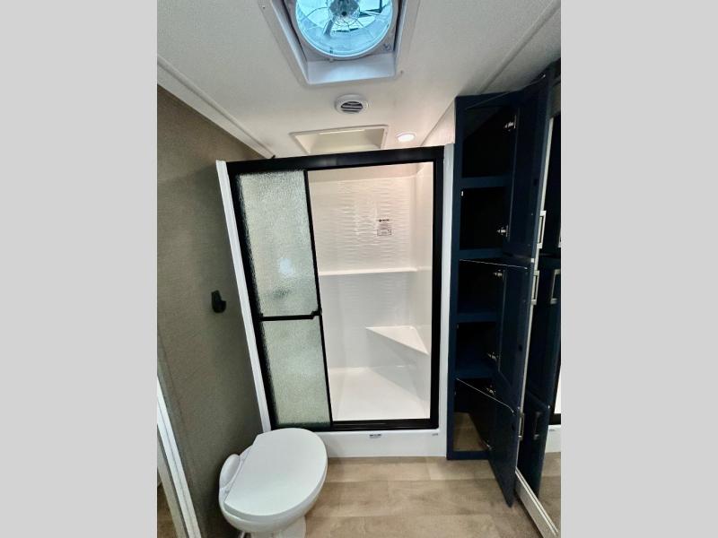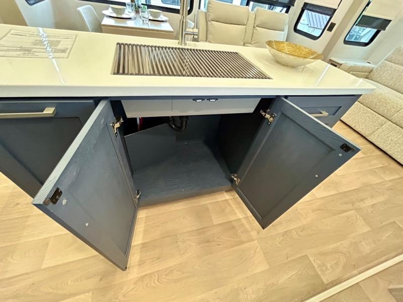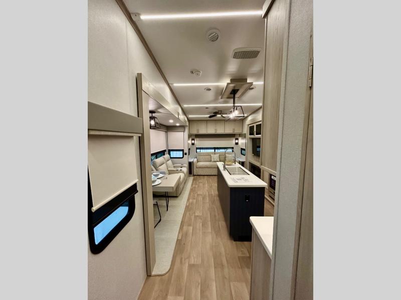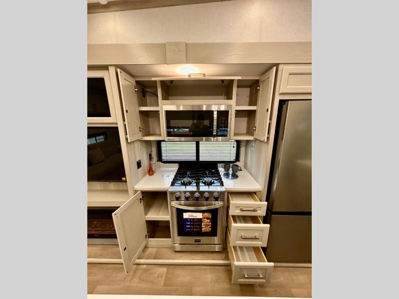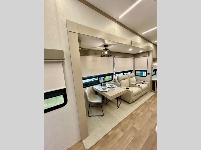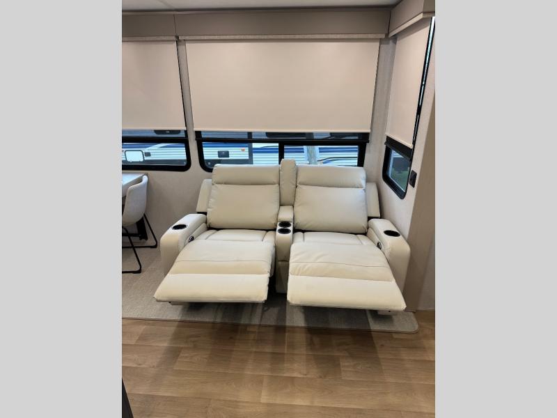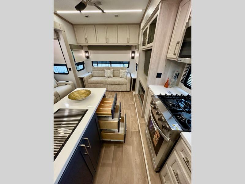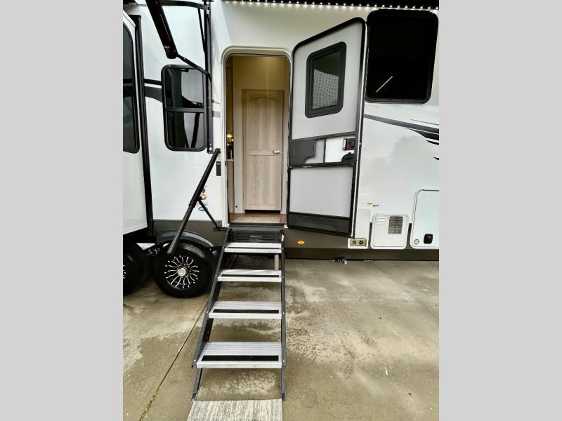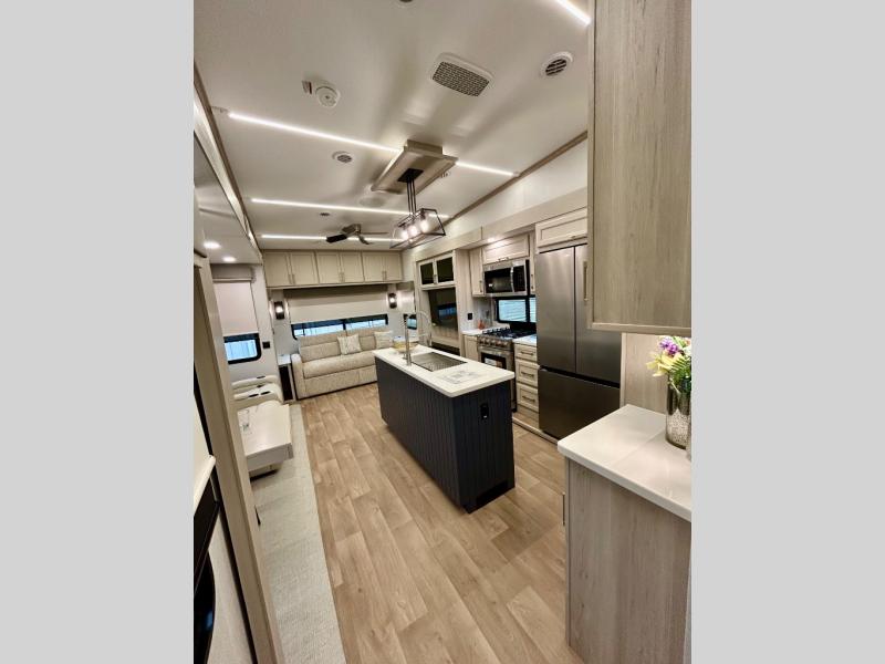 Everyone will stay clean with a bath and a half in this fifth wheel! The kitchen has a pantry big enough for everyone's favorite snacks, a gas cooktop, and a kitchen island to prepare your best meals. You can have game night indoors at the table and chairs or set up a table and chairs underneath the two power awnings. The rear living area offers a comfortable place to watch the big game too with a sofa/sleeper and theater seating directly across from the entertainment center with a 50" Smart TV and fireplace. Two can get ready at once in the front bathroom featuring a vanity with dual sinks, and since there is washer and dryer prep, you have the option to make wash day easier!